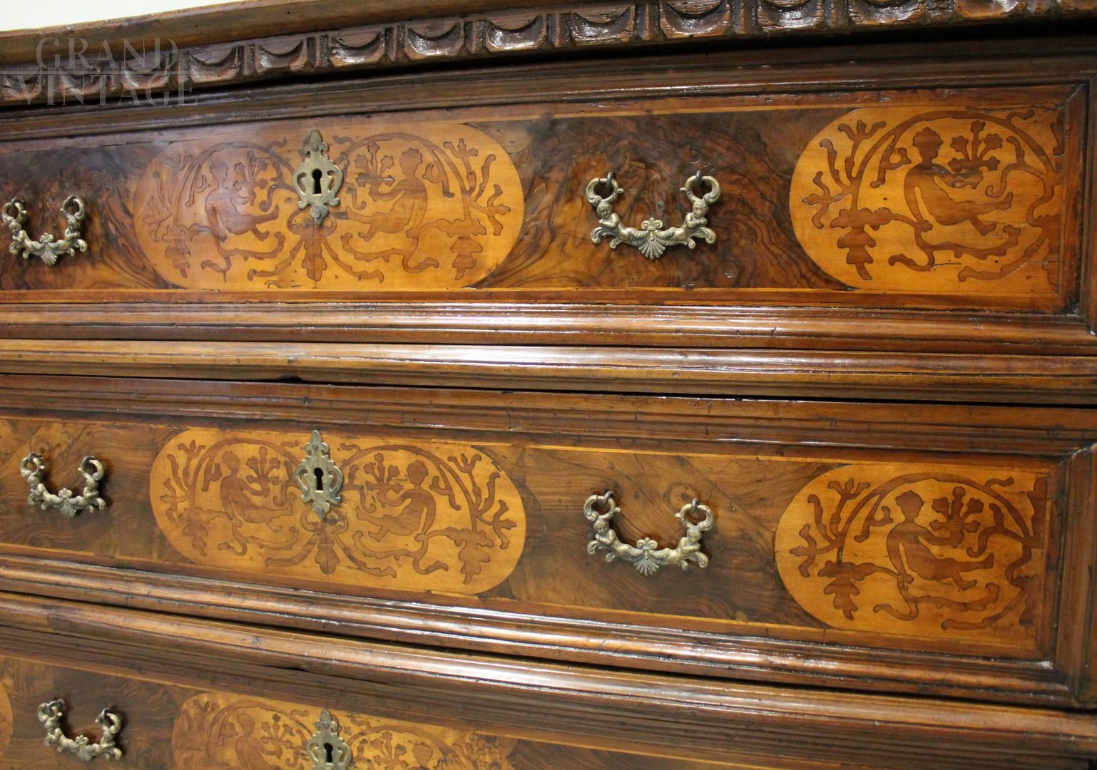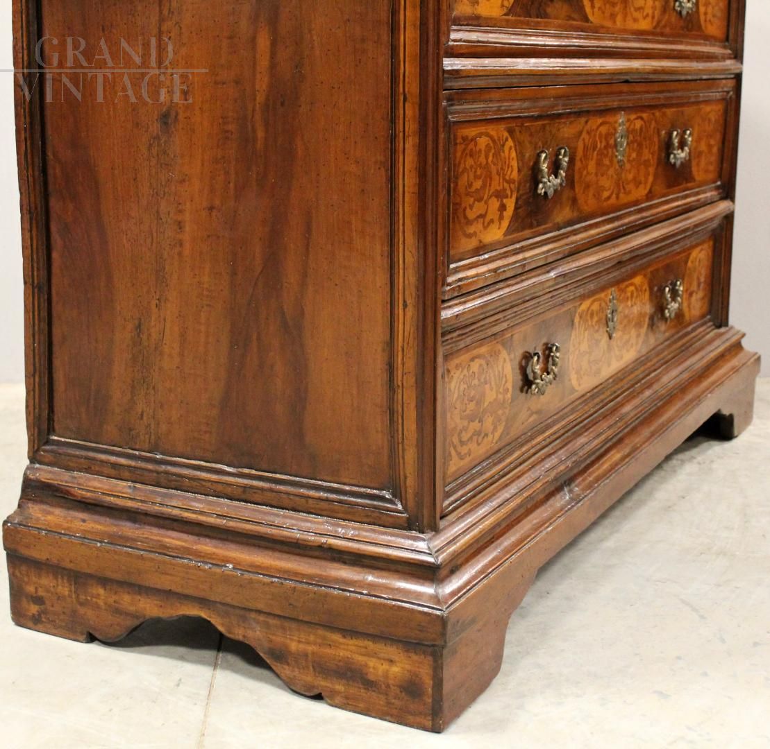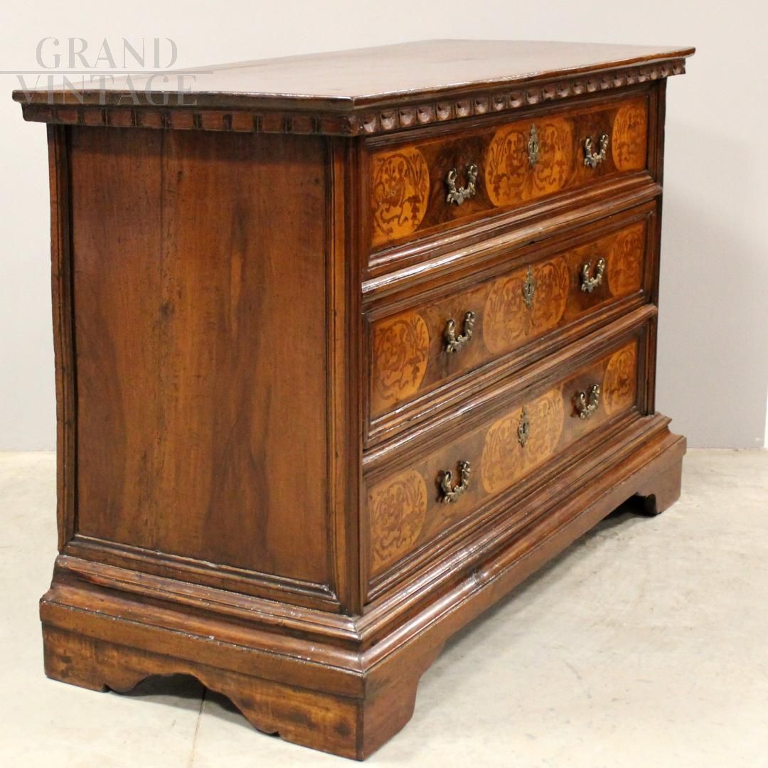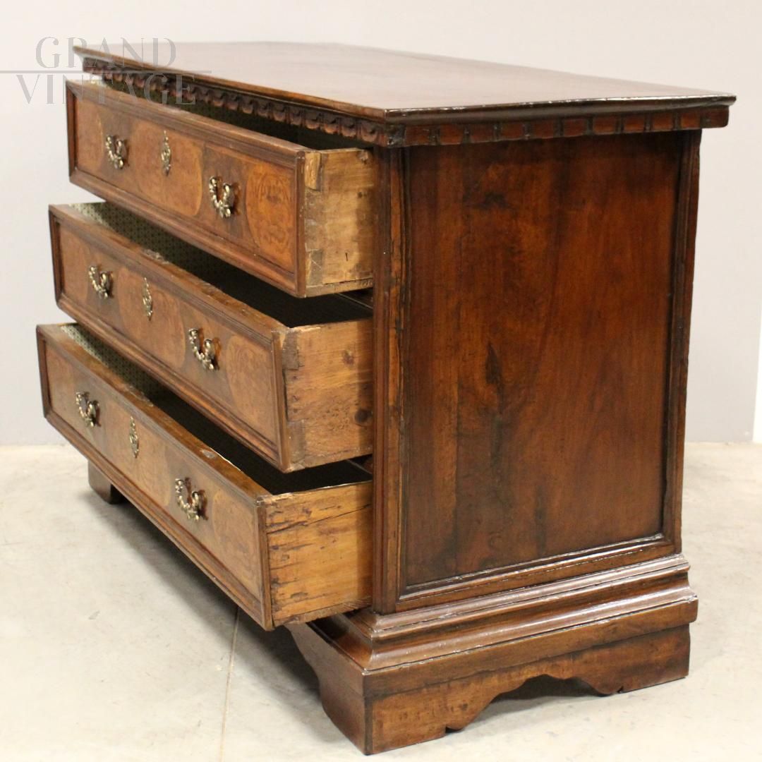 Antique chest of drawers from the early 18th century inlaid and threaded, with three drawers, in walnut and walnut briar, of Italian origin, restored and complete with Certificate of Authenticity. Over the years it has undergone restorations, in which the locks and the feet with relative frame have also been replaced.