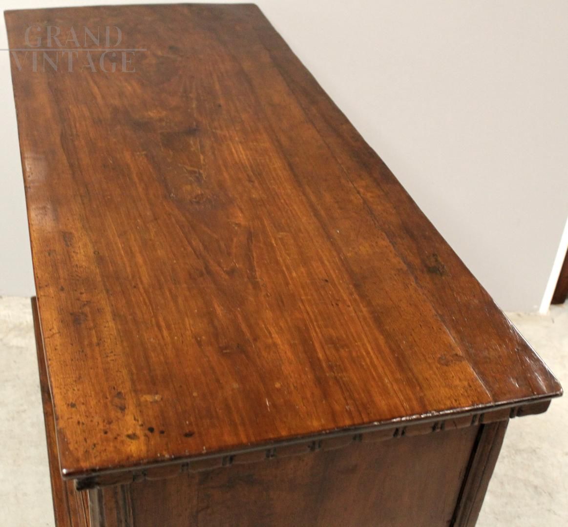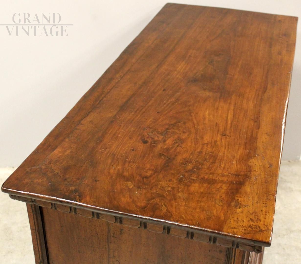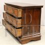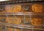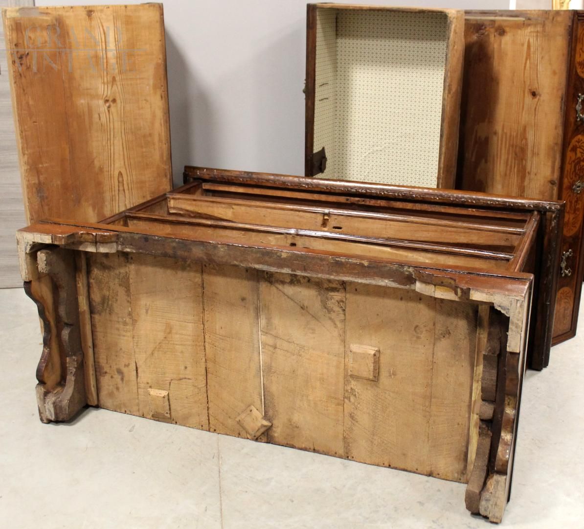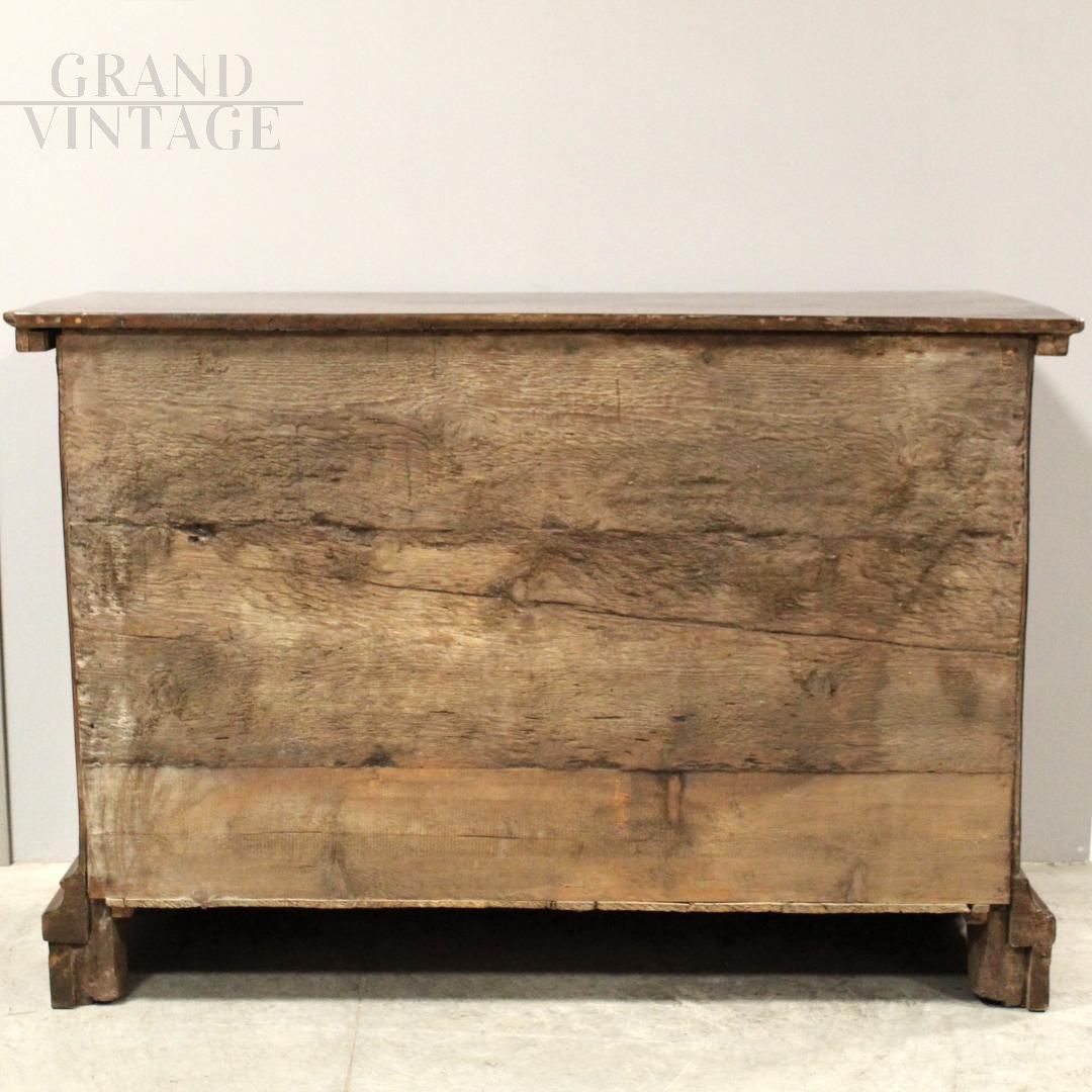 Antique chest of drawers from the early 18th century inlaid and threaded, with three drawers, in walnut and walnut briar, of Italian origin, restored and complete with Certificate of Authenticity. Over the years it has undergone restorations, in which the locks and the feet with relative frame have also been replaced.