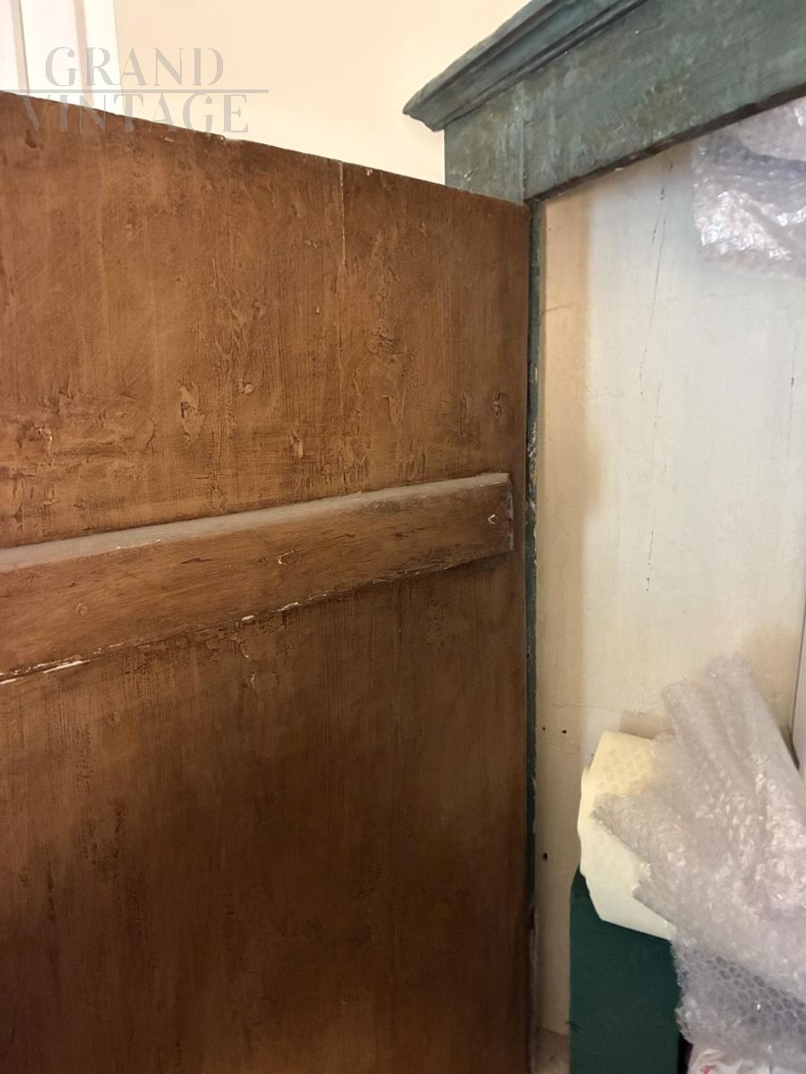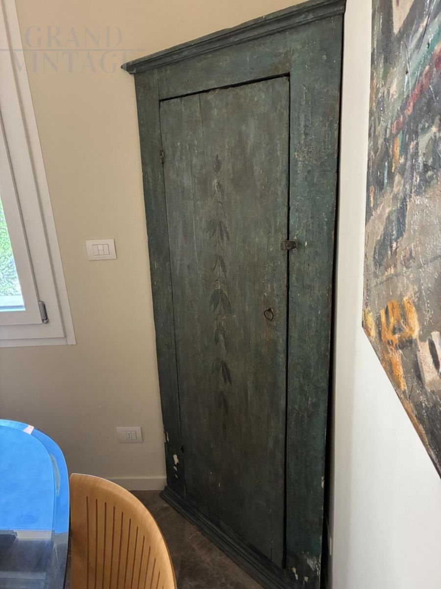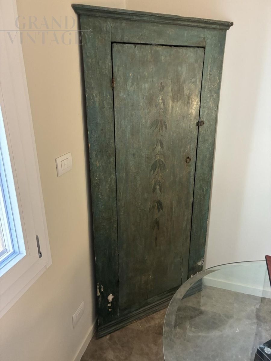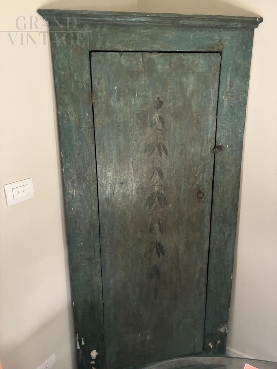 Antique Italian Pisan rustic corner cabinet from the 17th century, completely original, in oak wood, painted green with a floral motif on the door. On one frame there are some chippings from time. Purchased after the Second World War from Florentine antique dealers.