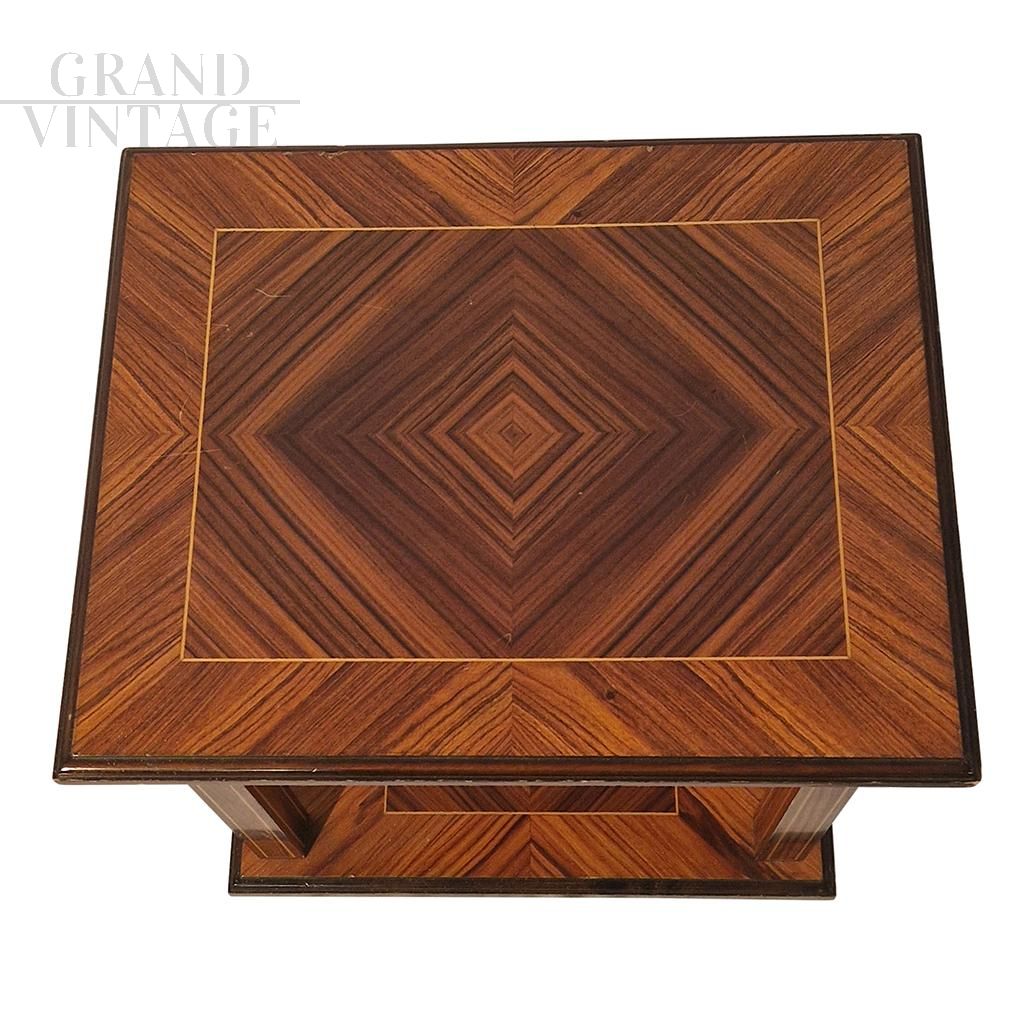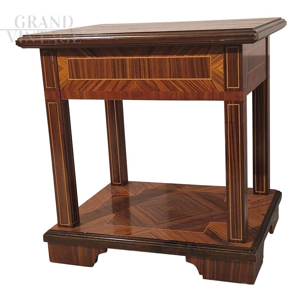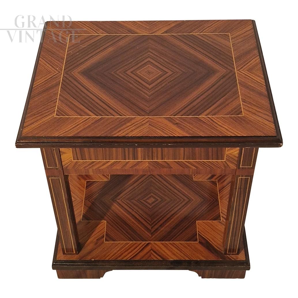 Antique side table or bedside table in antique Lombard style, made of walnut with maple thread and geometric inlays in walnut, bois de rose and ebonized wood.