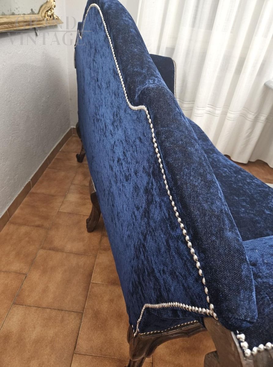 Antique Italian Piedmontese sofa from the early 19th century from the Louis XIV era, in carved wood, padded and covered with elegant blue velvet. Completely restored.