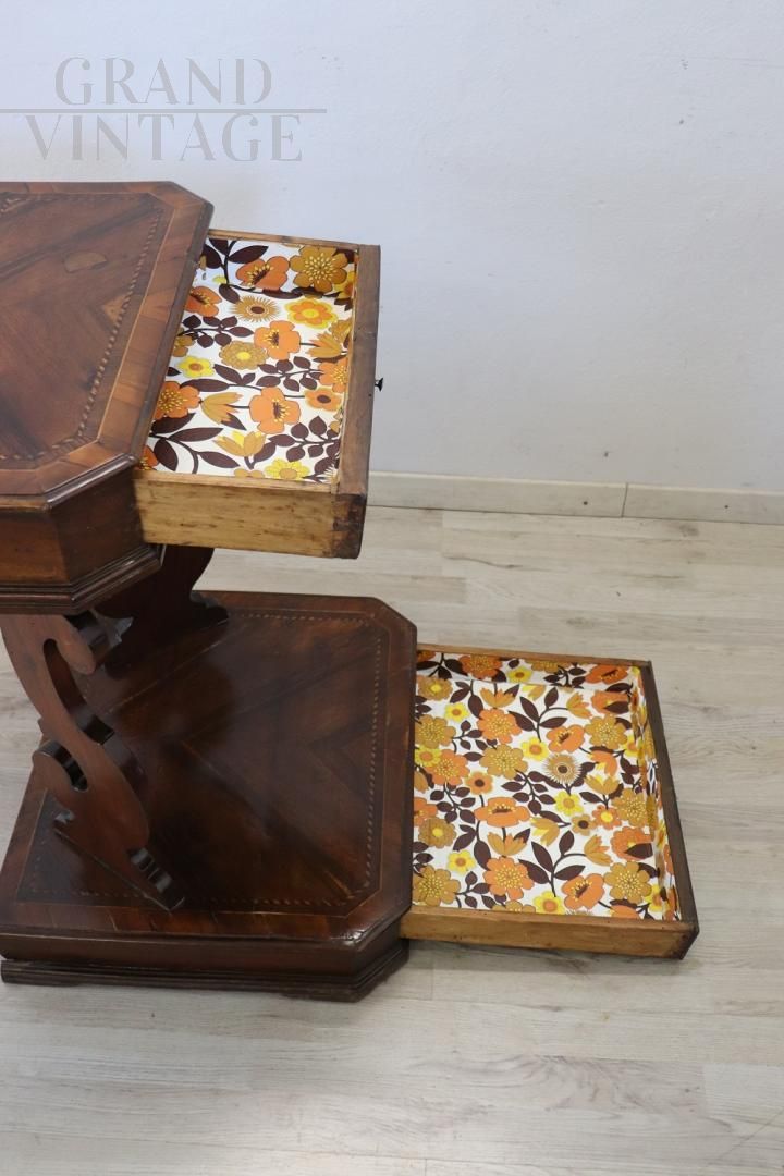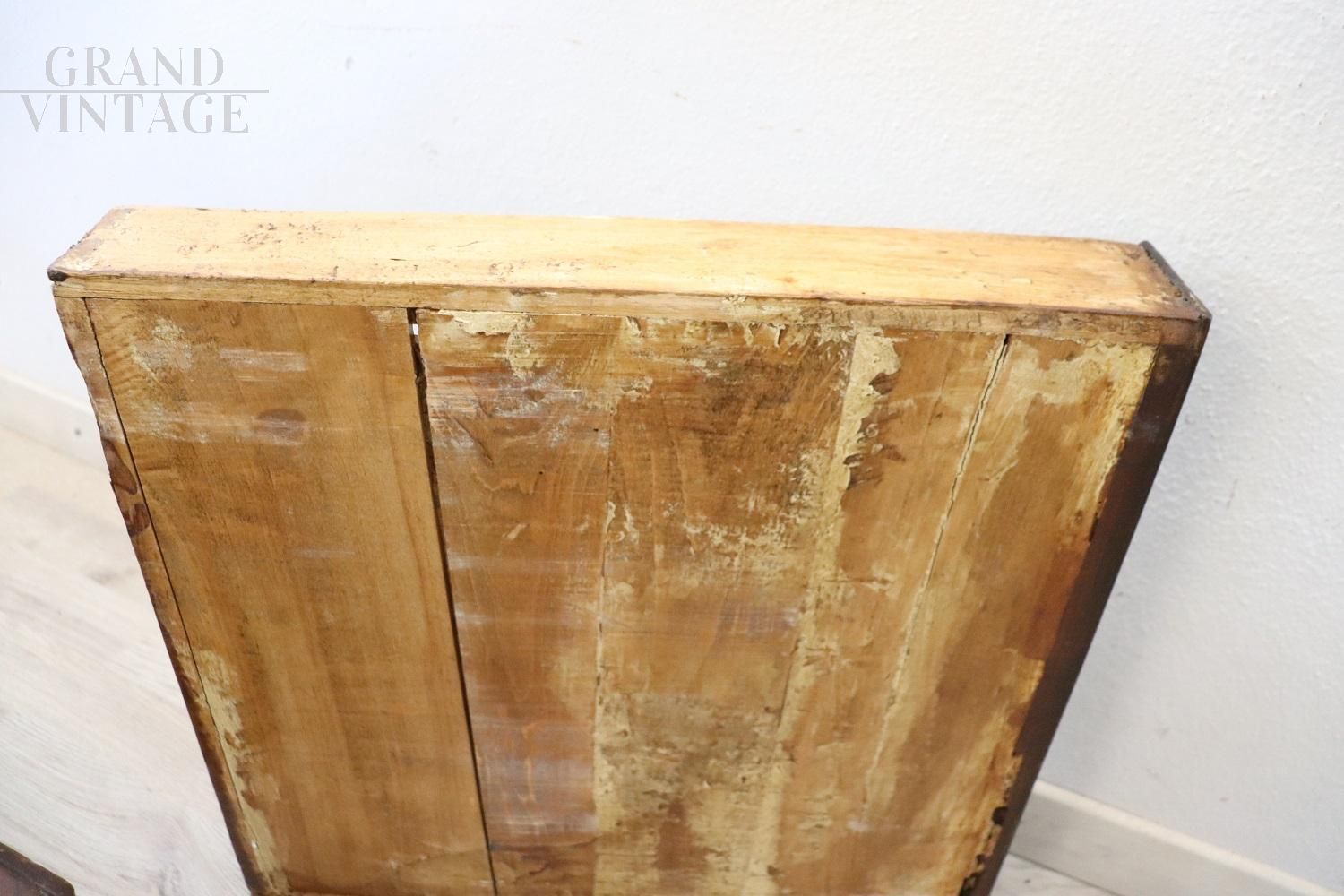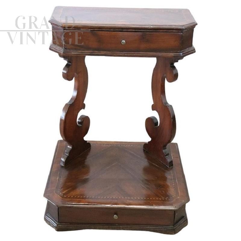 Rare and precious antique kneeler dating back to the last decades of the 18th century, made of walnut wood with a delicate geometric inlay decoration, with characteristic curled uprights, equipped with two practical drawers, one in the upper part and one in the lower part . This beautiful antique furniture finds easy placement due to its small size and can be used for your daily prayers, as a bedside table or coffee table or simply as a particular piece of furniture. Excellent condition, excellent negotiable price.