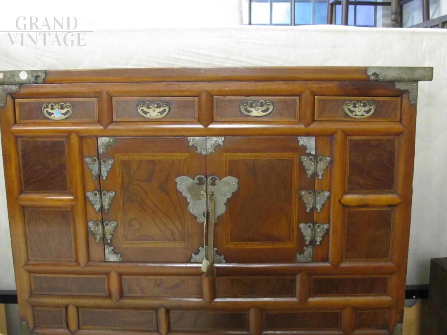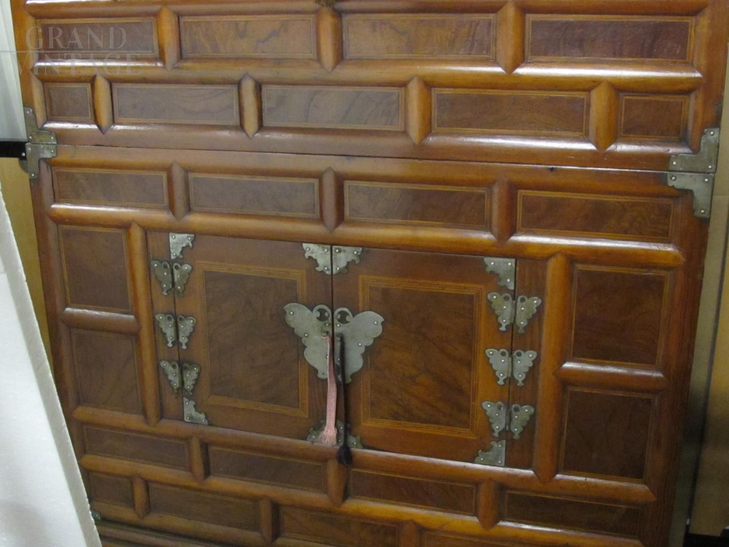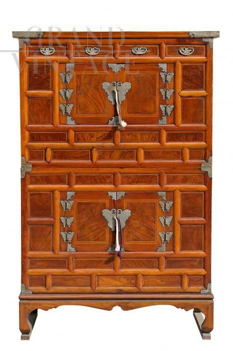 Antique Korean mobile wardrobe from the end of the 19th century with double body in persimmon briar and cypress.
