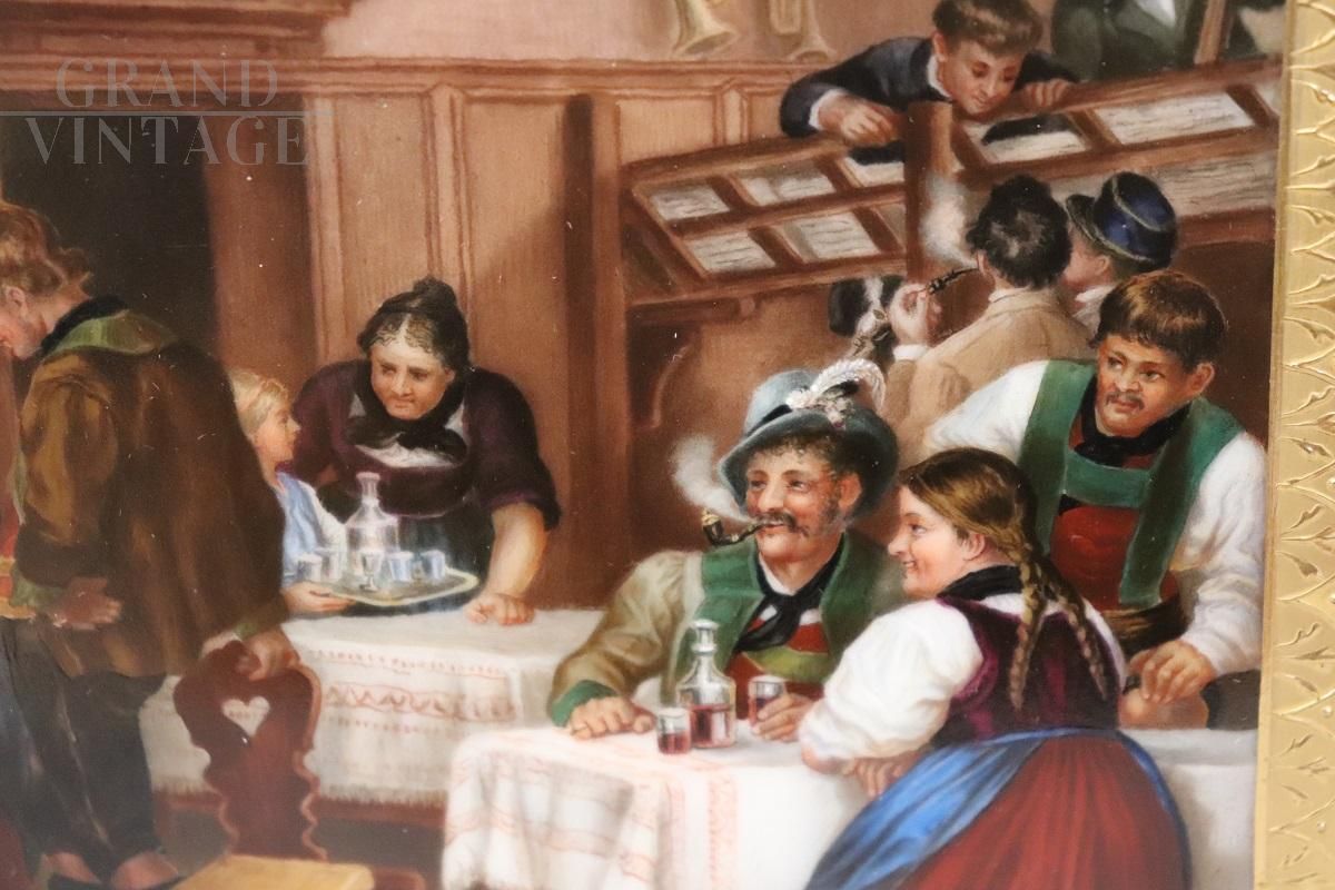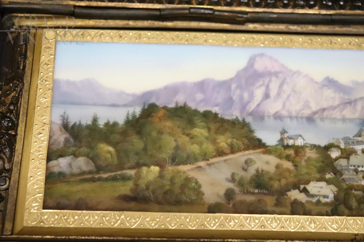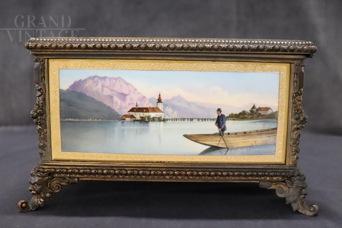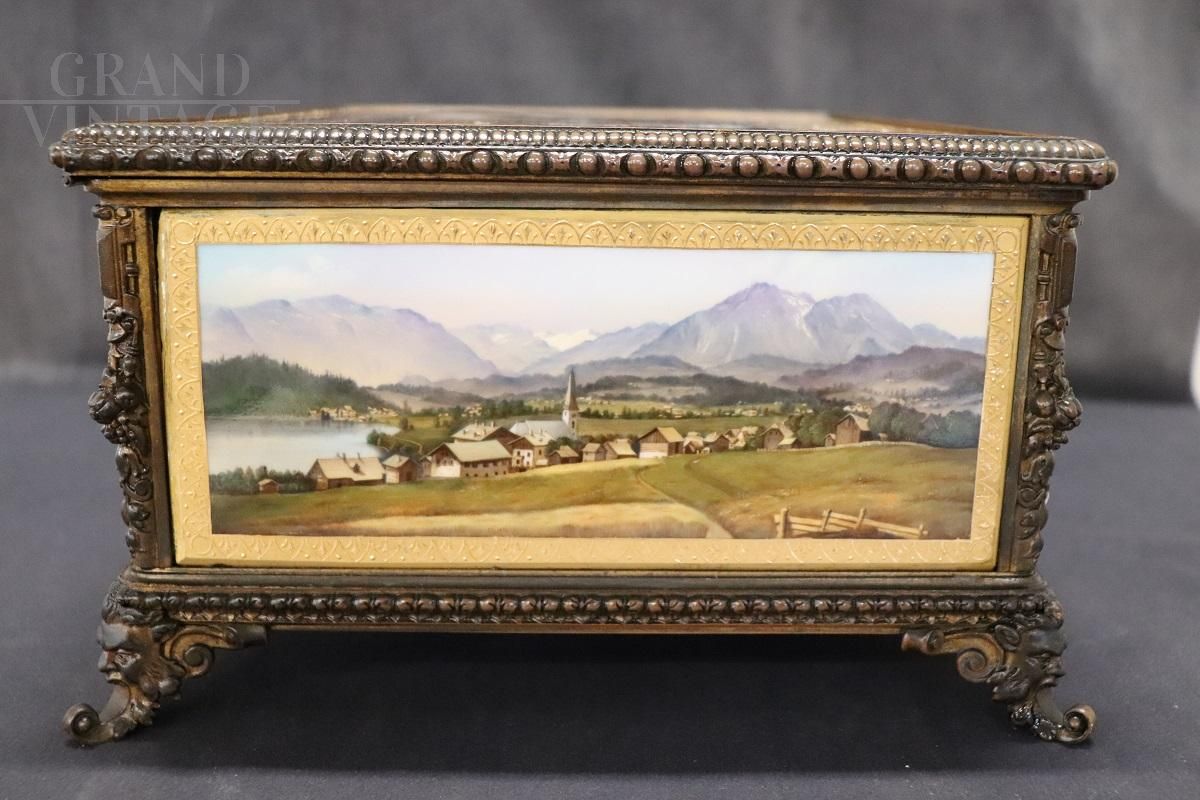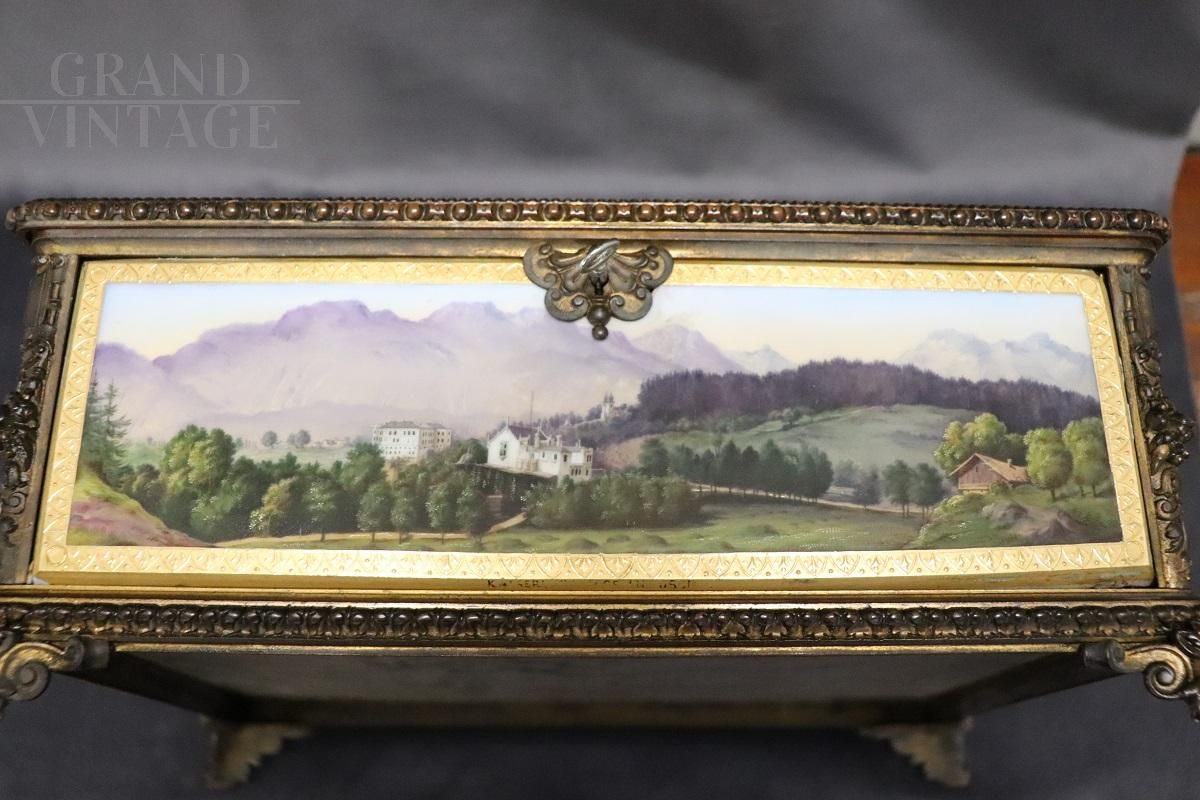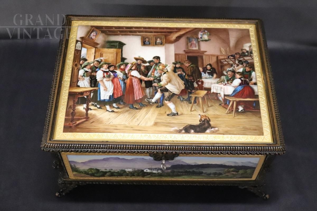 This finely decorated antique rectangular jewelery box, produced by the German porcelain manufacturer KPM, around 1870, is truly rare. The KPM brand is engraved on the inside. Made with a finely chiseled bronze structure that has acquired a beautiful antique patina. Each side of this jewelry box is a true work of art with hand-painted porcelain. On the lid we find an animated scene inside a tavern with many characters, the scene is taken from a painting by the German artist Franz Von Defregger "Ball auf der Alm". Each side is finely hand-painted with beautiful Austrian landscapes, under which an inscription identifies the location. This casket is a perfect example of the high artistic quality achieved by the KPM porcelain manufacturer.