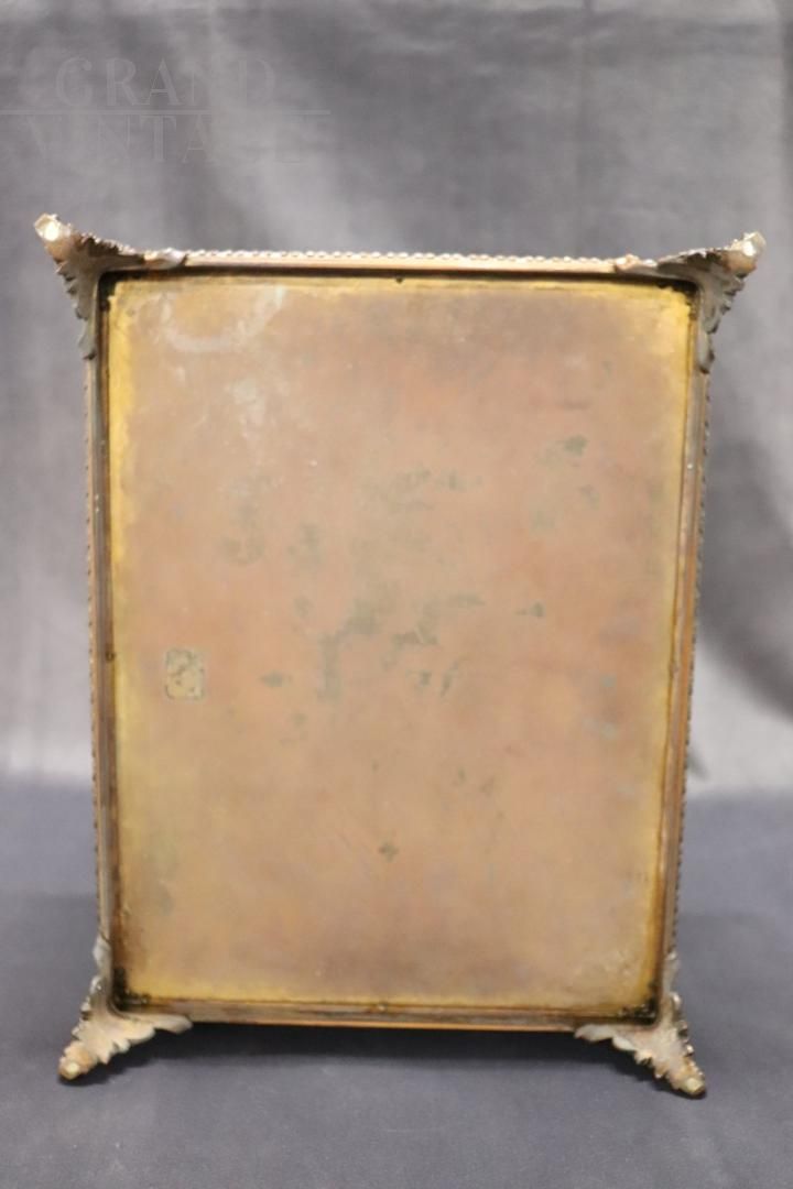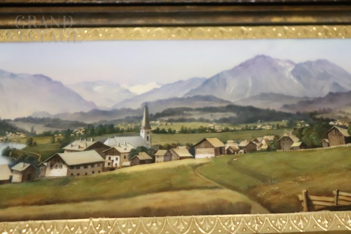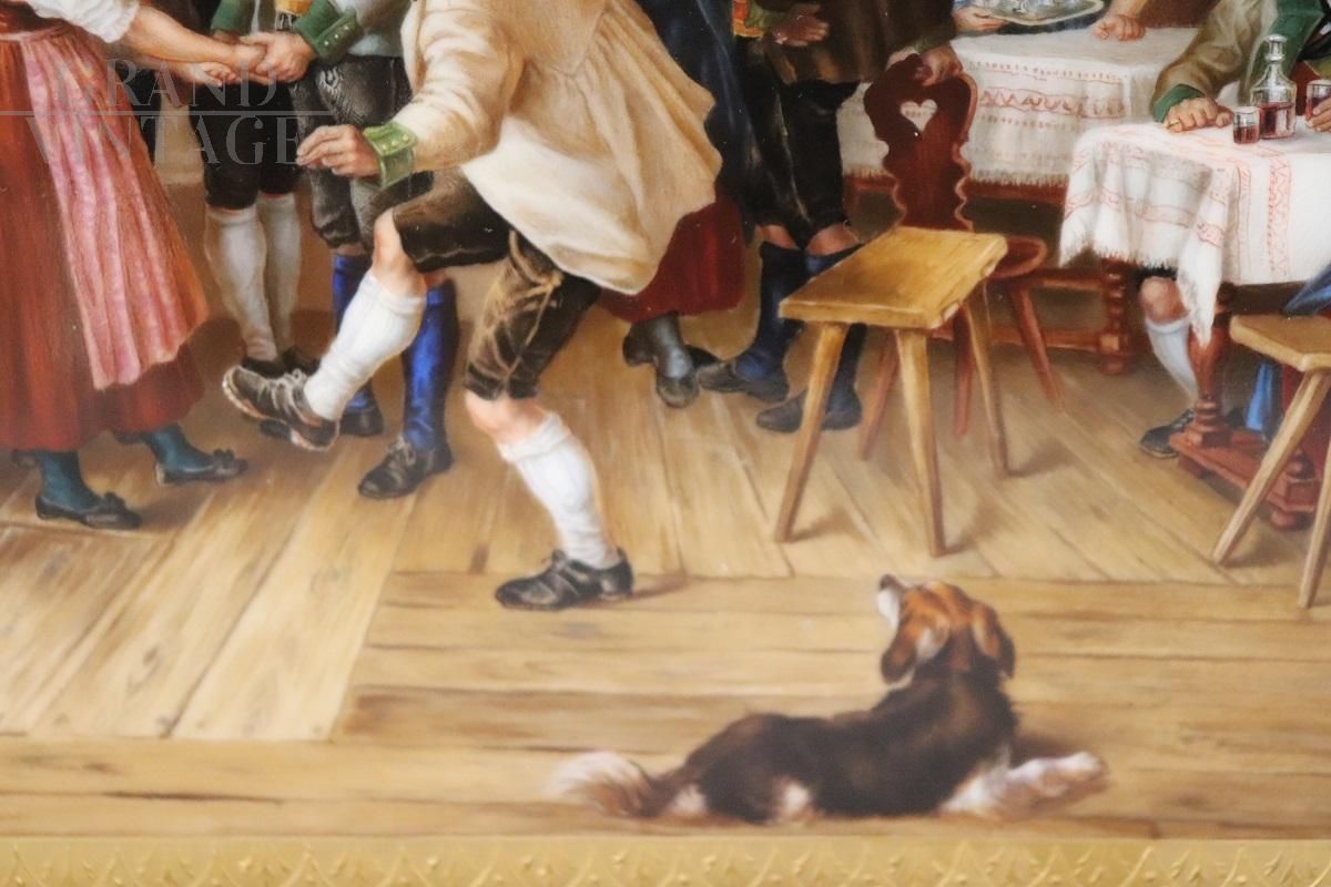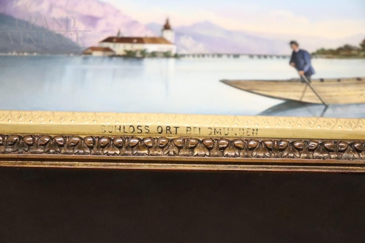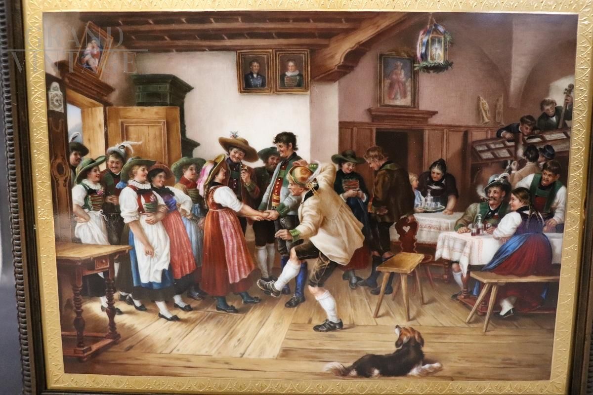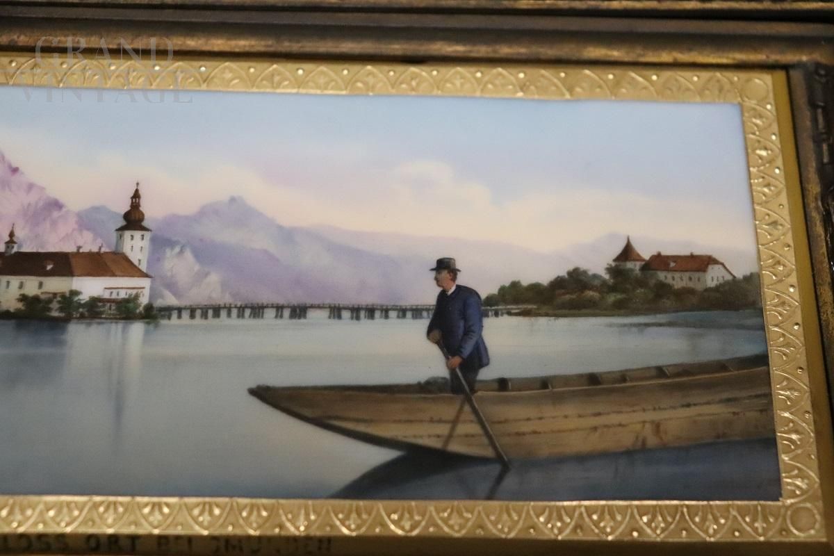 This finely decorated antique rectangular jewelery box, produced by the German porcelain manufacturer KPM, around 1870, is truly rare. The KPM brand is engraved on the inside. Made with a finely chiseled bronze structure that has acquired a beautiful antique patina. Each side of this jewelry box is a true work of art with hand-painted porcelain. On the lid we find an animated scene inside a tavern with many characters, the scene is taken from a painting by the German artist Franz Von Defregger "Ball auf der Alm". Each side is finely hand-painted with beautiful Austrian landscapes, under which an inscription identifies the location. This casket is a perfect example of the high artistic quality achieved by the KPM porcelain manufacturer.