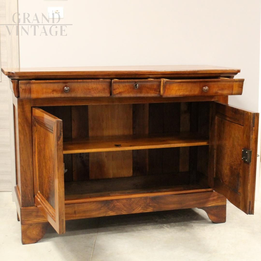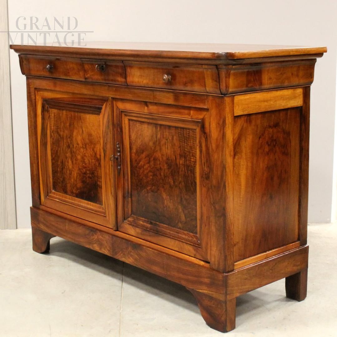 Antique large Louis Philippe era Capuchin sideboard in walnut with two doors and three drawers, from the mid-19th century, restored.