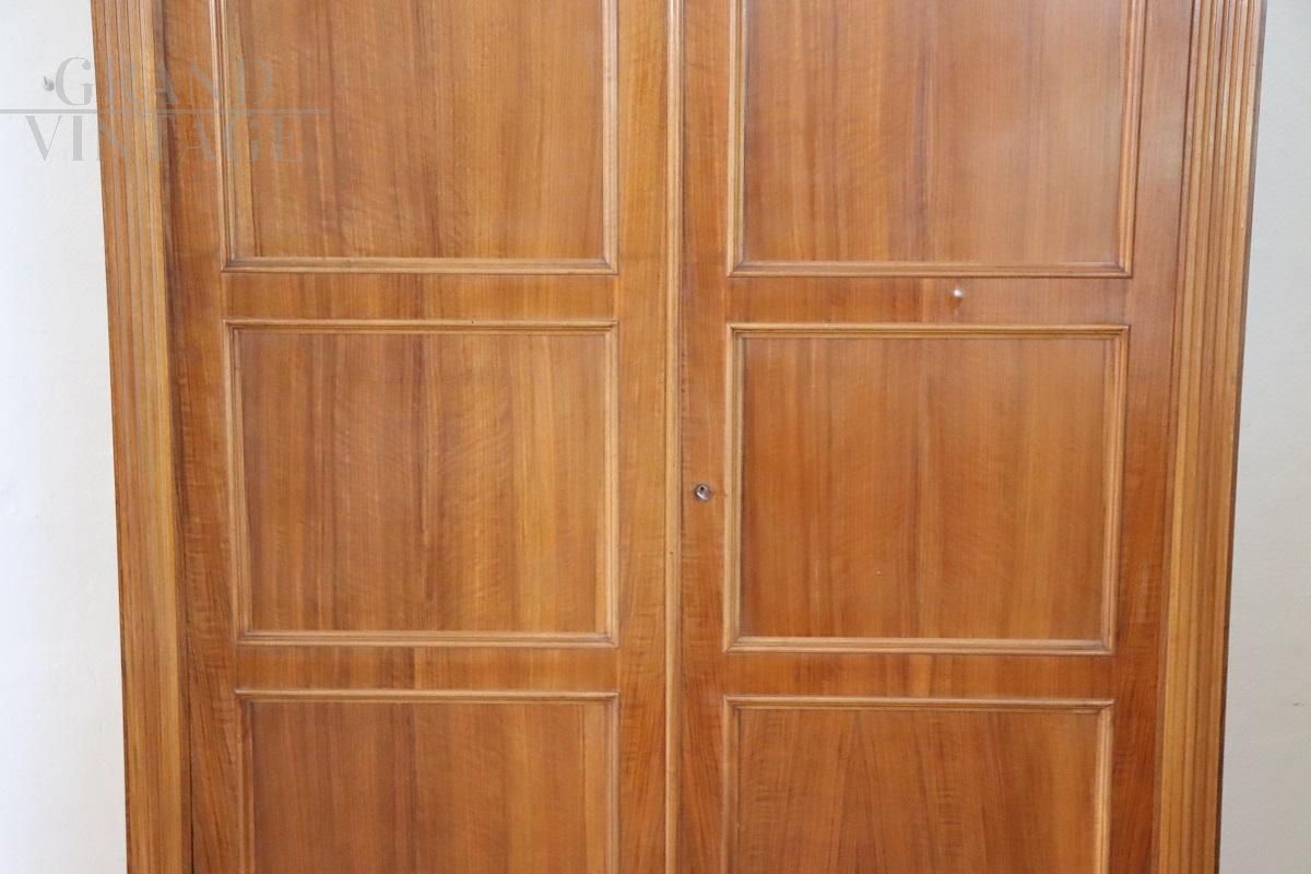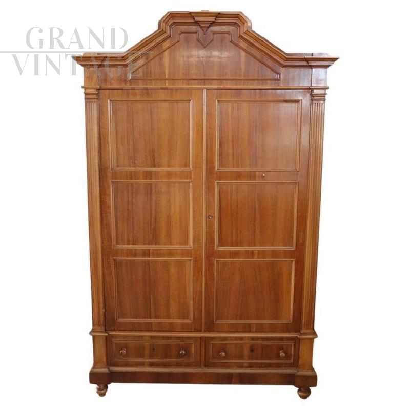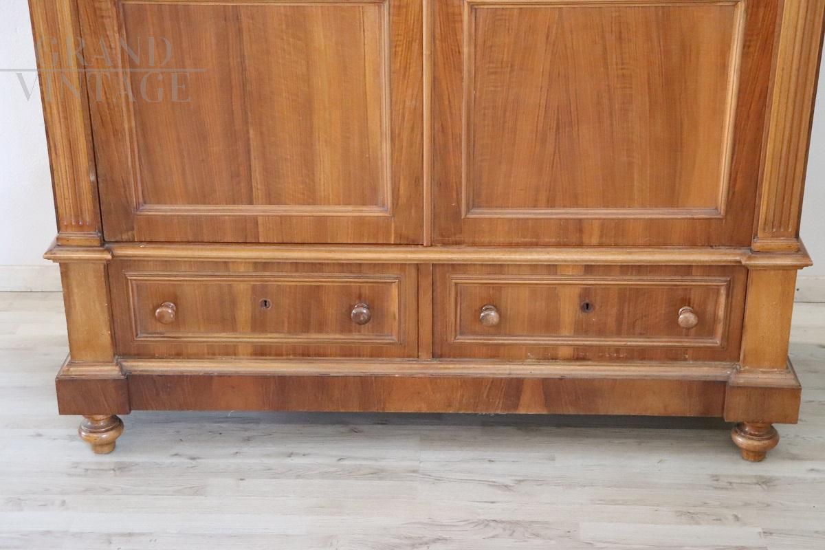 Antique Italian two-door wardrobe in solid wood with walnut veneer, made at the end of the 19th century. Very particular wardrobe characterized by a slender hat with a geometric line frame. Equipped with two doors, the interior is equipped with a rod for hanging clothes, in the lower part it has two comfortable drawers. Possibility to change the interior according to your needs. Very simple and linear wardrobe in light walnut colour, also perfect for a modern environment. The wardrobe will be shipped disassembled to facilitate transport. Excellent negotiable price.