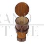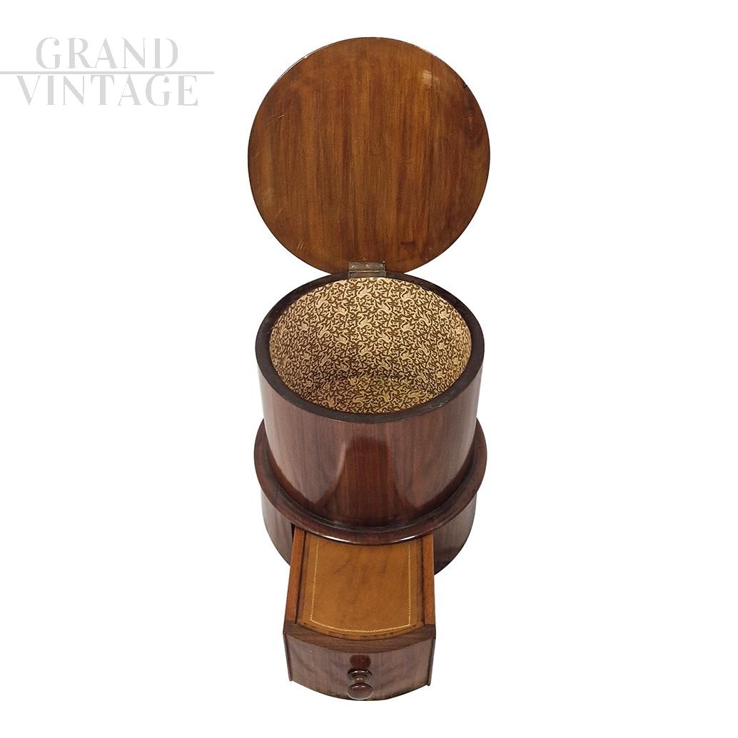 Antique wooden column storage stool, with folding top and a small drawer in the lower part, the interior is covered in paper with a floral motif.