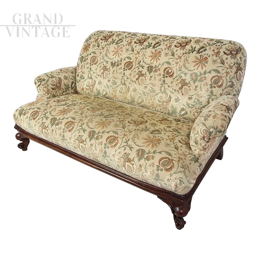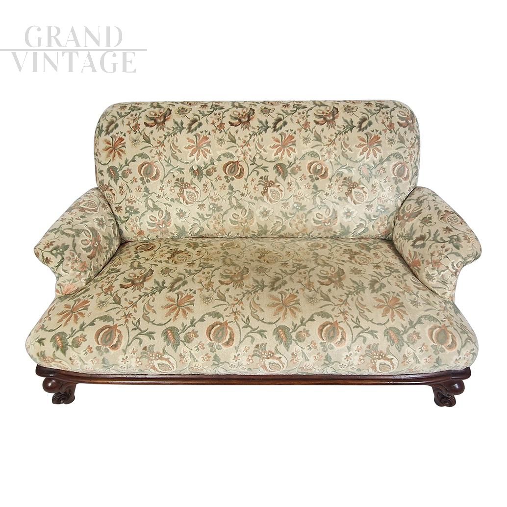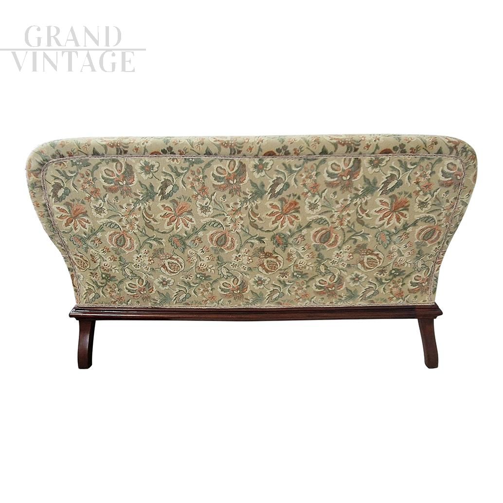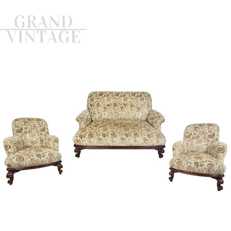 Antique style living room set composed of a three-seater sofa and two armchairs with a padded wooden structure covered with damask fabric.