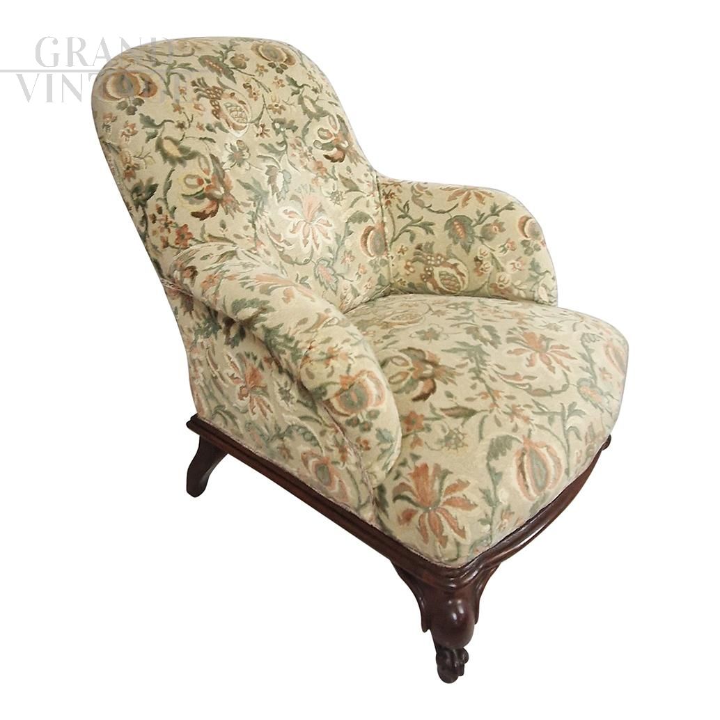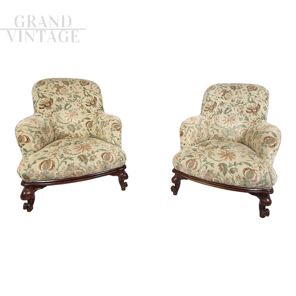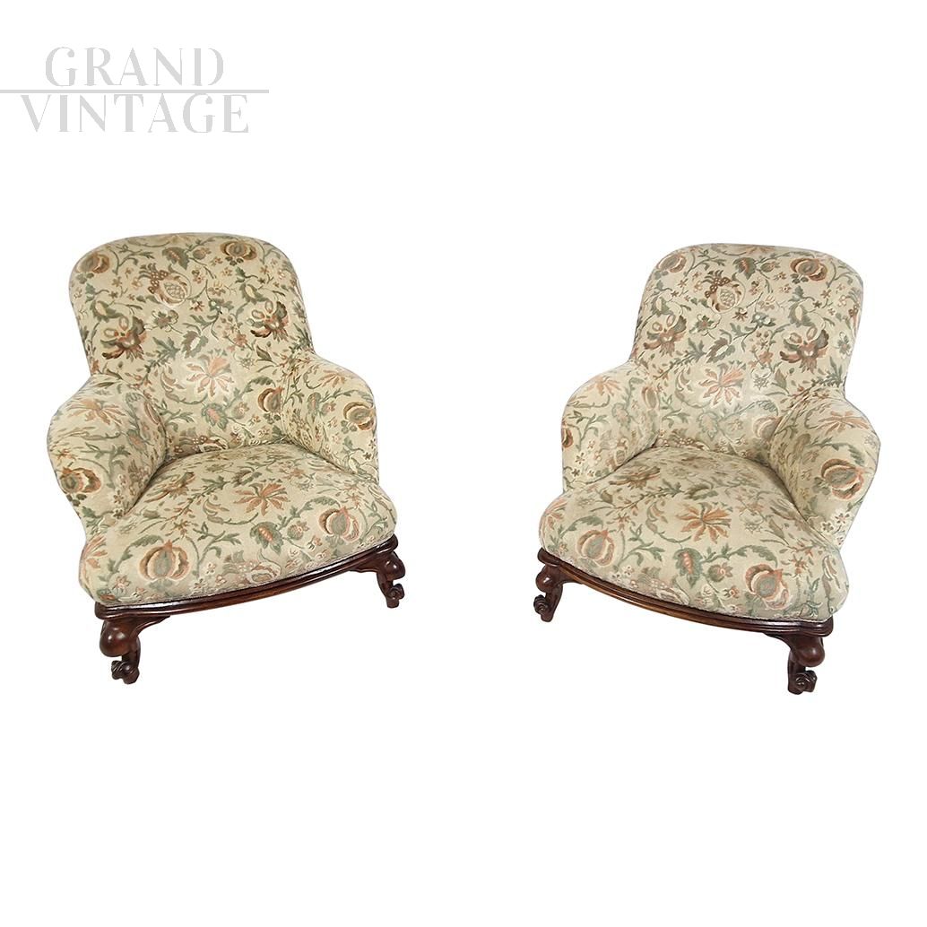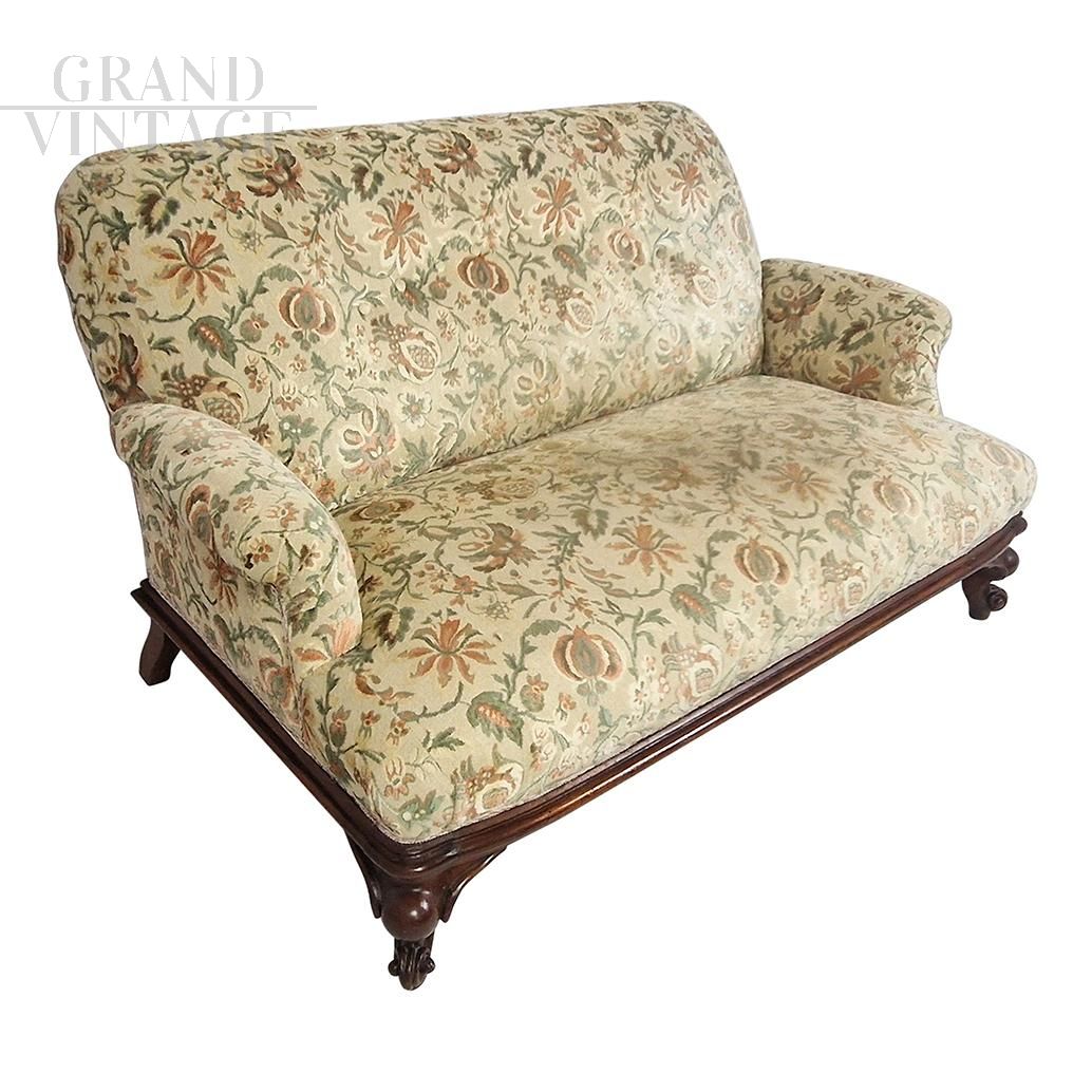 Antique style living room set composed of a three-seater sofa and two armchairs with a padded wooden structure covered with damask fabric.