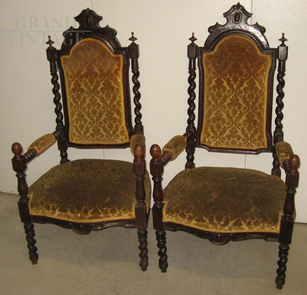Sofa and two antique armchairs, late 1800s early 1900s. Seventeenth-century style, model with twists and carvings. The living room is in patina, NOT RESTORED. Needs restoration for use.