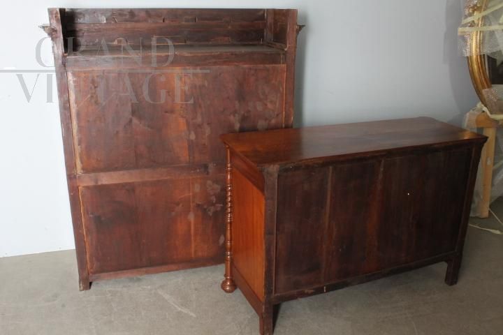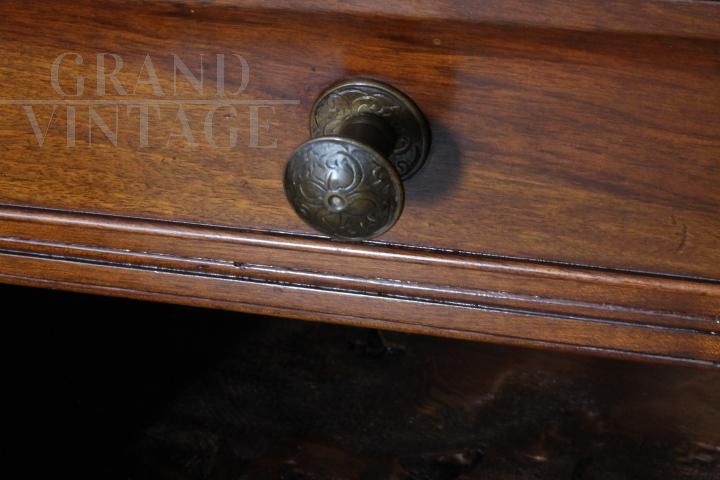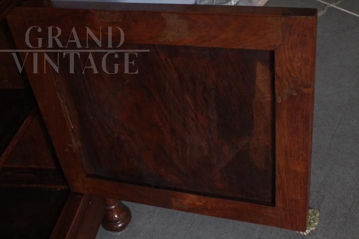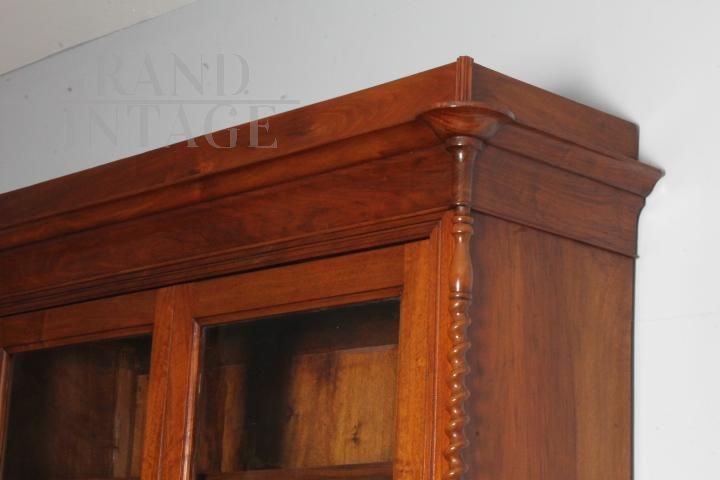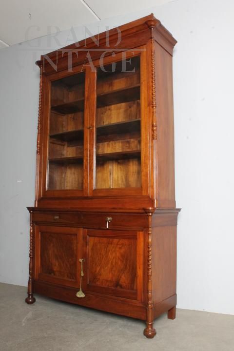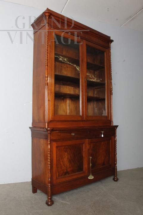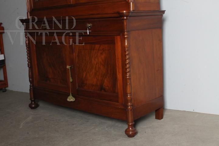Antique Lombard Charles X bookcase in walnut with blown glass doors
