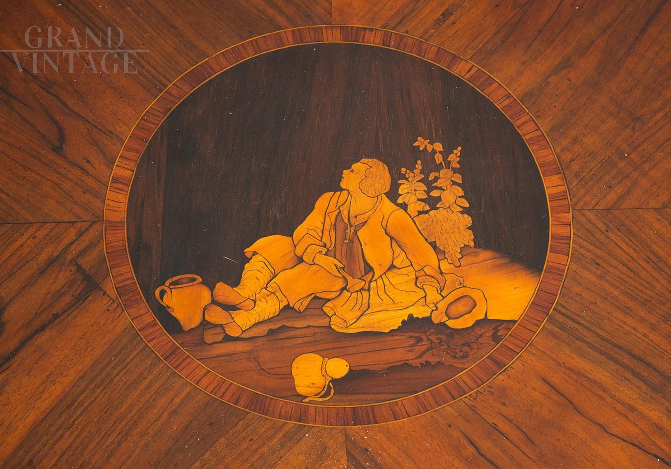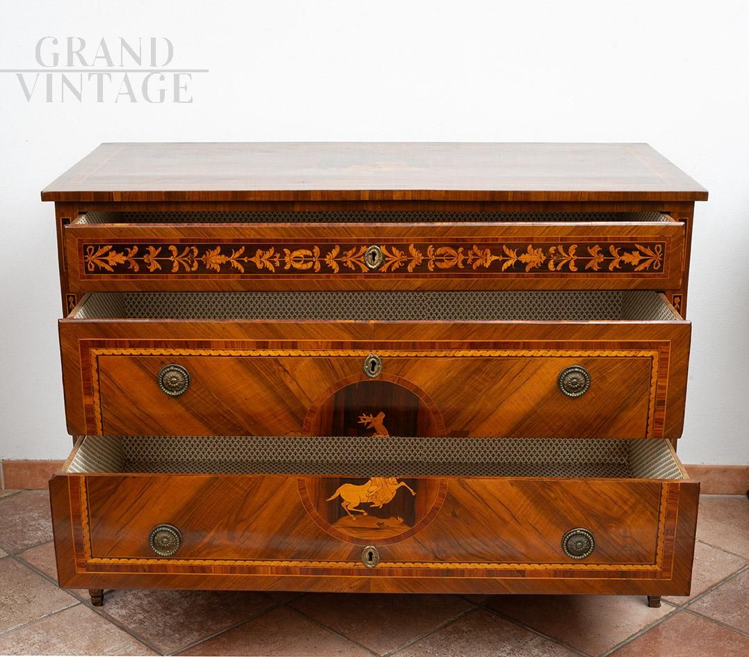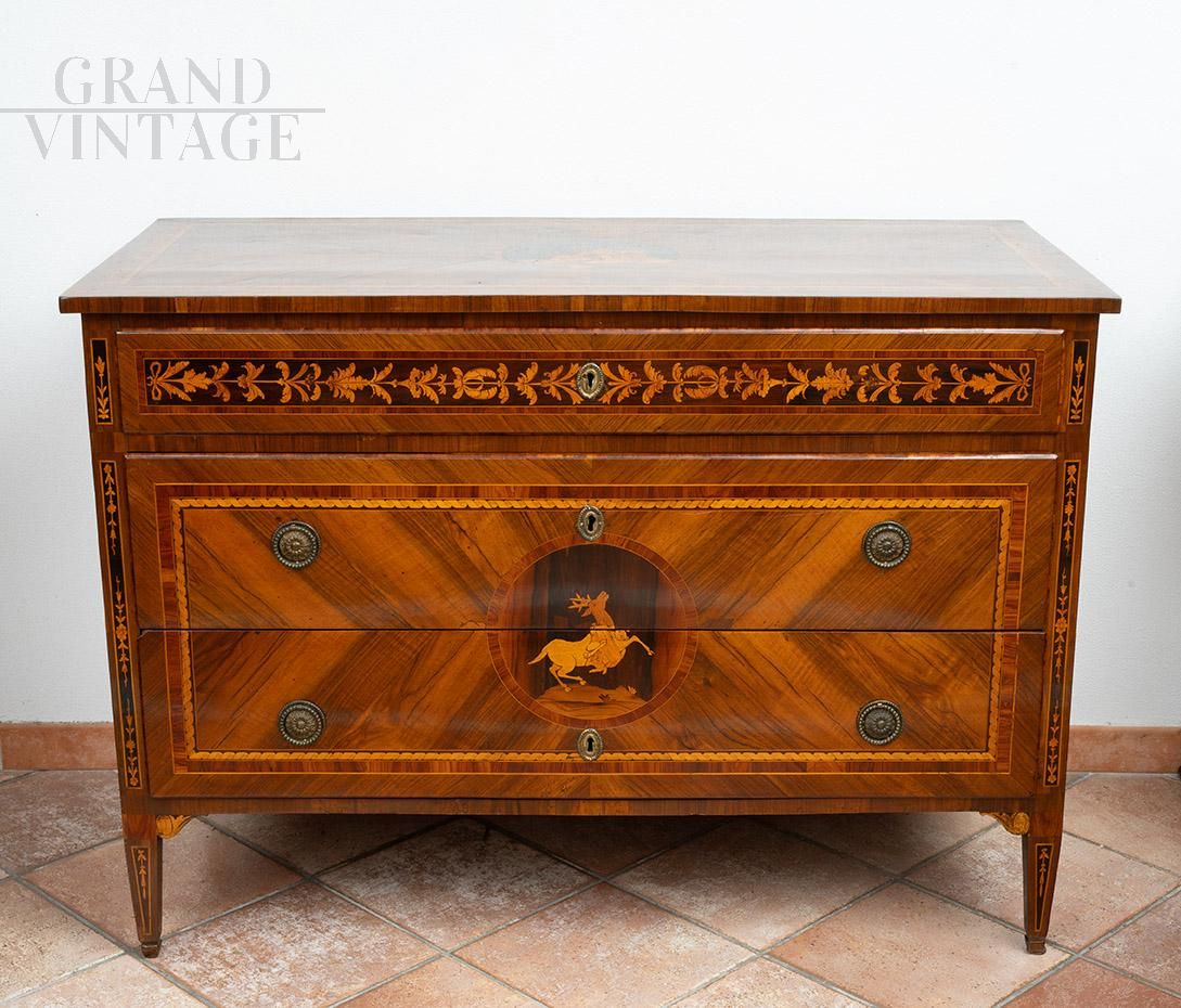 Antique Louis XVI chest of drawers in walnut briar with inlays in precious exotic woods. The front is characterized by two large drawers with a deer figure in the center and a smaller one under the top embellished with a floral inlay. On the sides of the cabinet, inside geometric frames, a dove figure is depicted while on the top, a shepherd figure is depicted. The tapered and slightly flared feet (in the shape of an inverted pyramid) are also decorated with fillets and inlaid details. The corners and edges of the cabinet are enriched with geometric and vegetal decorative elements.