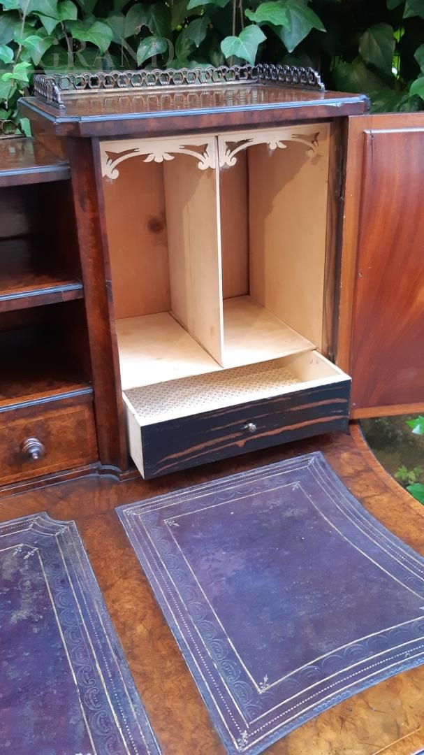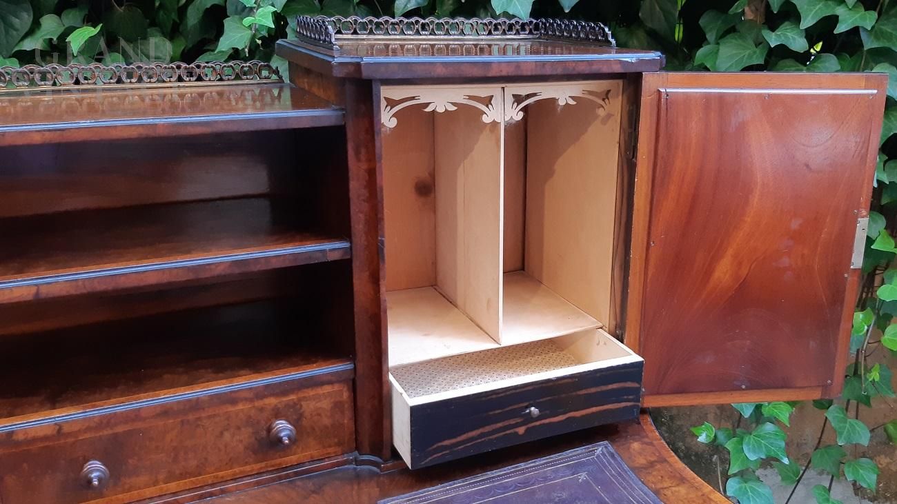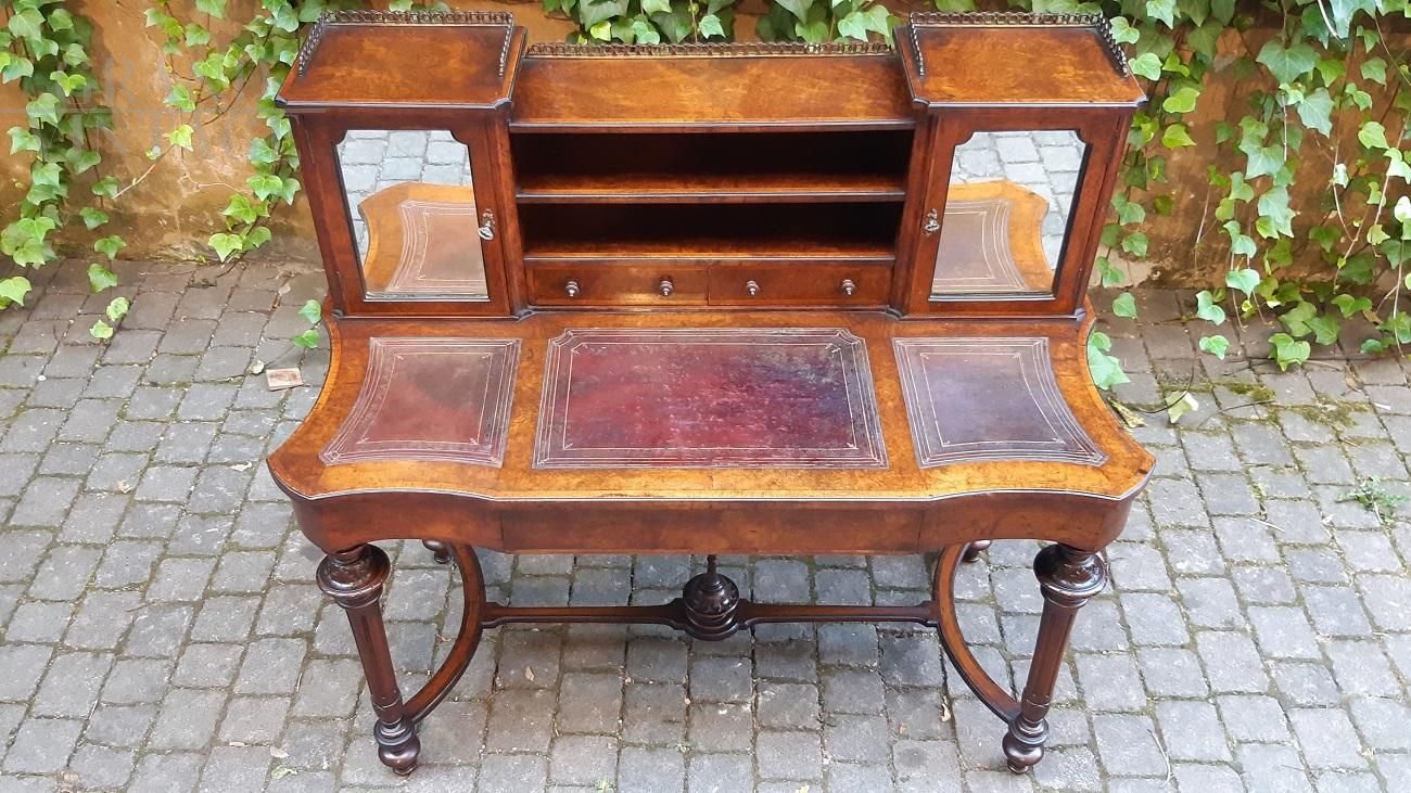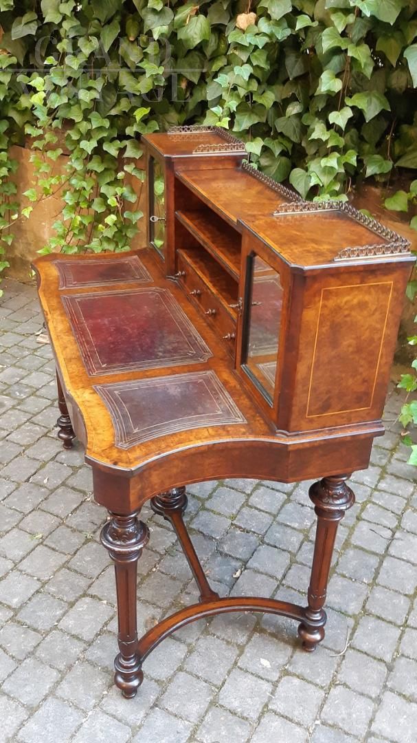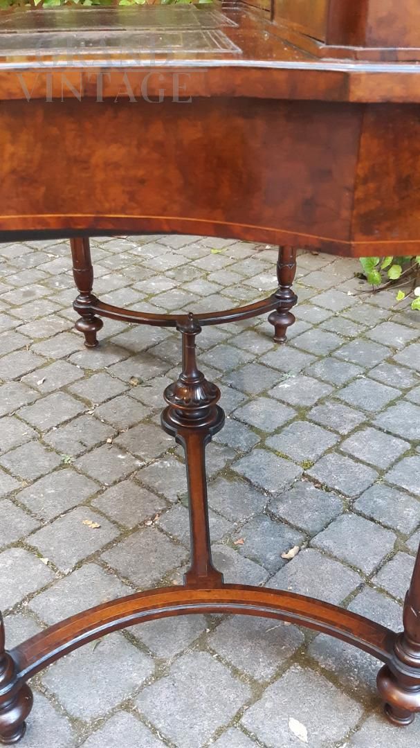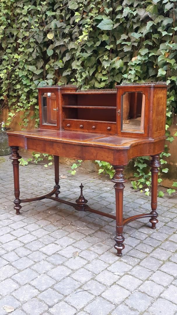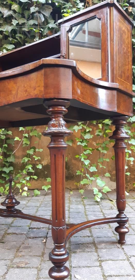Elegant antique Italian Lombard ladies' desk from the Napoleon III period (1852/70), designed and created with the aim of satisfying the most demanding requests. This set of movements is entirely veneered in walnut briar and threaded, from the base crossbar to the upper cabinet, in rooted cherry wood flanked by a second thread in maple wood. Further enrichments can be found in refined carvings on the bases and brass inserts, as object holders, typical of the style. Rare piece of furniture intact and recommended.