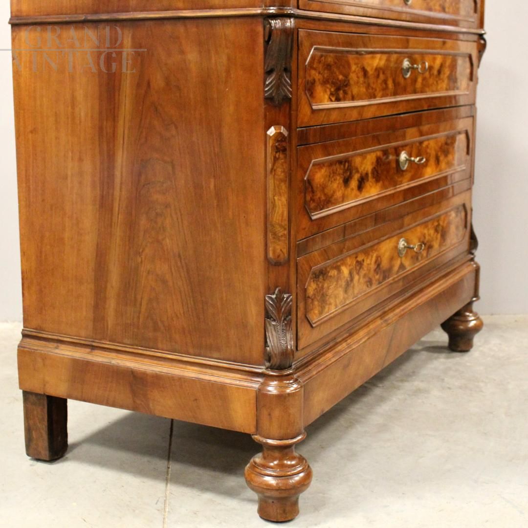 Antique Louis Philippe chest of drawers in walnut briar, 19th century Italy
