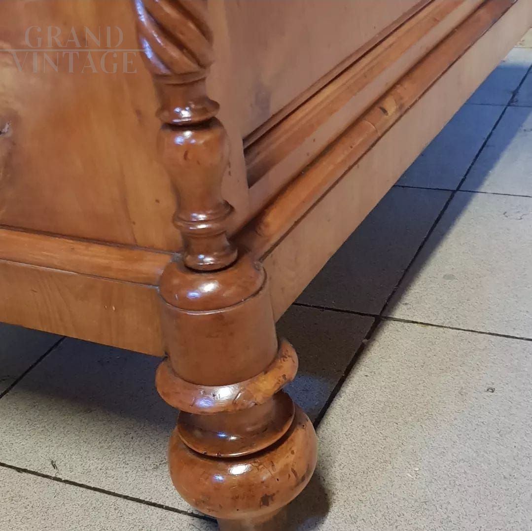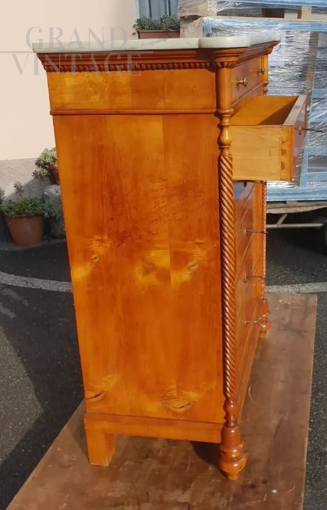 Antique Louis Philippe era tallboy dresser chest of drawers in solid cherry wood with twists and original white marble top, restored and polished by hand, Italy 1840 - 1860.