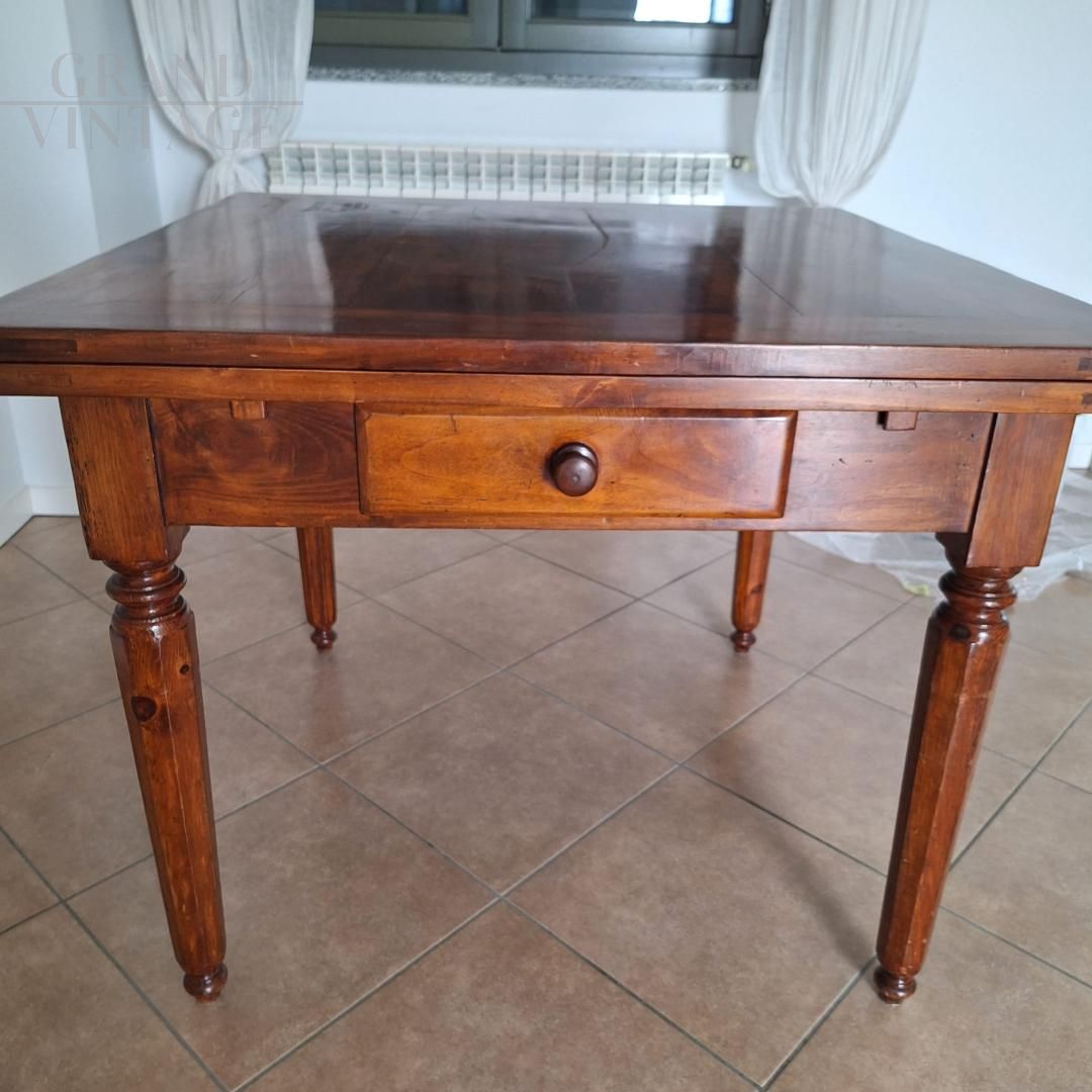 Antique Louis Philippe dining table with pull-out extension, featuring a paper-lined drawer, beautiful turned legs, and a top extendable from 100 to 200 cm. The depth is 100 cm.