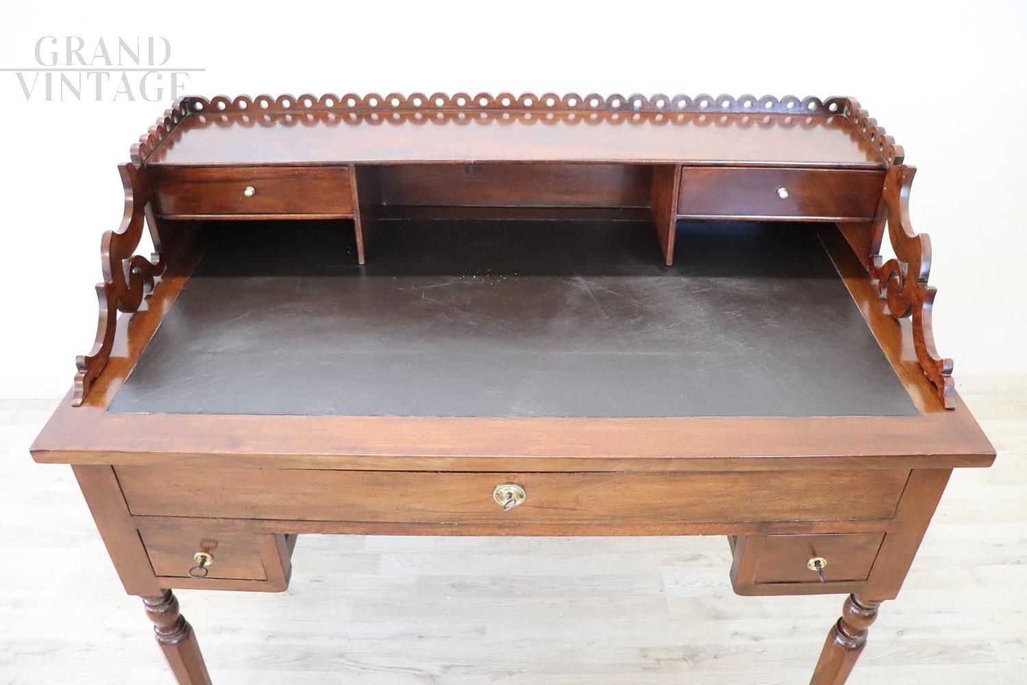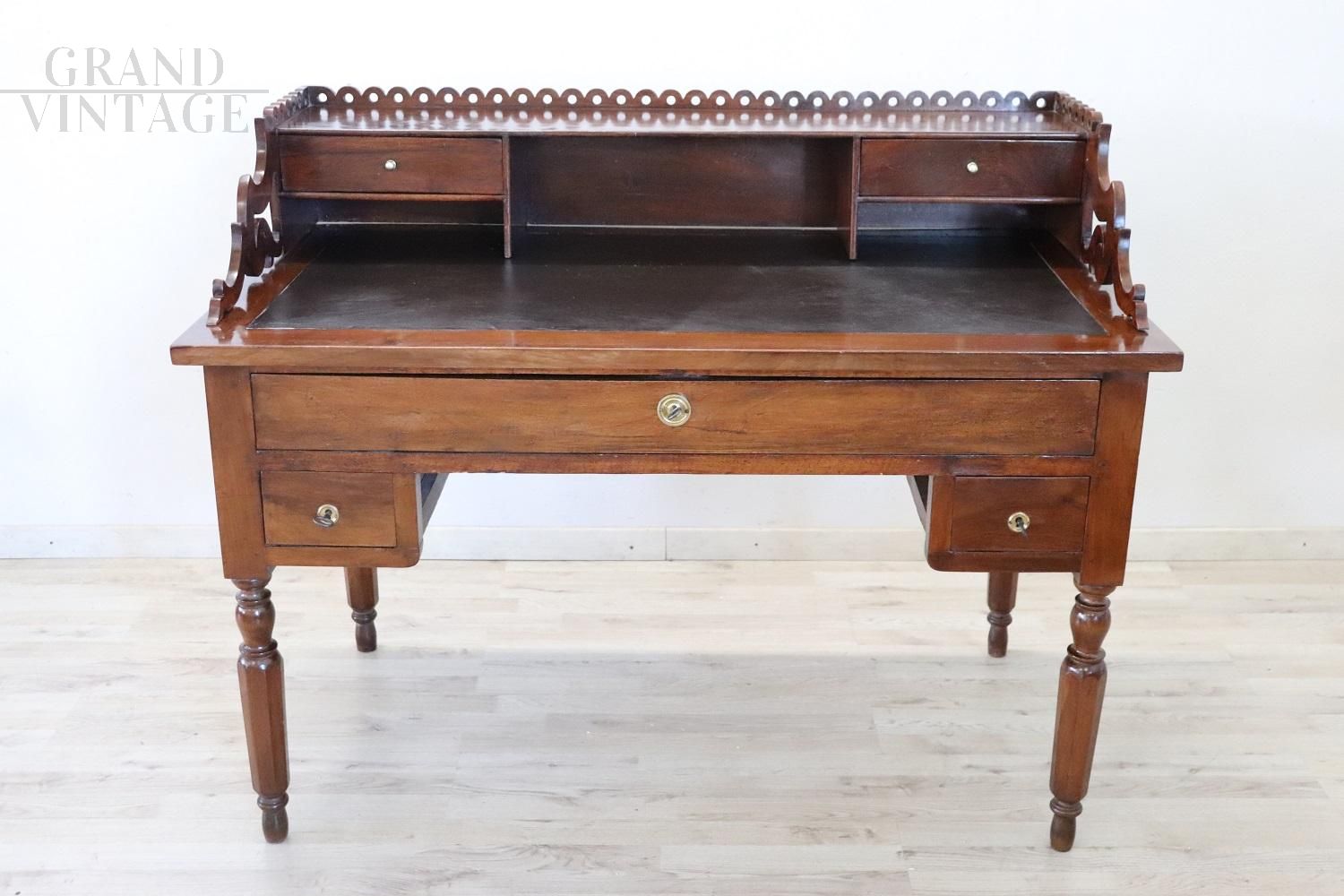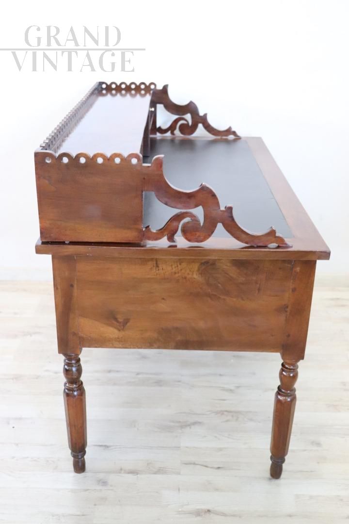 Elegant antique ladies' desk in solid walnut with upstand from the Italian Louis Philippe period - mid-19th century, comfortable dimensions for practical use. The desk features elegant turned legs, has three drawers at the bottom and two smaller drawers at the top. Perfectly finished even on the back so it can also be positioned in the center of the room even though it was born to be positioned on the wall. Excellent condition, only small natural signs of wear on the leather surface. Price negotiable.