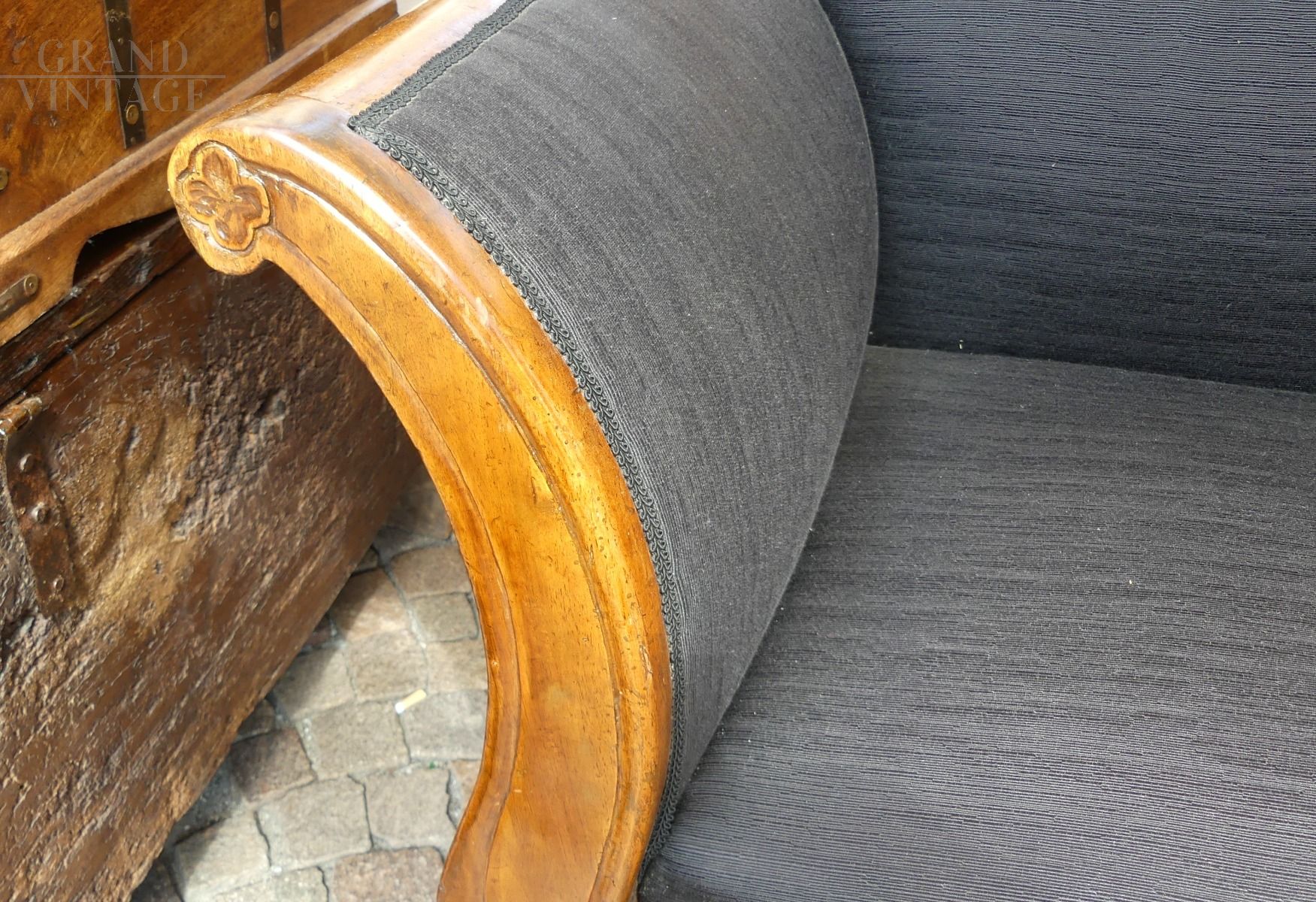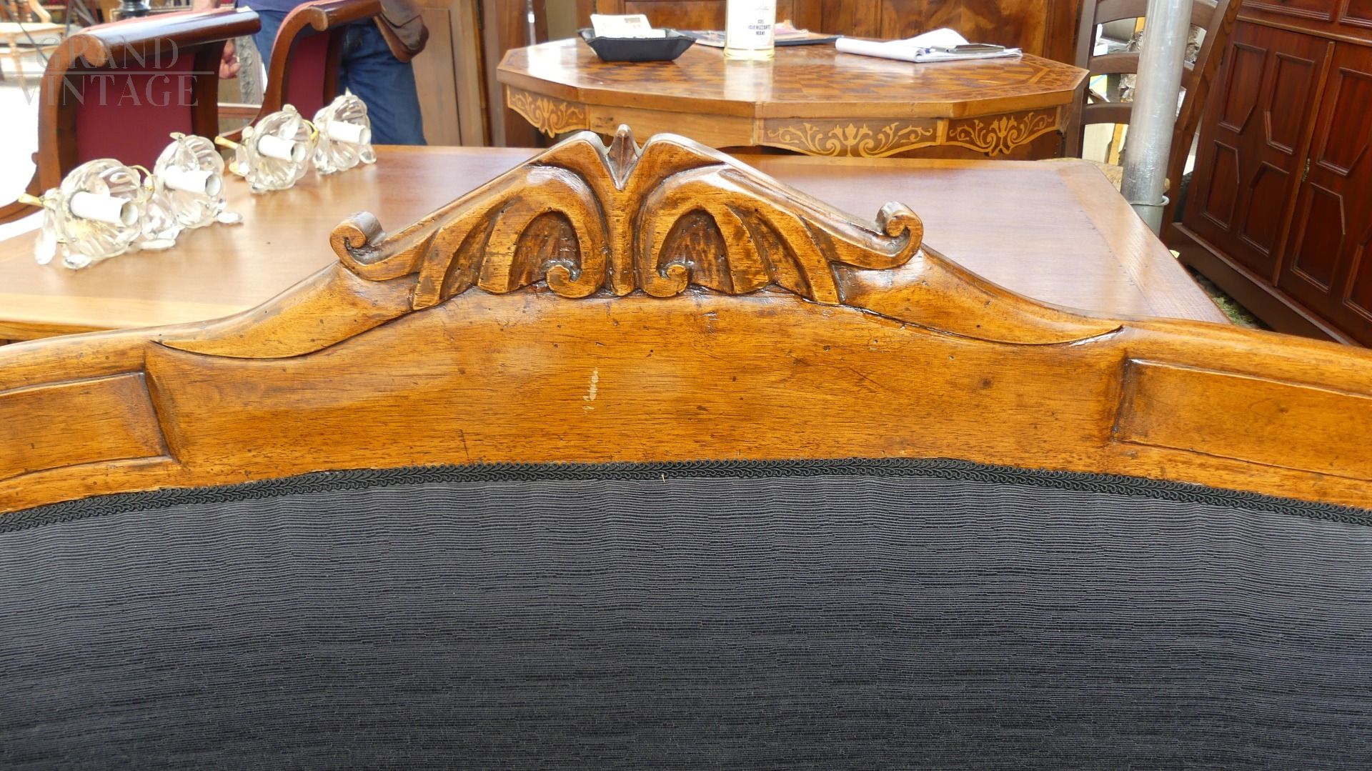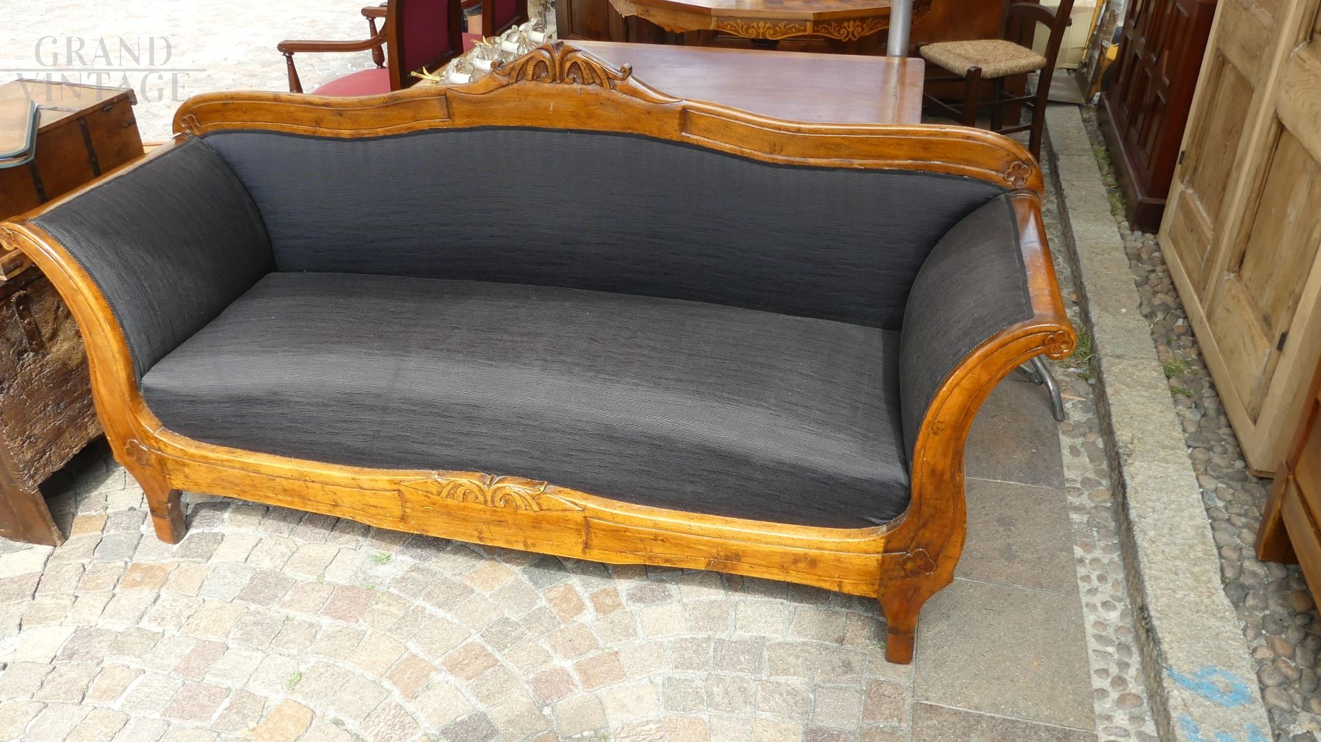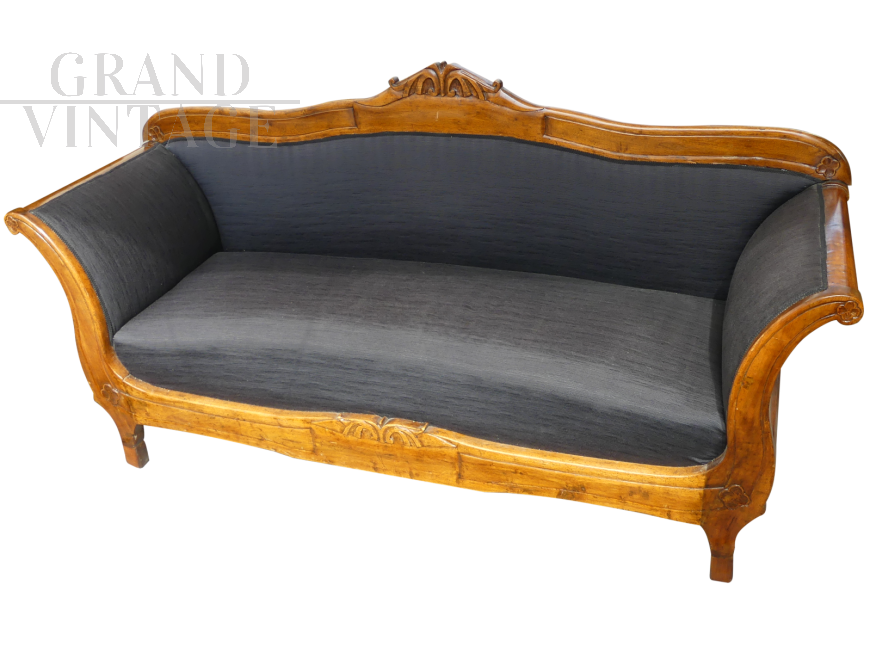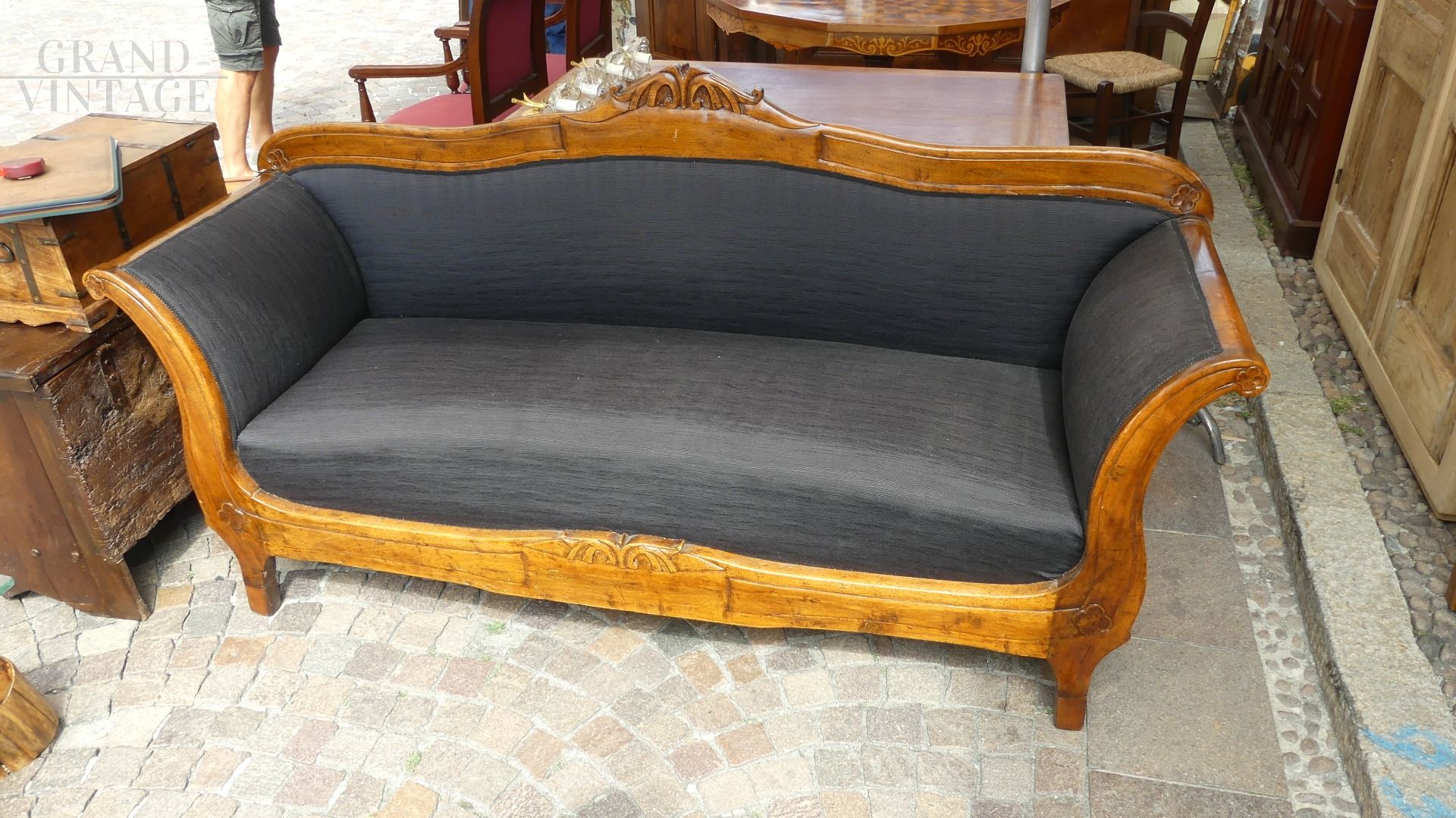 Antique sofa from the Louis Philippe period, second half of the 1800s, in finely carved walnut, restored.