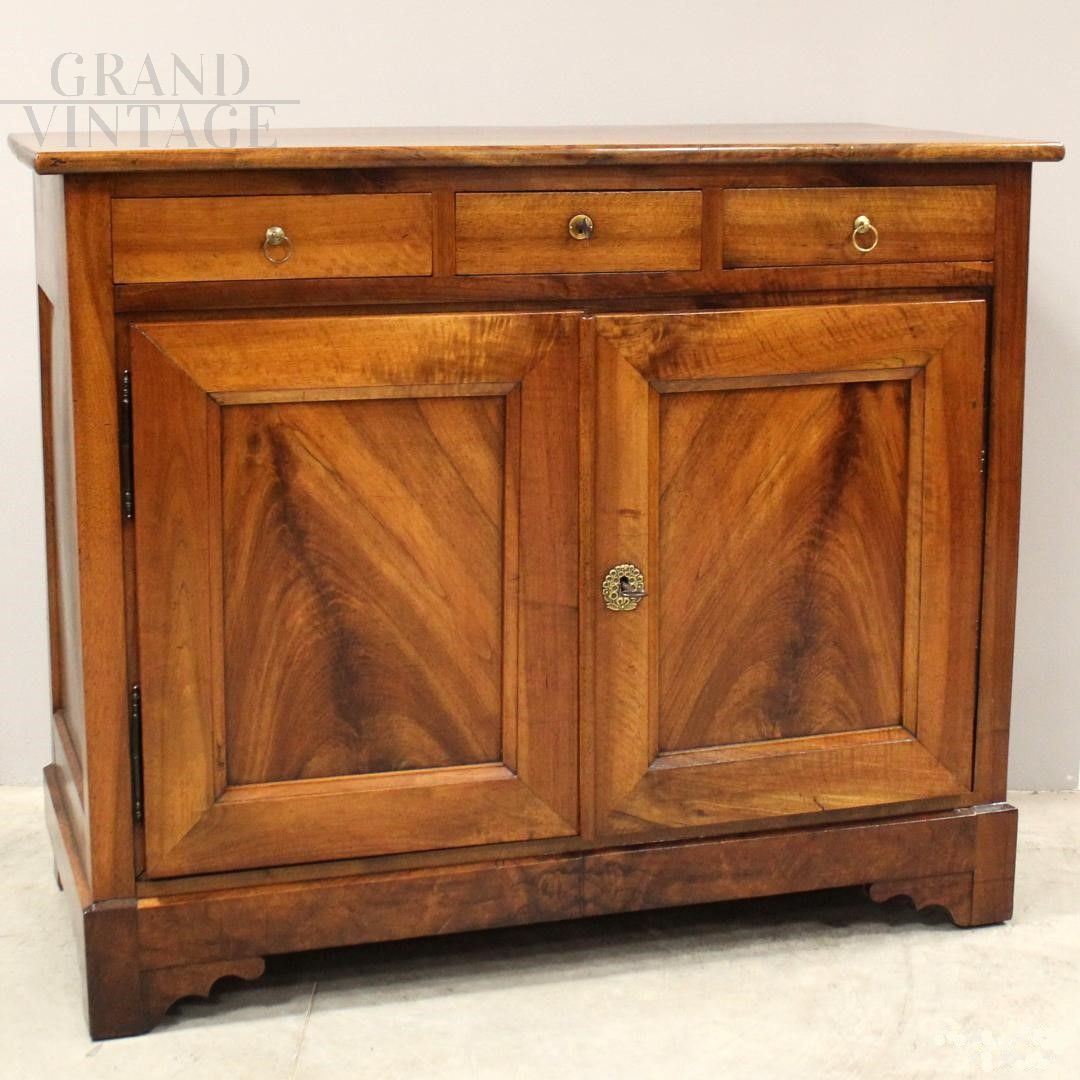 Antique Louis Philippe sideboard in solid walnut with two doors and three drawers, from the mid-19th century, restored and complete with Certificate of Authenticity.