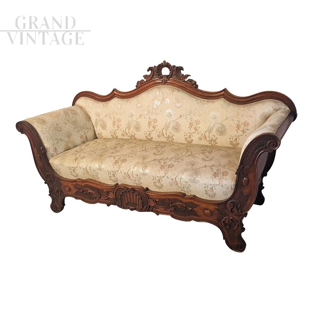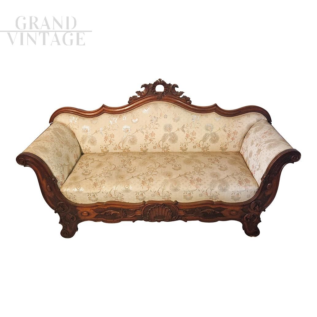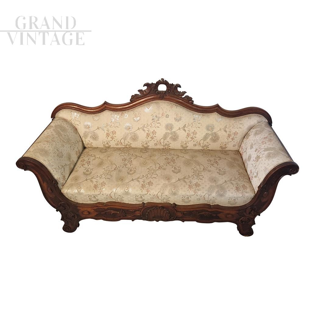 Antique sleigh sofa from the Louis Philippe era with hand-carved solid walnut structure and upholstery in beige damask fabric with floral motifs. The sofa is in a good state of conservation.