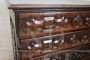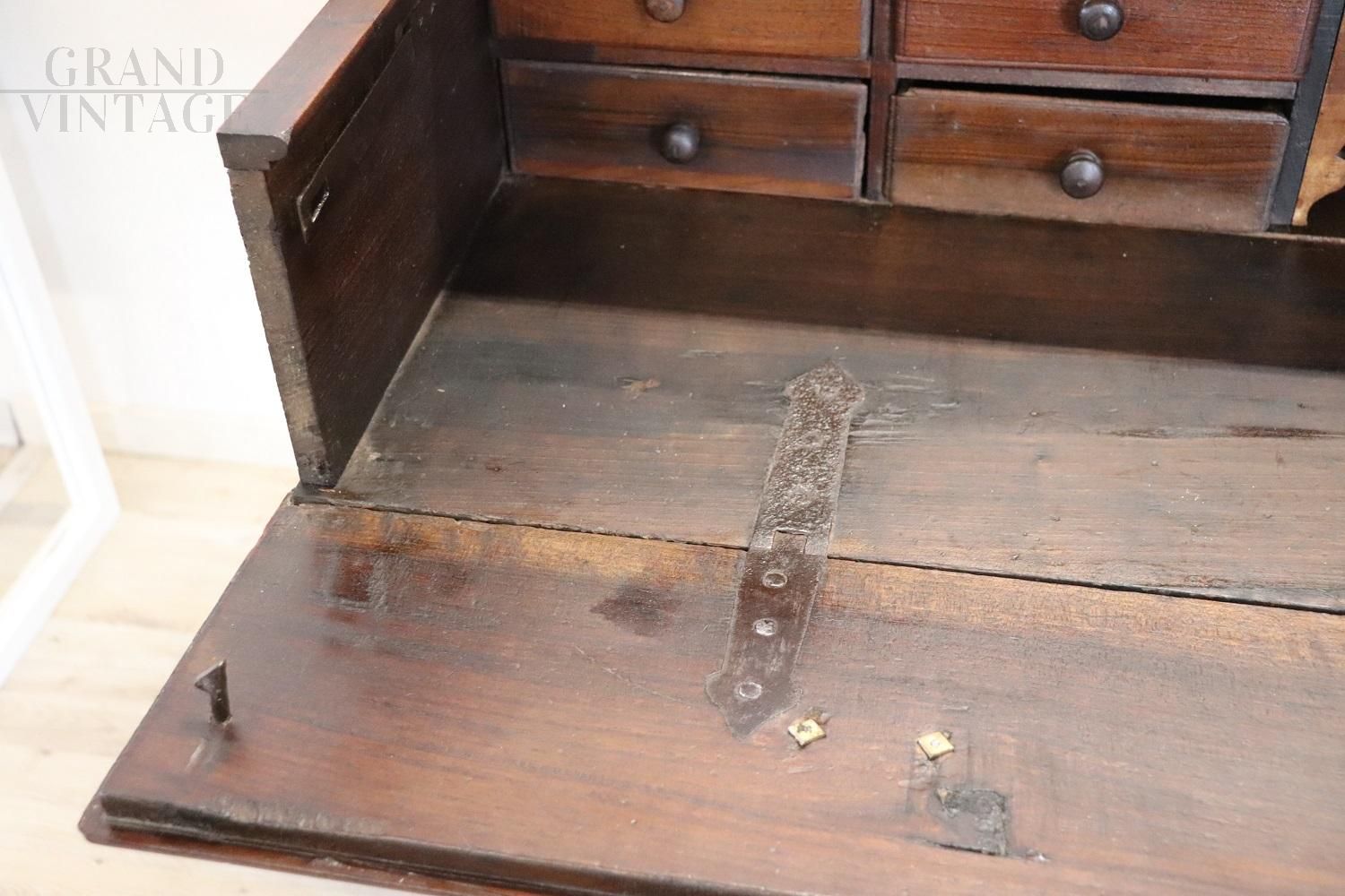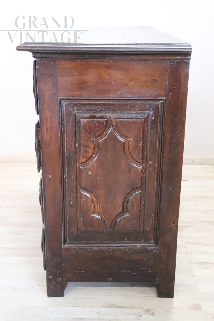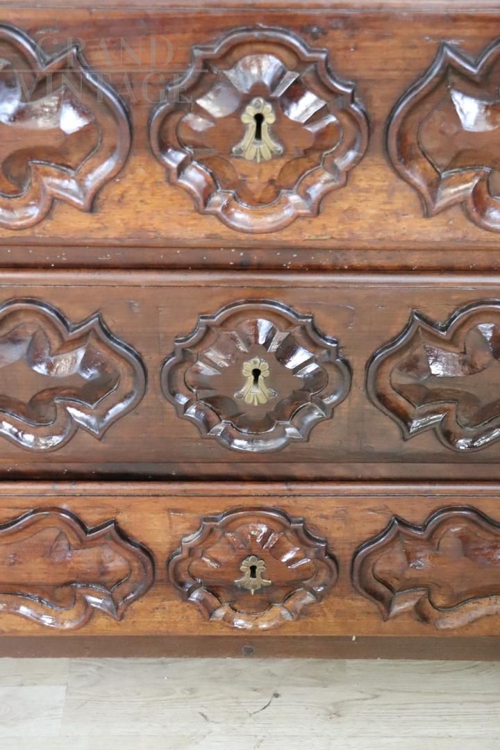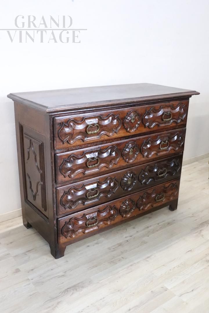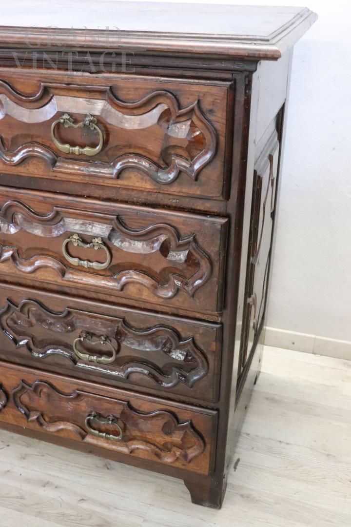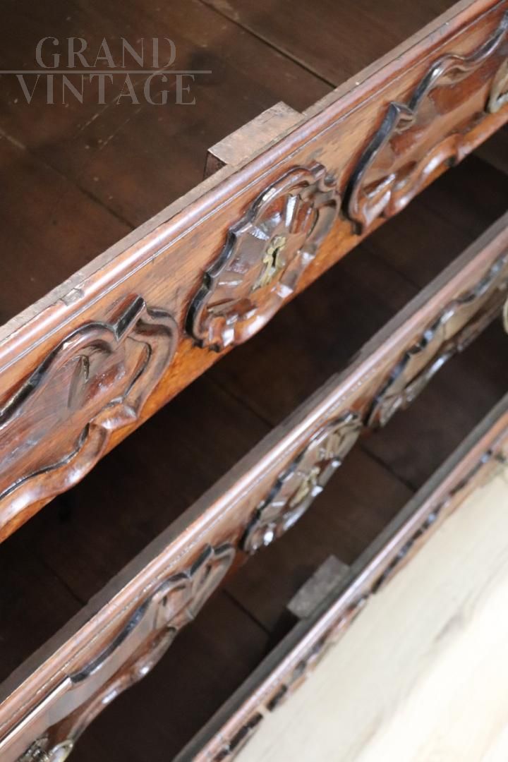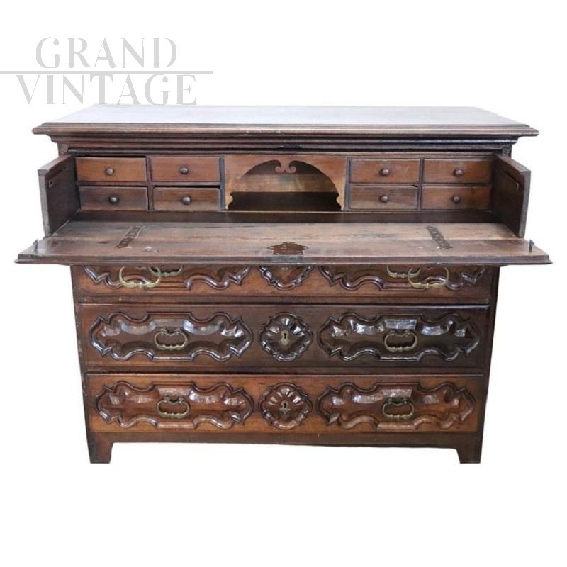 Antique chest of drawers in precious solid walnut from the Italian Baroque Louis XIV period of the second half of the 17th century, from a Piedmontese workshop. The chest of drawers features a beautiful antique patina to the walnut wood and rich wood carving work on the drawer fronts and sides. Equipped with four capacious front drawers, the first drawer has a very rare feature, the front has a drop-down opening that becomes a support or writing surface, internally equipped with eight small drawers with a central arched structure. The rich carving work is typically Piedmontese Baroque in taste. This dresser, due to its importance, is perfect for enriching any room in the house. In excellent condition, it shows signs of wear and the passage of time. Price negotiable.
