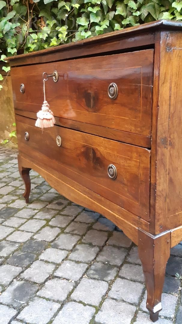 Rare antique chest of drawers of Modena origin from the Louis XV era (1715/74), in walnut wood. The refined design of the two drawers, with wavy feet and band, enriched by a sober maple thread on the front and sides, places it in those refined niche furniture, which have embellished our environments for over 200 years. The small dimensions also allow it to fit perfectly into the most varied contexts of the home. Original locks and key.