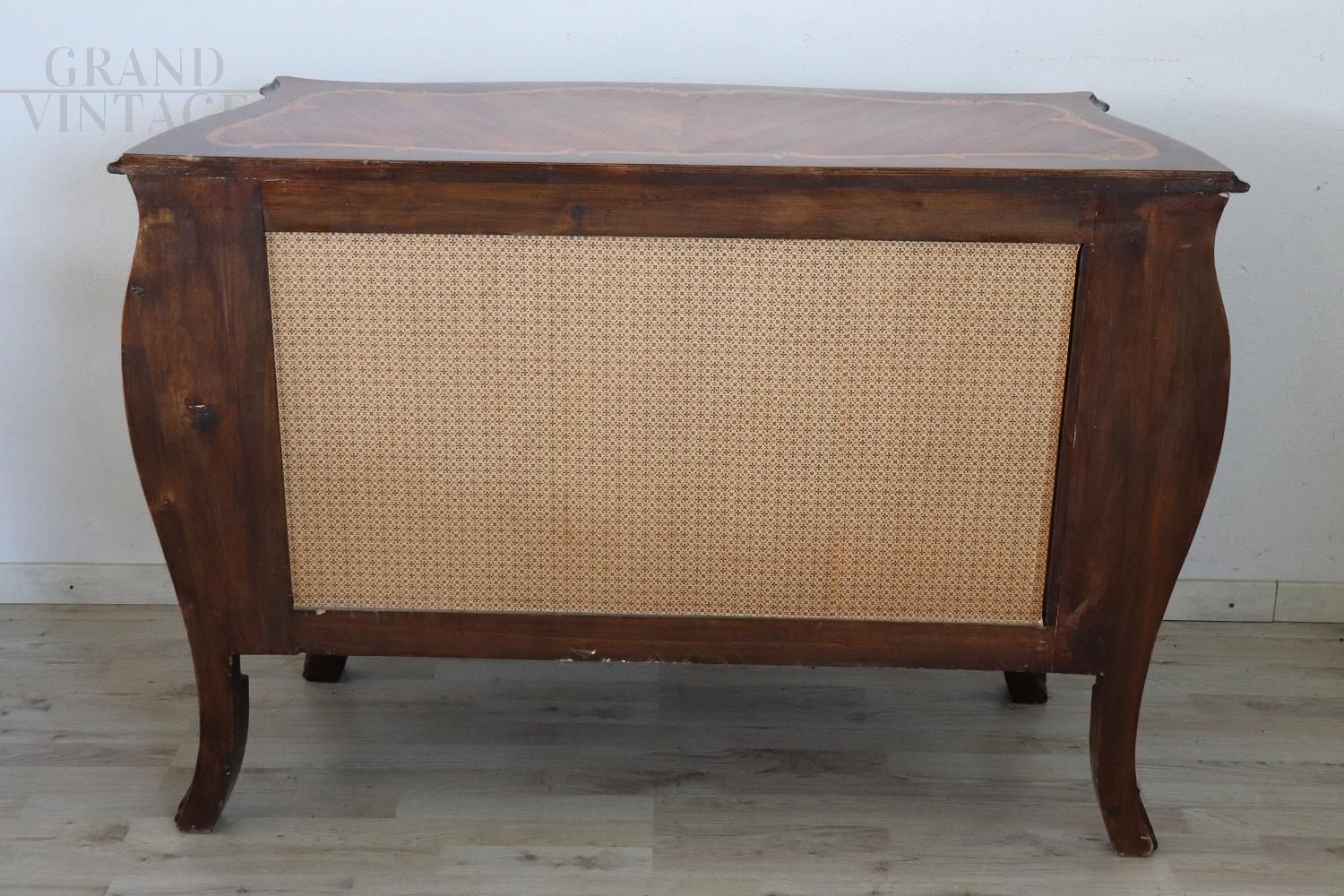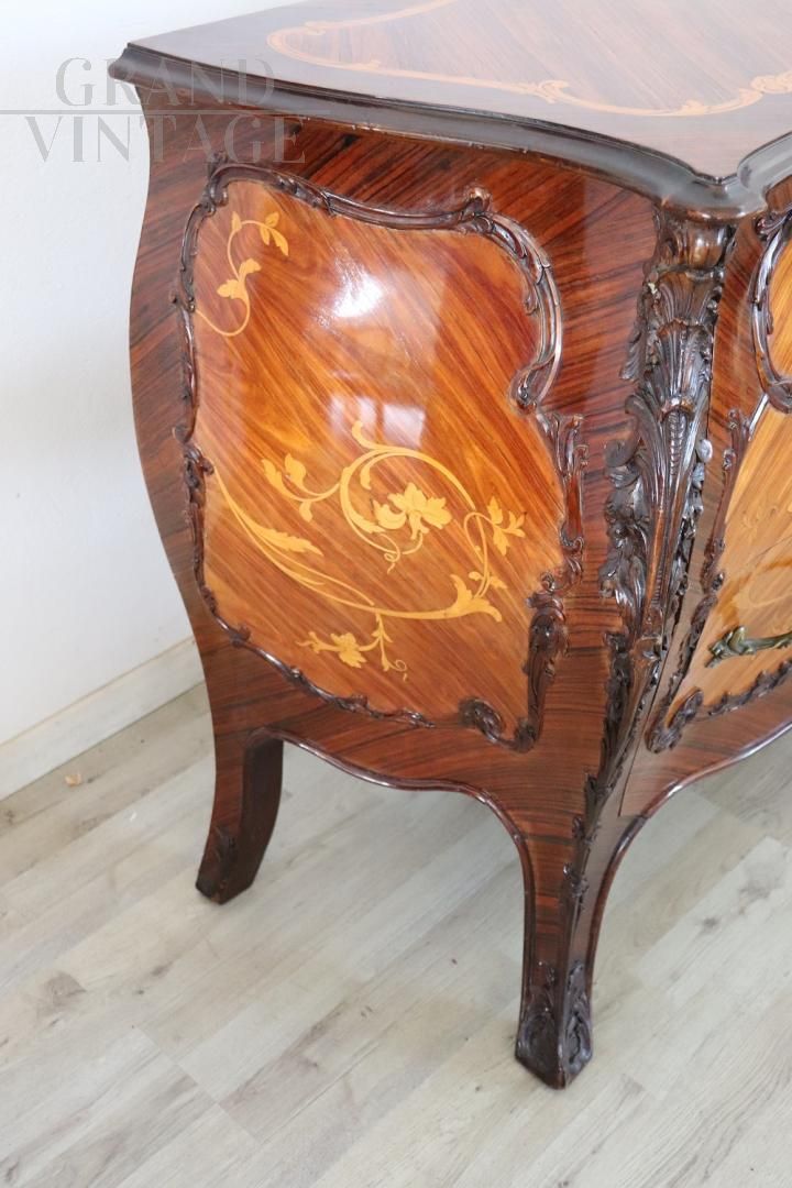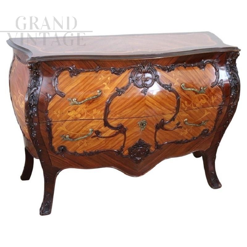 Elegant and important antique Louis XV style chest of drawers dating back to the early decades of the 20th century, fine antique reproduction in rosewood. The chest of drawers is characterized by the typical rounded shape with both carving and inlay decorations. Equipped with two large drawers. In perfect condition, ready to be placed in your home.