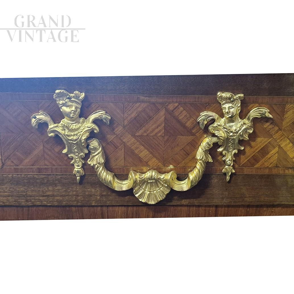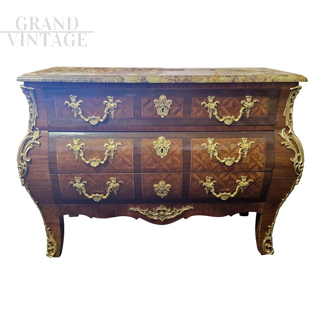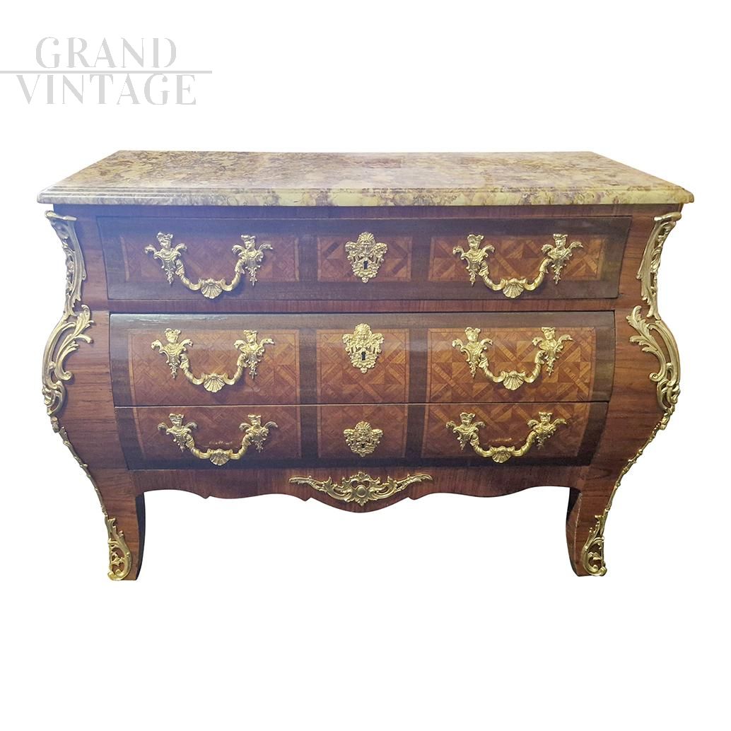 French antique style chest of drawers with beautiful wavy shape on the front and sides, has three drawers and a top in Breche marble. Reserves inlaid with marquetterie. Embellished with gilded bronze friezes and hardware.