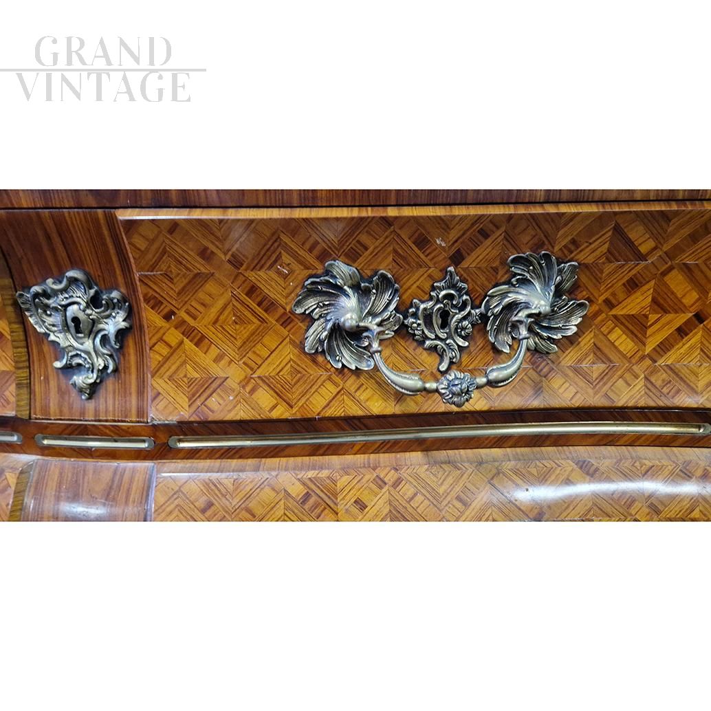 The dresser, with a strongly shaped line, is made of almond wood and entirely inlaid with a marqueterie motif. It was built in the 40s - 50s and is characterized by friezes and handles in gilded and chiseled bronze, a shaped top in Arabescato Orobico Rosso marble which follows the sinuous shape of the sides and front. The harmony of the shapes is enhanced by the shaped profile of the façade, divided into six drawers in three rows, and by the four curved legs.