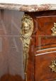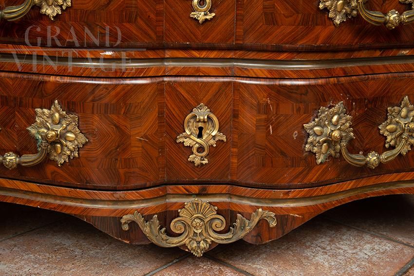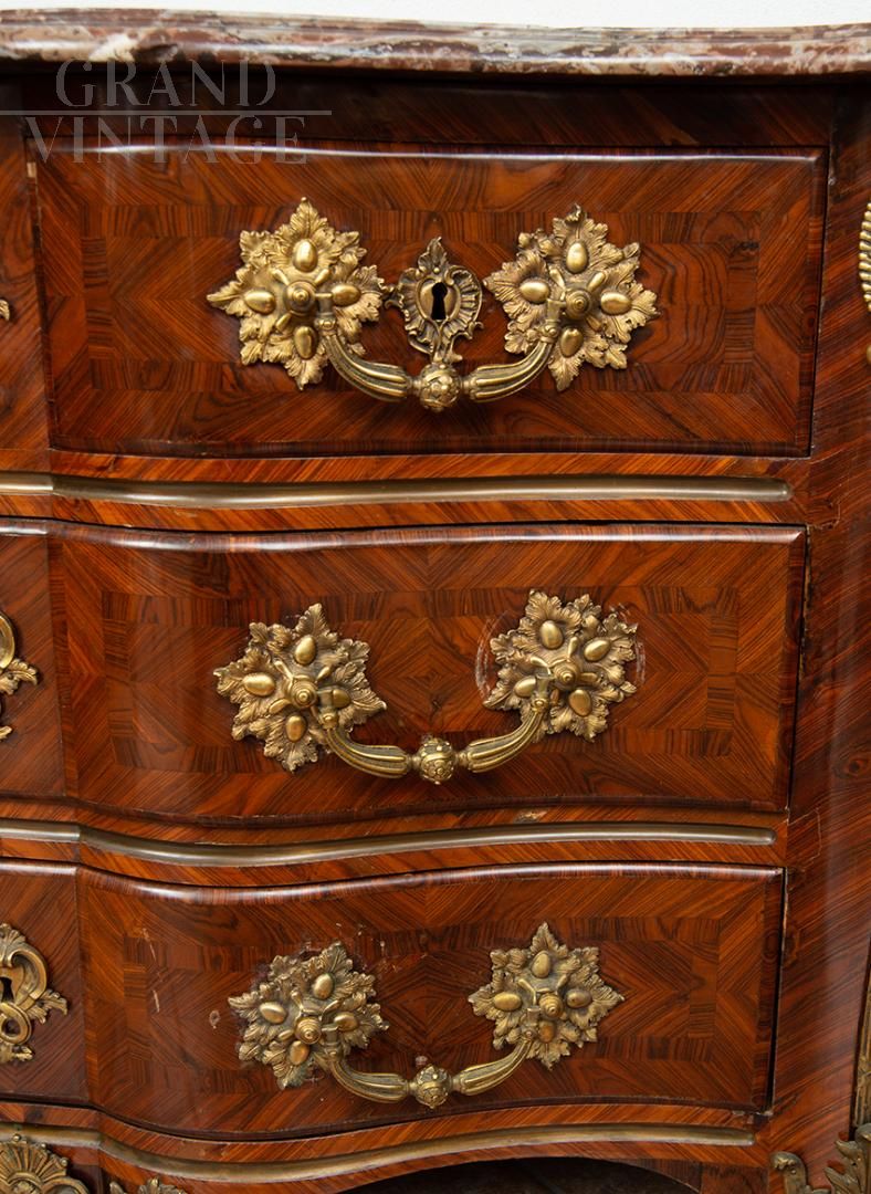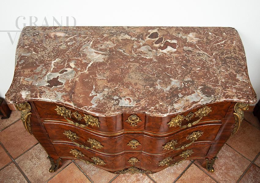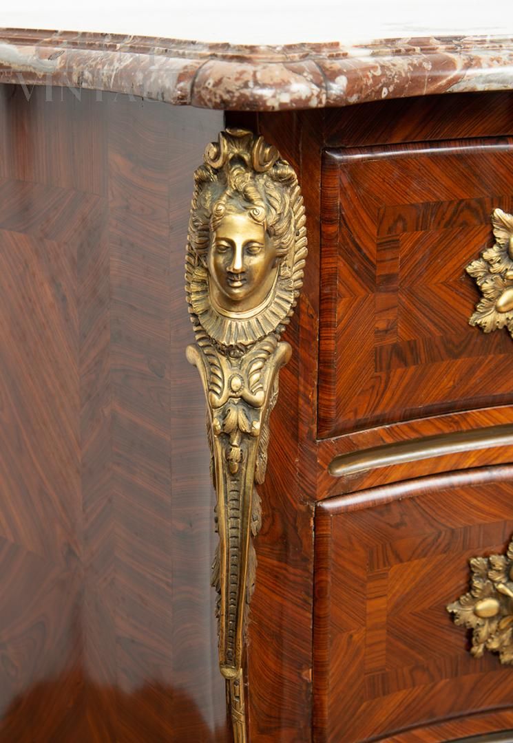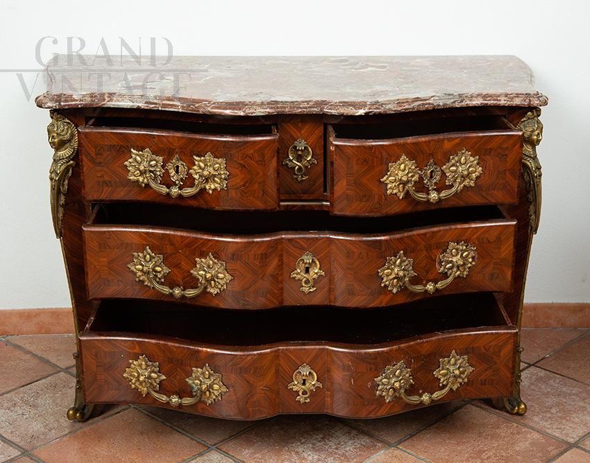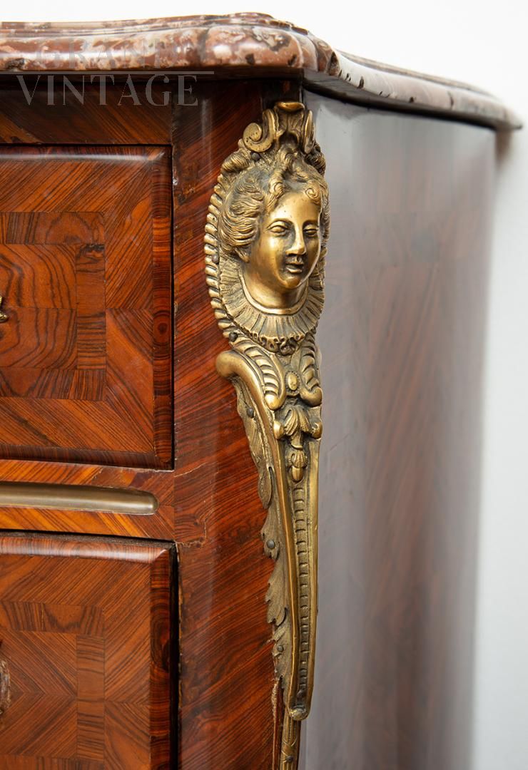 Antique French Louis XV chest of drawers in Tombeau shape in precious exotic wood with red France marble top. The under-top band features two large drawers that can be pulled out via finely chiselled gilt bronze handles. The second and third drawers are unique and can always be pulled out using handles. The two corners are embellished with bronze elements depicting female busts and end with cabriolet tips. Laterally it has a curvilinear movement embellished by the implementation of the herringbone wood. The base is mixtilinear and is adorned with a central gilt bronze medallion. The bottoms of the drawers are all in solid walnut and the locks are original from the period. Good condition, France 18th century.