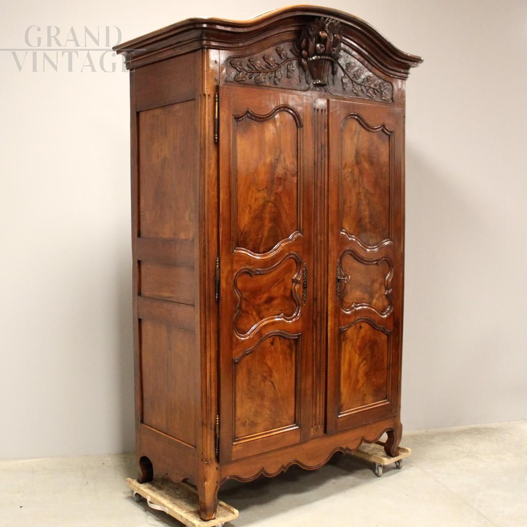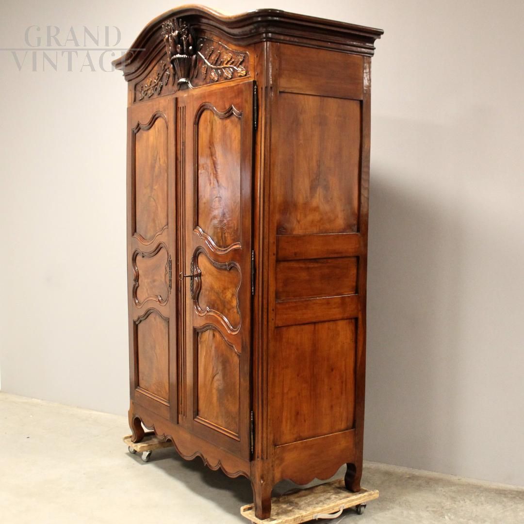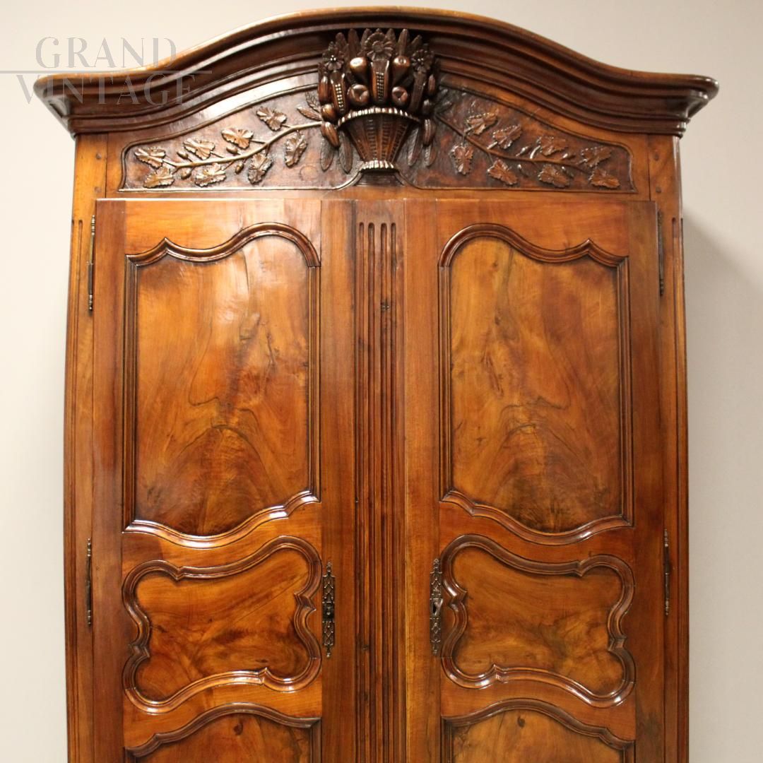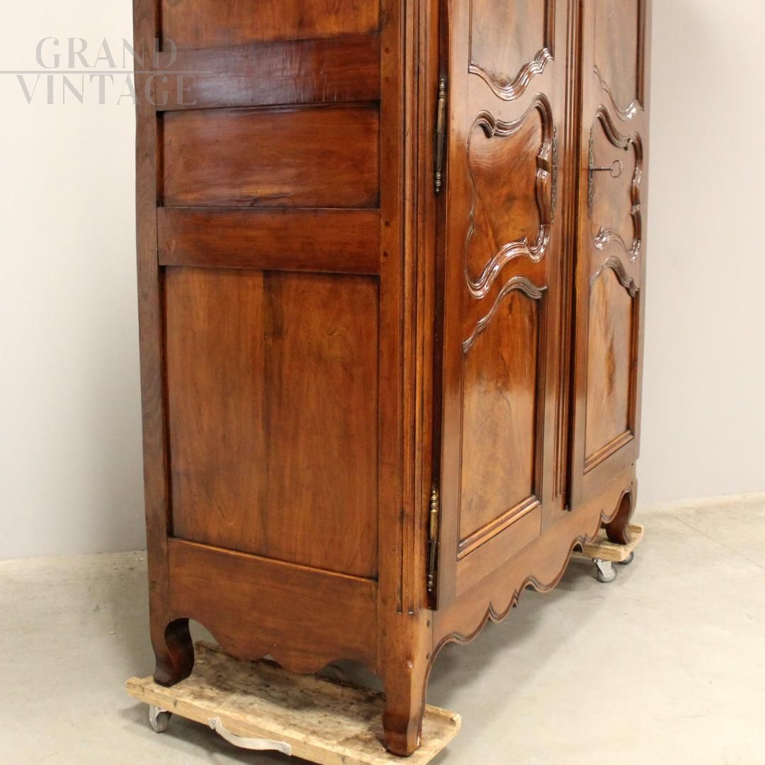 Antique Louis XV wardrobe in solid walnut and solid cherry with finely carved frieze, 18th century, in perfect condition.