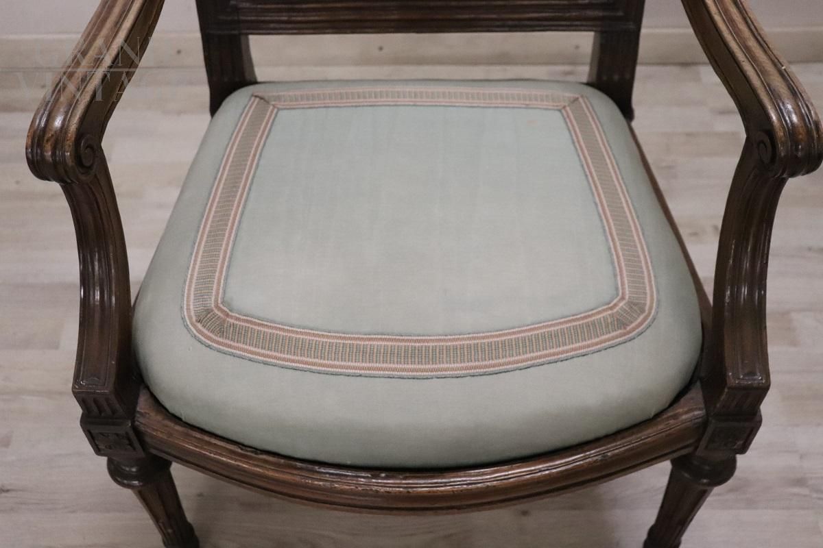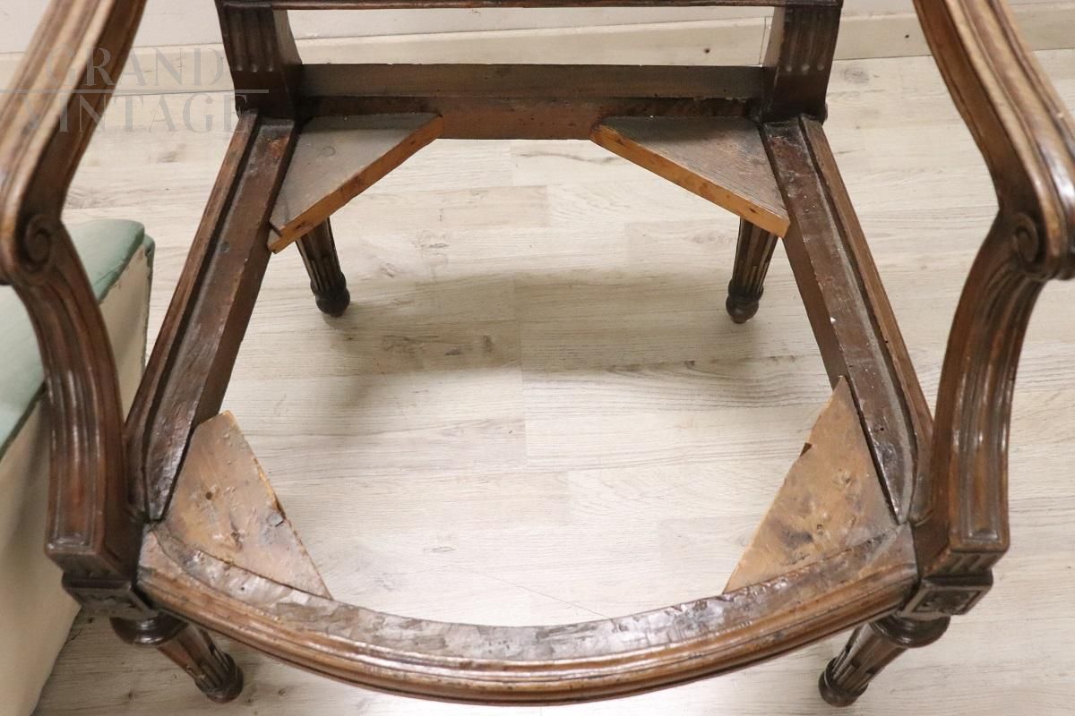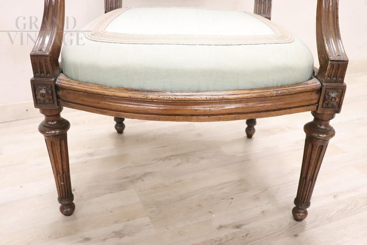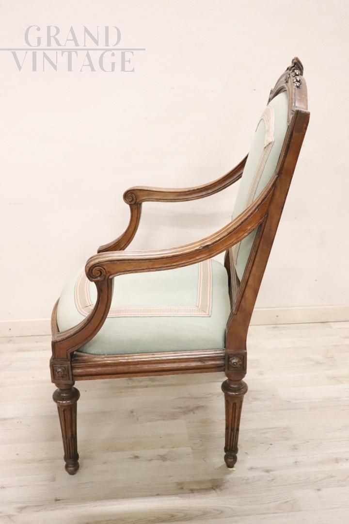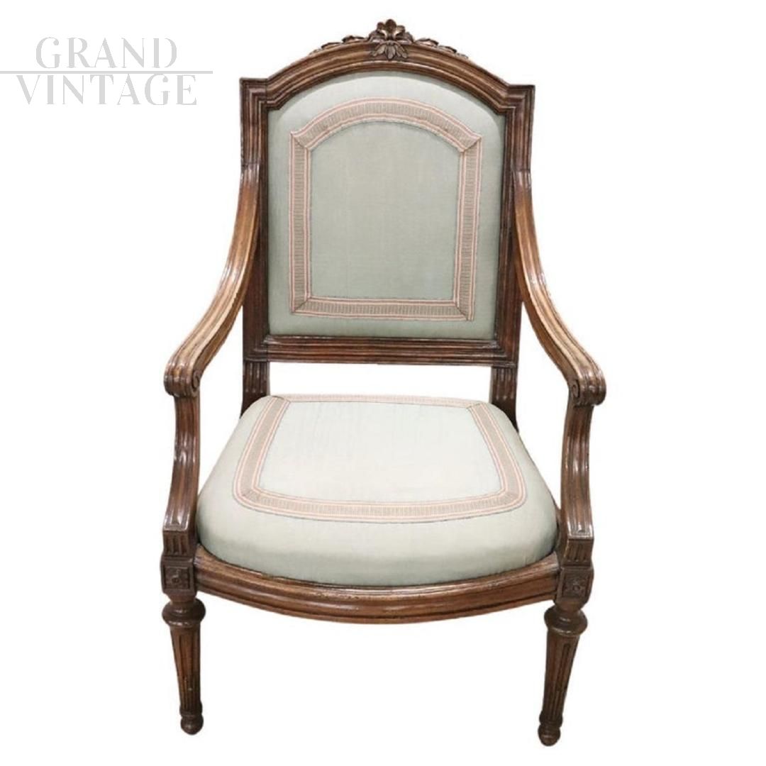 Beautiful antique Italian armchair from the 18th century, full Louis XVI period, in solid walnut wood. An imposing large armchair, large and comfortable, with padded seat and back. Very linear, characterized by small and refined decorations carved into the wood. In perfect condition of wood, padding and fabric. Perfect for use as a desk chair. Ready to be used in your home. Price negotiable.