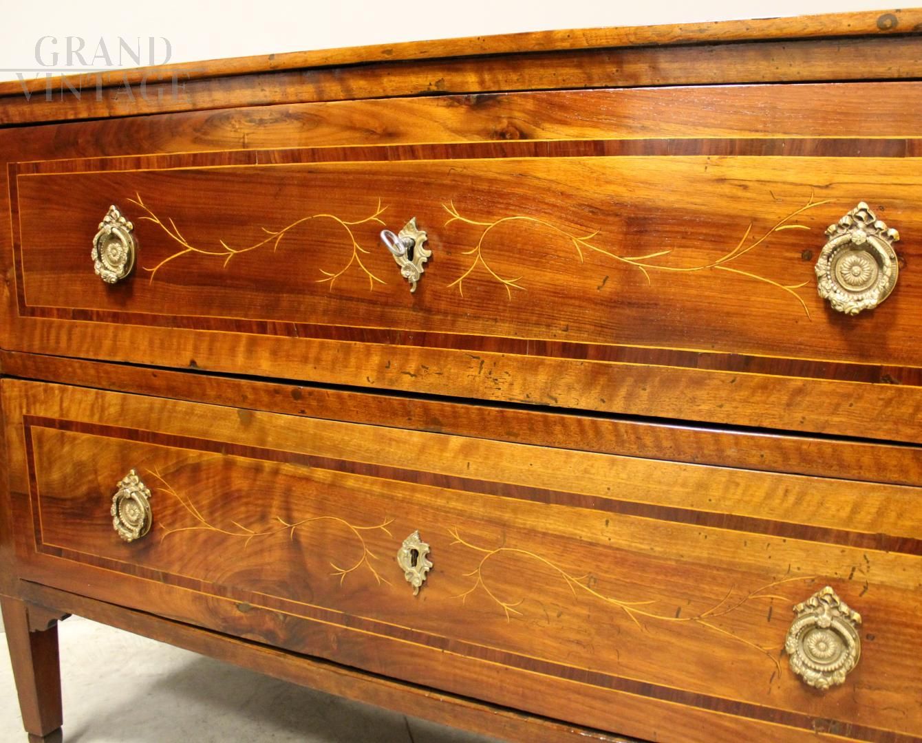 Antique Louis XVI chest of drawers in Rolo inlaid walnut, Italy 18th century