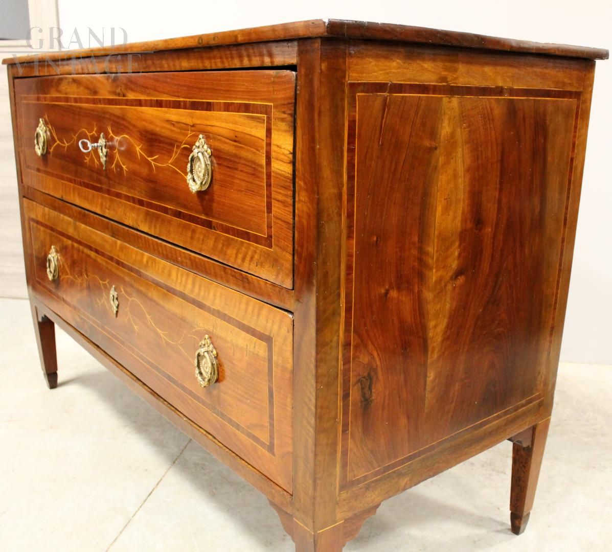 Antique Louis XVI chest of drawers with two drawers in solid walnut, with Rolo inlays and threaded in precious woods - Rolo inlay from the 18th century - Louis XVI, from Italy - Emilia Romagna. Restored.