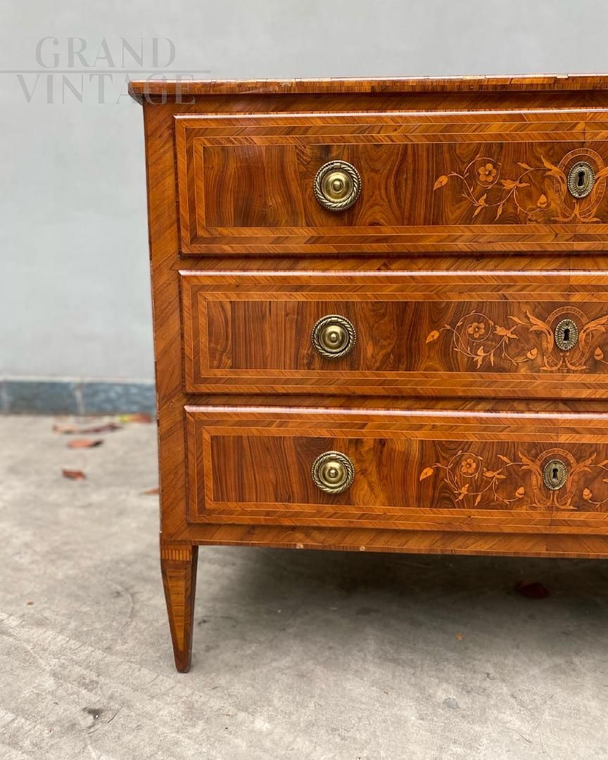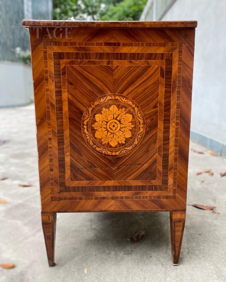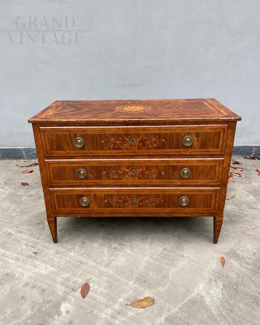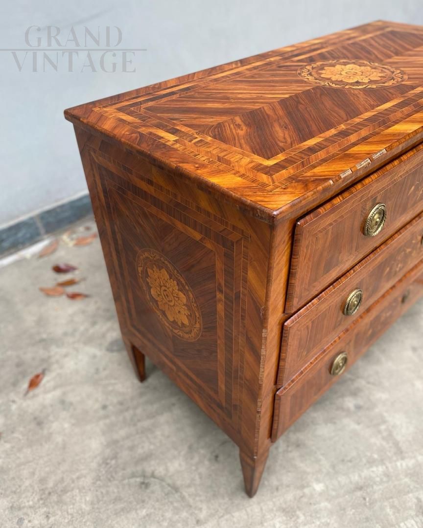 Antique Louis XVI chest of drawers with three drawers, made in Italy in the 18th century, the dresser has a walnut wood structure with a rosewood veneer. The dresser has a floral motif inlay on the three drawers, and on the top and side parts there is a floral rosette, the chest of drawers has truncated pyramidal legs.