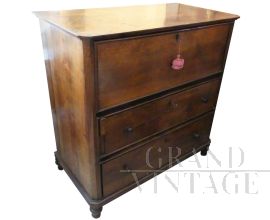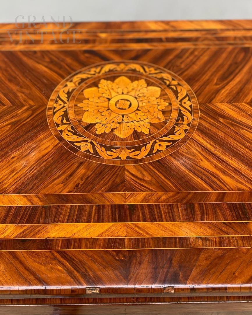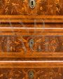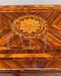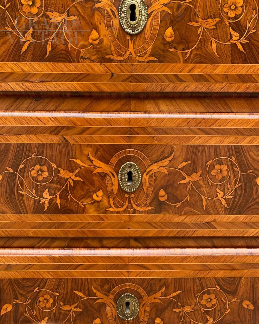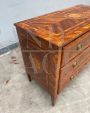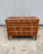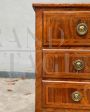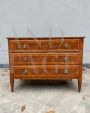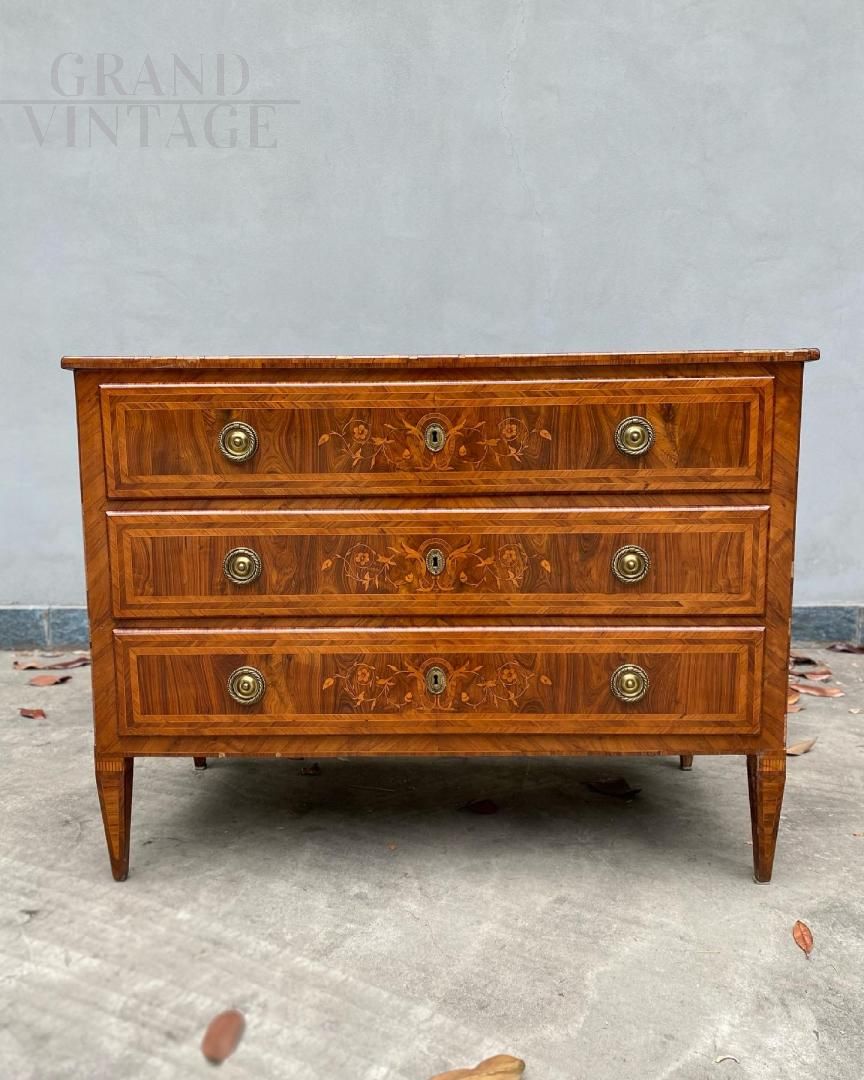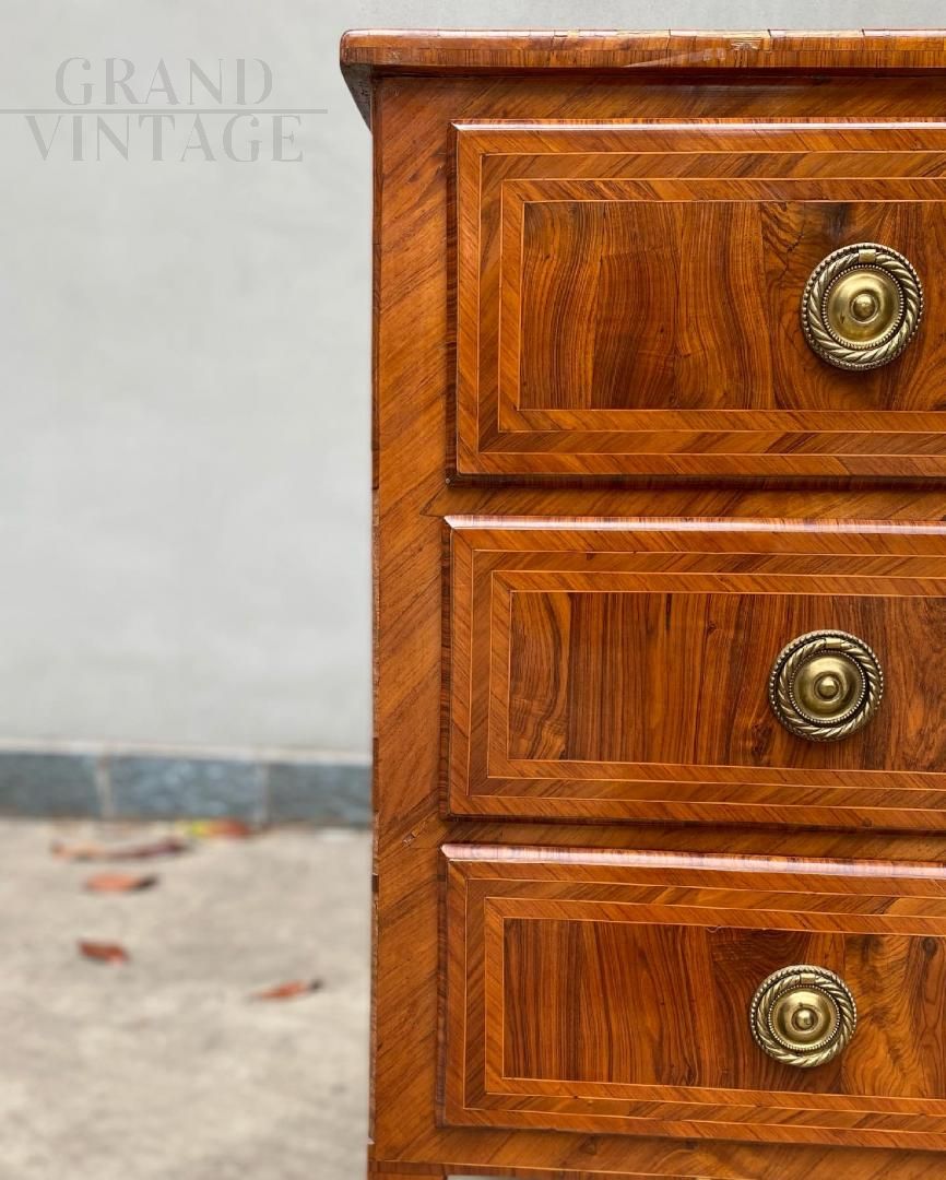 Antique Louis XVI chest of drawers with three drawers, made in Italy in the 18th century, the dresser has a walnut wood structure with a rosewood veneer. The dresser has a floral motif inlay on the three drawers, and on the top and side parts there is a floral rosette, the chest of drawers has truncated pyramidal legs.