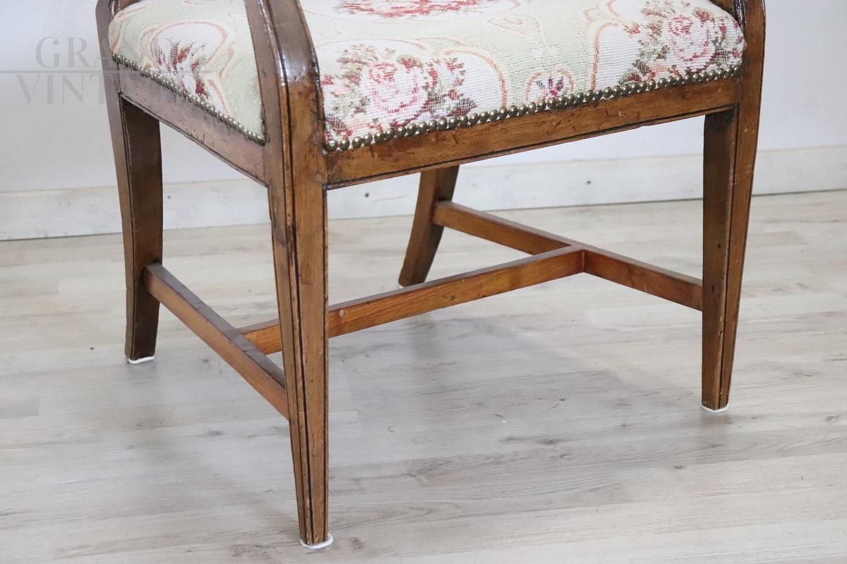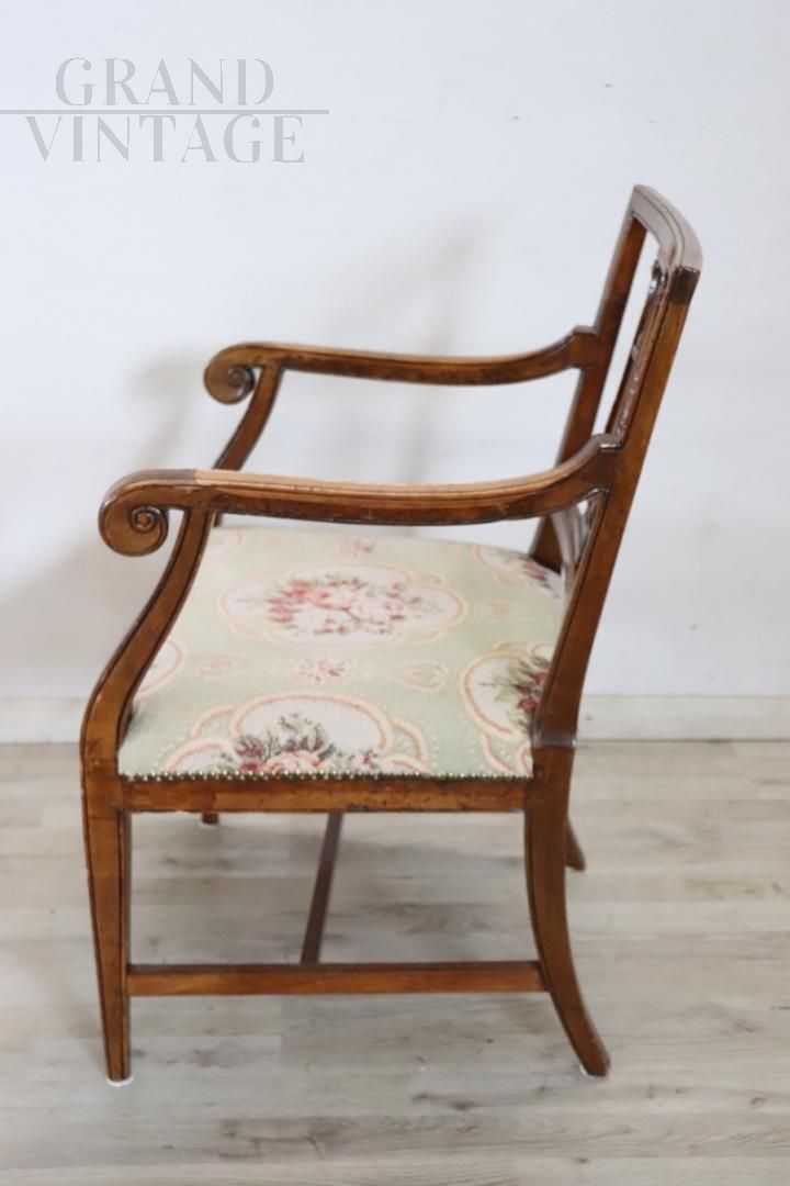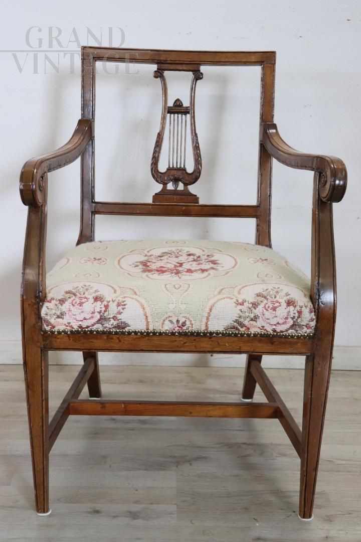 Beautiful antique Italian armchair from the 18th century, from the Louis XVI period, in solid walnut wood. The armchair is very simple and essential. The backrest decorated with a lyre carved in wood is beautiful. The padding and fabric are in excellent condition. Perfect for use as a desk chair. The armchair is in perfect vintage condition, ready to be used in your home. Perfect to be placed in a country house.