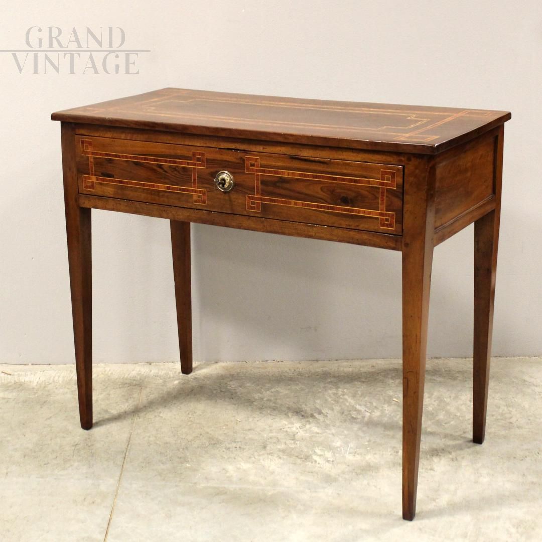Antique Lombard bedroom side table, console or writing desk from the late 18th century, Louis XVI style, in solid walnut, elegantly inlaid and trimmed with geometric motifs in various fine woods, complete with drawer. Restored.