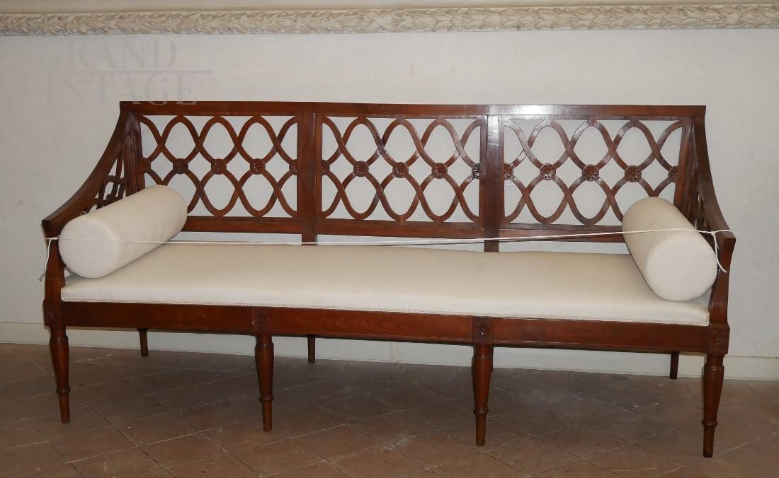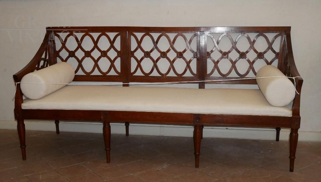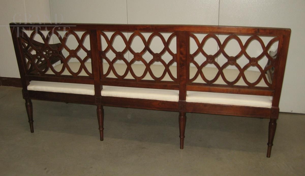 Antique Louis XVI sofa in solid cherry wood, late 18th - early 19th century, from northern Italy. Restored some time ago, it has a rich perforated backrest and carved parts, turned feet with carving, padding redone with covering to be applied in the desired fabric.