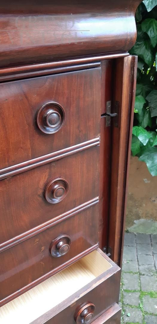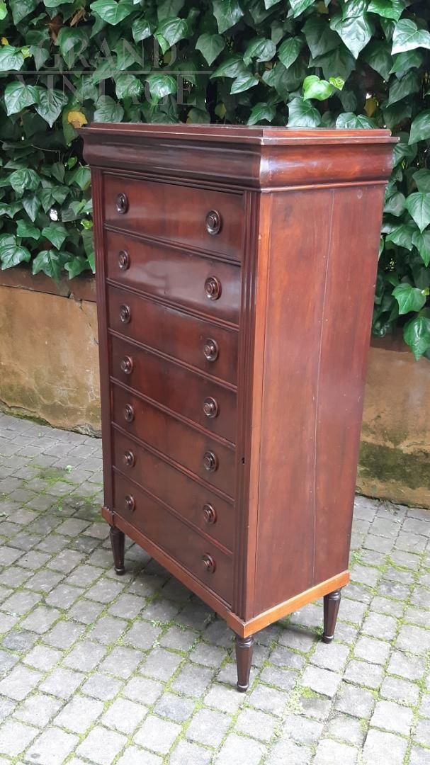 Antique French Capuchin tallboy dresser chest of drawers from the second half of the 19th century, veneered in mahogany, with the typical groove on the top. Refined septet with a small throat, the design is elegant and the proportions are well balanced. Curious detail, the retractable right shoulder with lock allows you to close the entire chest of drawers, a feature that distinguishes it. Intact furniture.