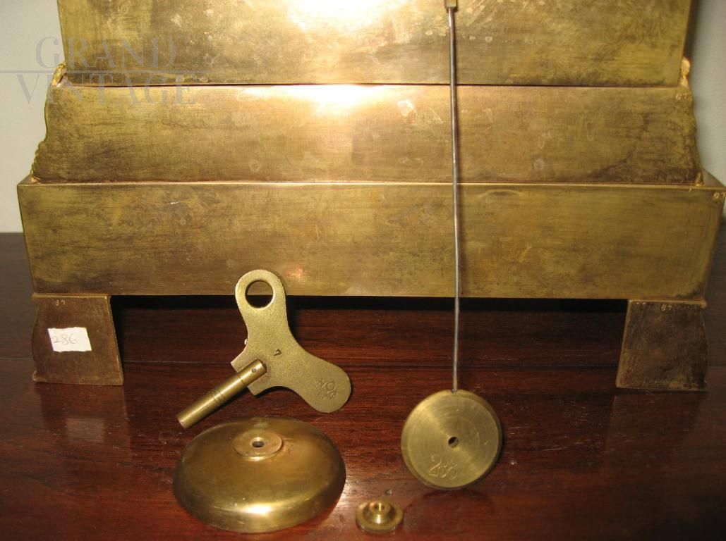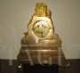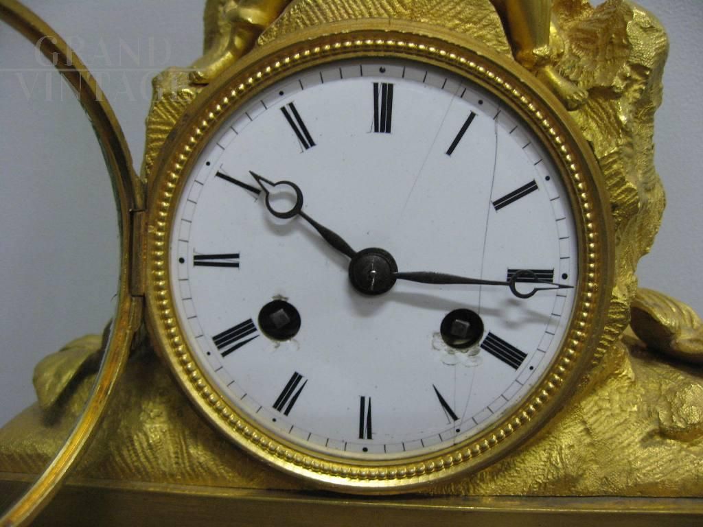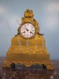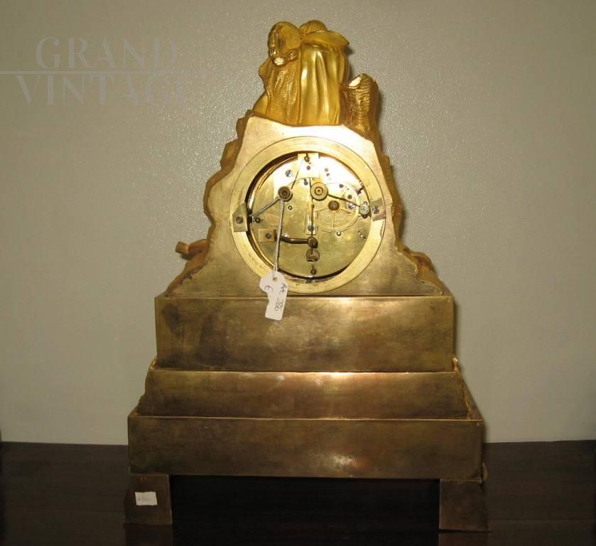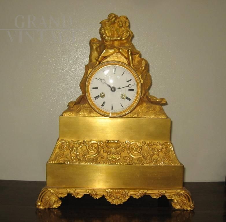 Antique countertop clock in gilded bronze with mercury, first half of 19th century, French. White dial with slight and small spinning, two charges. Movement running with wire pendulum. It rings the hours and half hours. The figure represents romantic scene with a couple of lovers. In excellent condition, overhauled some time ago.