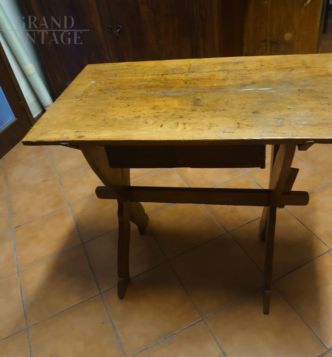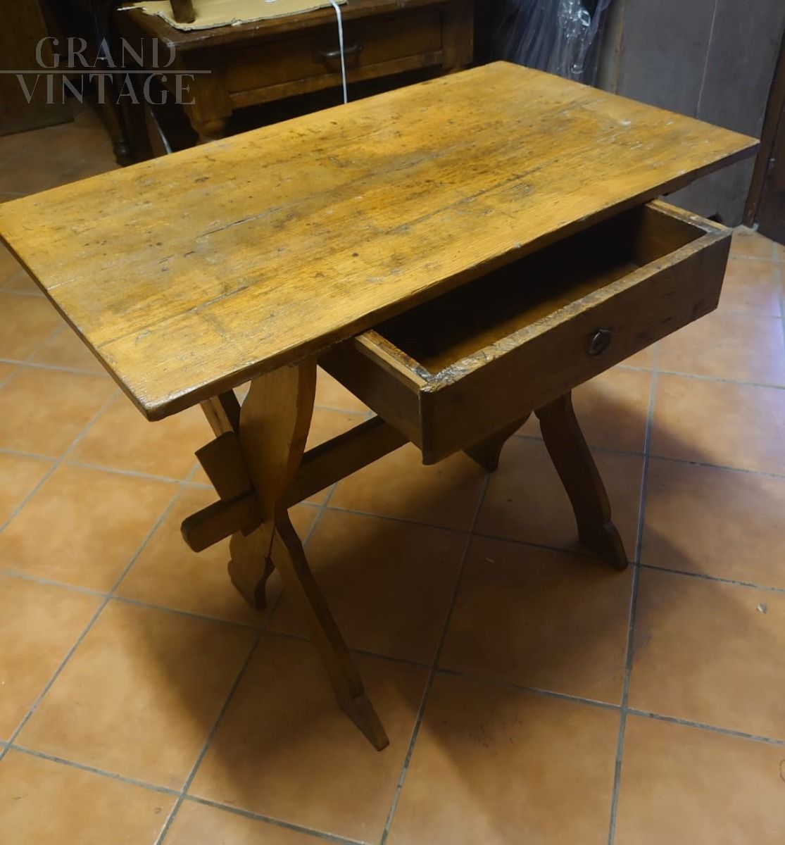 Antique rustic Tyrolean table from the mid-19th century with central drawer, fir wood structure and pine wood top, restored and with anti-woodworm treatment performed. The table is resistant and in good condition, restored and with woodworm treatment performed. The table can be completely dismantled, it has no screws and the nails and joints are all made of wood and original from the time.