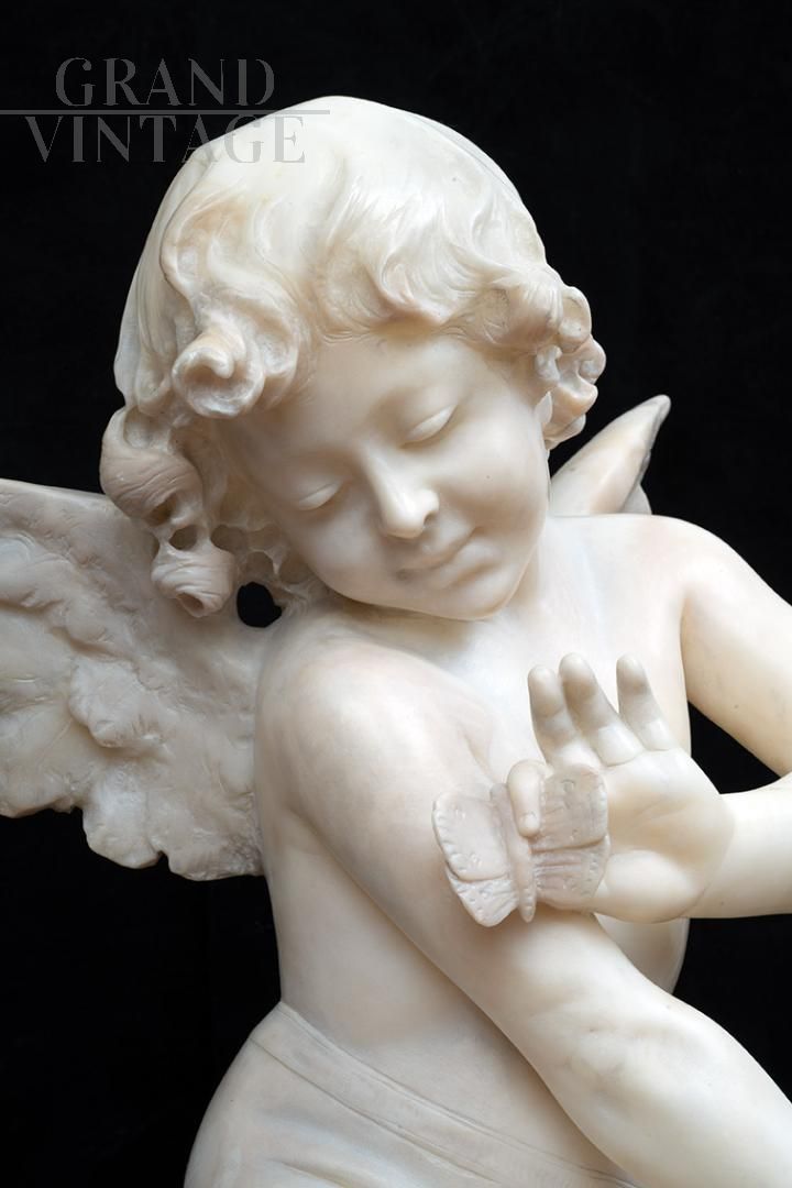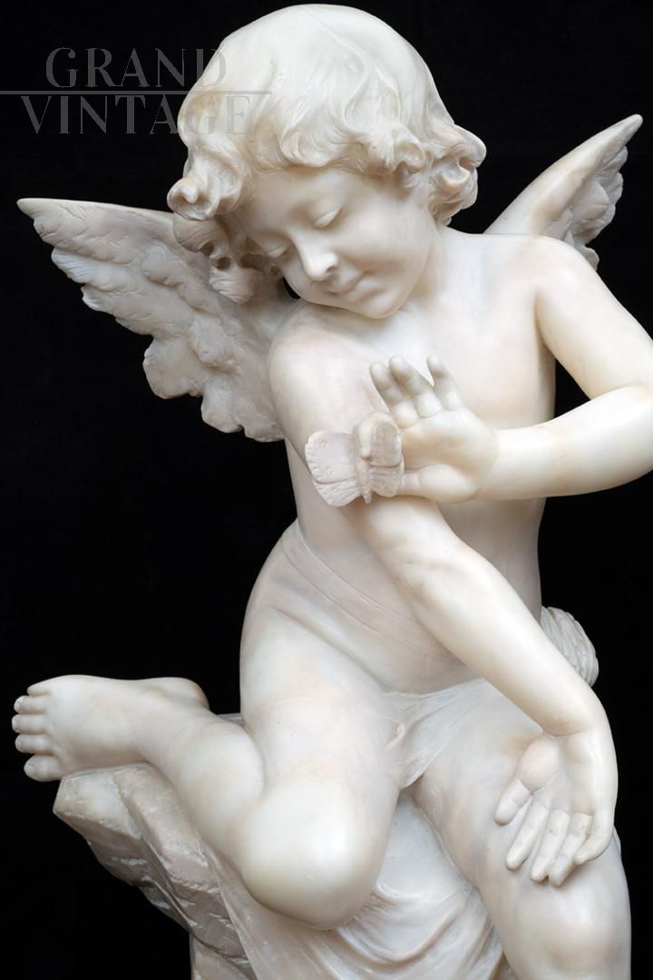 Antique alabaster sculpture depicting a winged cherub from the Napoleon III period, mid-19th century. The statue rests on an oval base with a rocky terrain design, where the cherub is seated on a rock. The cherub gazes joyfully at a butterfly resting on his right arm, in a sweet and sensual pose. This work is of great value and displays high sculptural quality, highlighted by the attention to anatomical details. Origin: 19th century France.