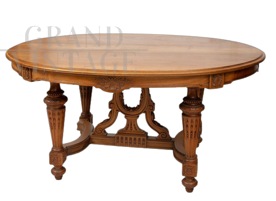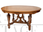 Antique Napoleon III French table in solid walnut belonging to the second half of the 19th century. The oval-shaped top is supported by four fluted legs connected by a cross. The table can be stretched by tearing it to a length of 250 cm. Possibility to match the chairs too.