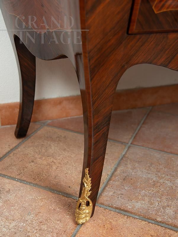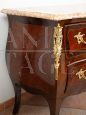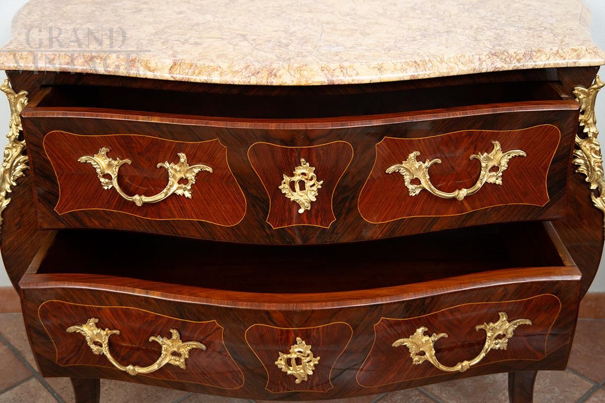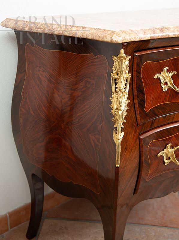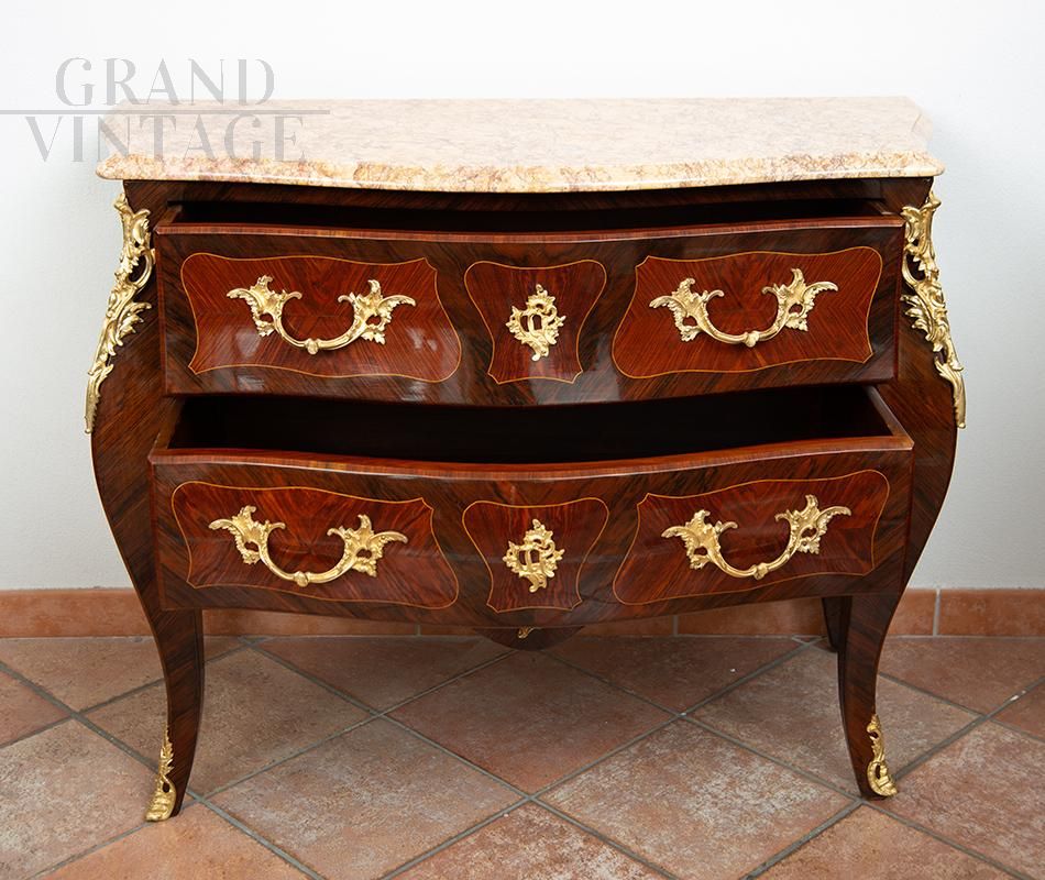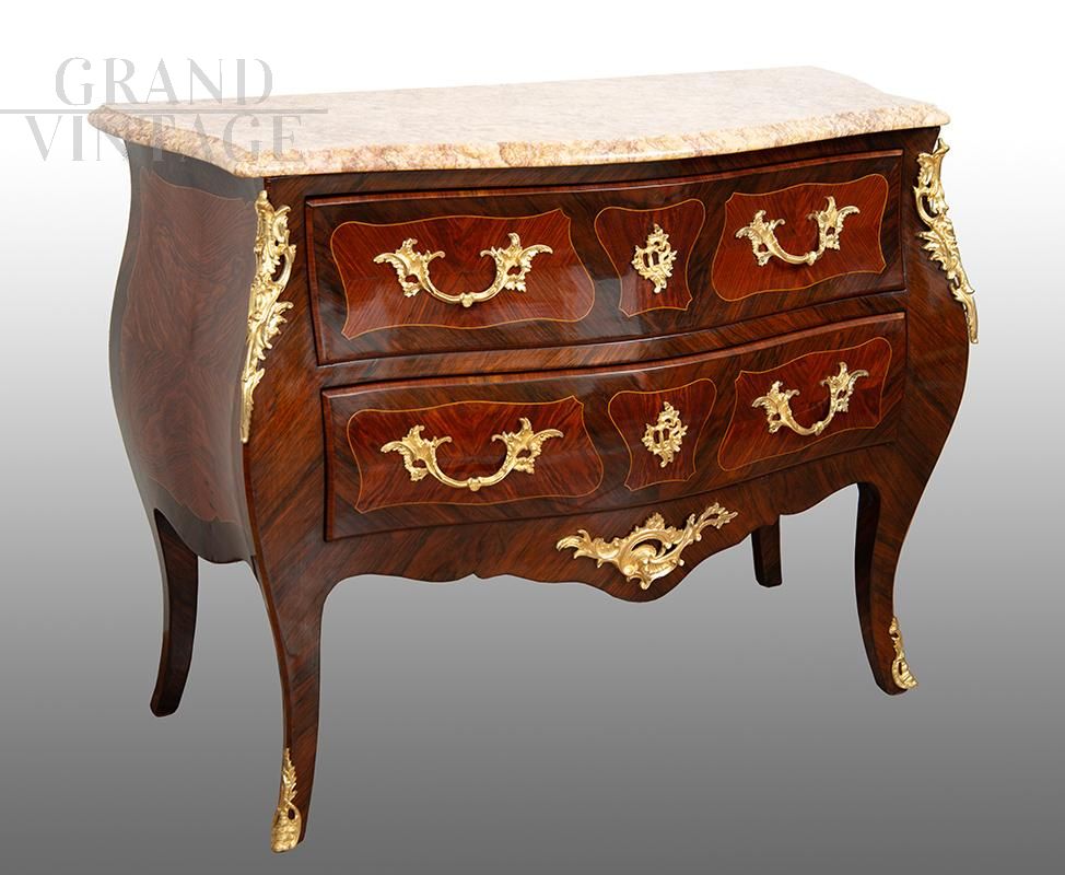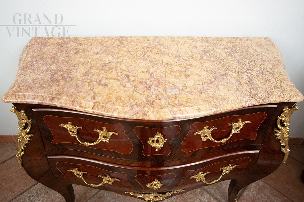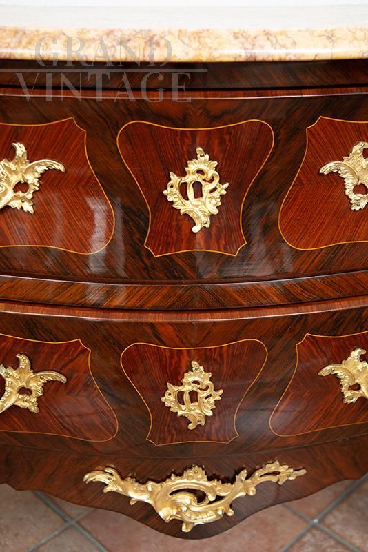 Antique Napoleon III chest of drawers in precious exotic woods with marble top