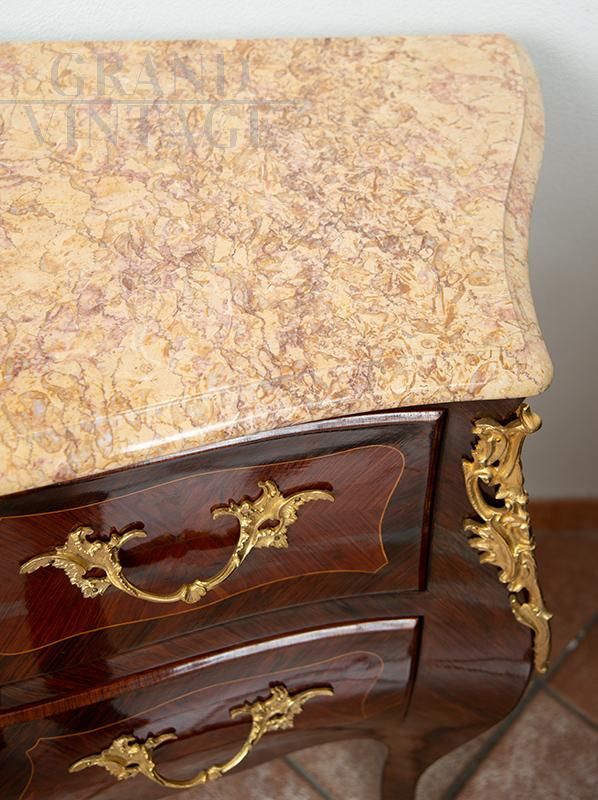 French Napoleon III chest of drawers in precious exotic woods with Siena yellow marble top. The front has two drawers inlaid with a geometric motif that can be opened thanks to finely chiselled gilt bronze handles. The sides have a convex shape with an accentuated indentation, and have the same inlay as the front. The two corners are embellished with bronze elements with a leaf motif and end with skilfully chiseled bronze tips.