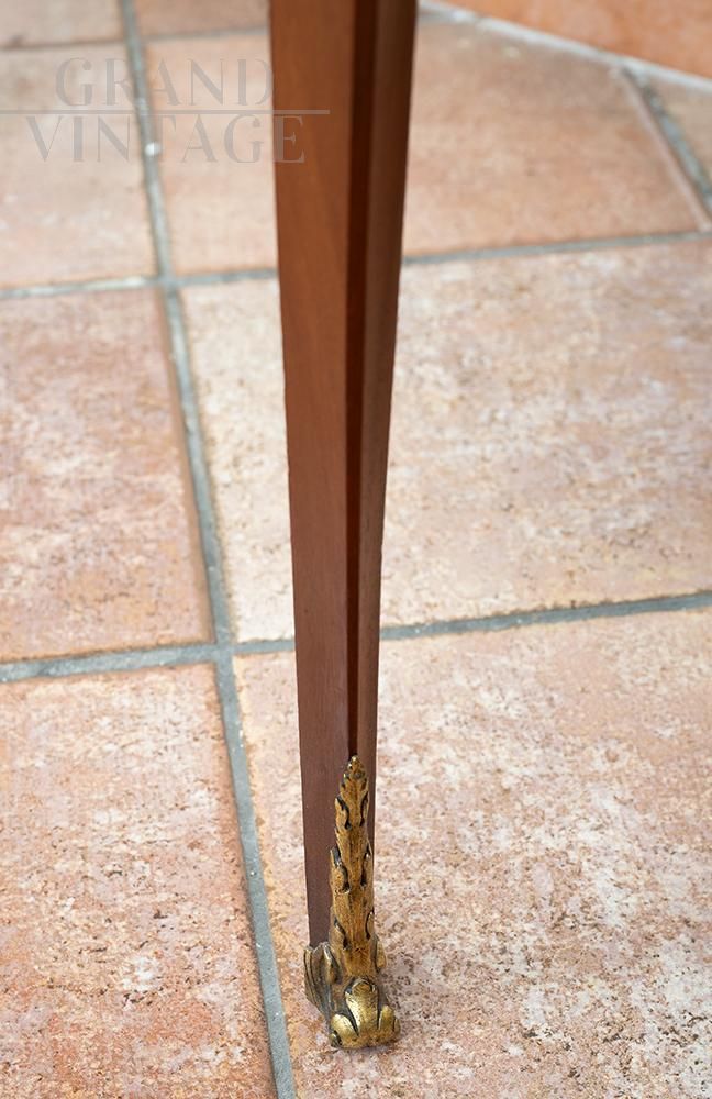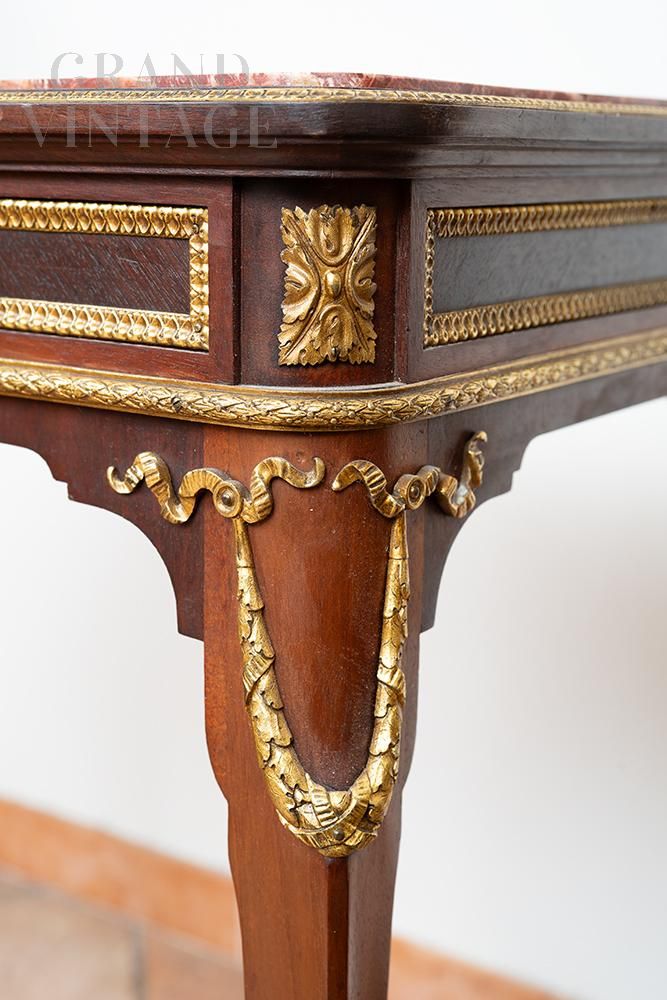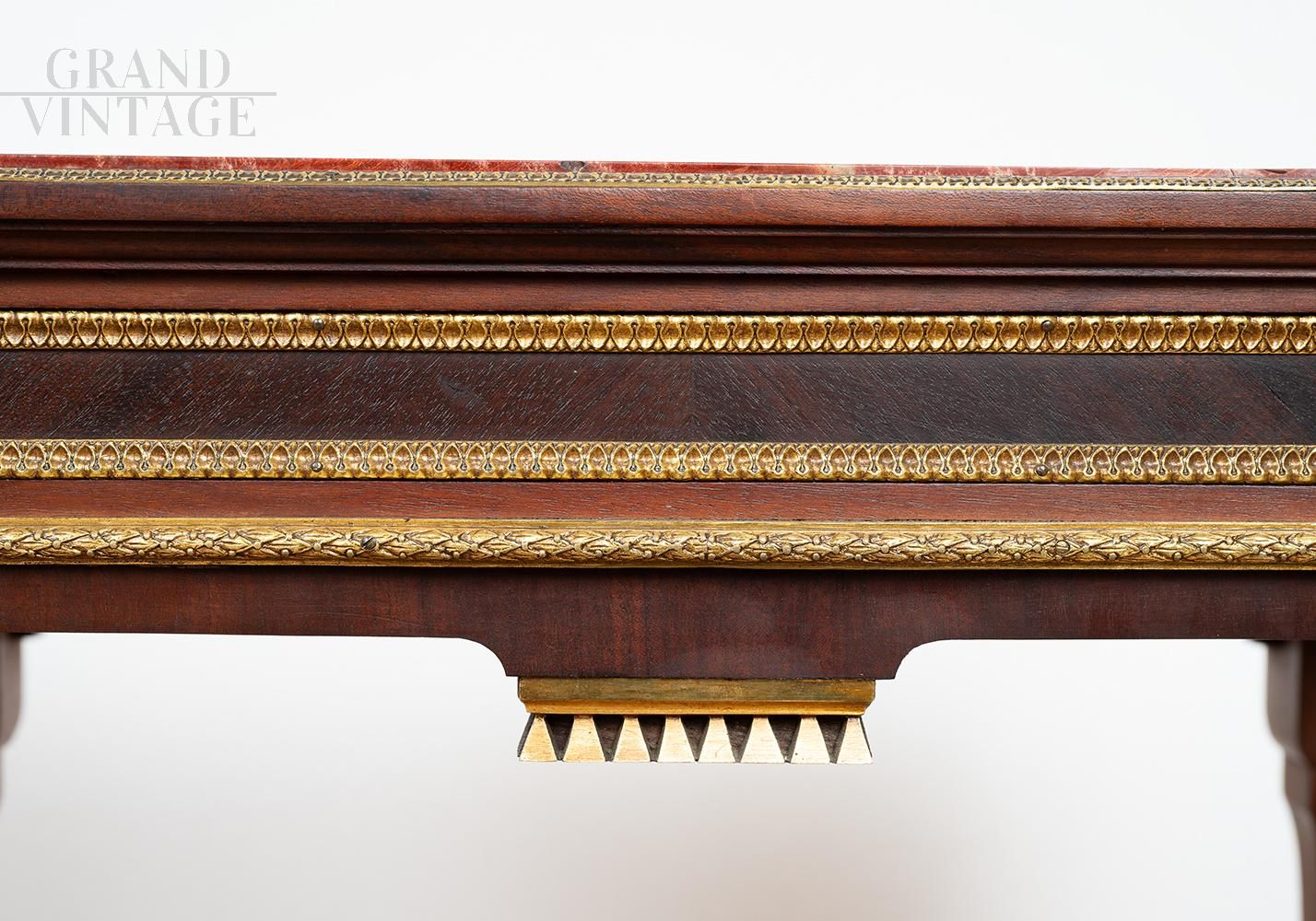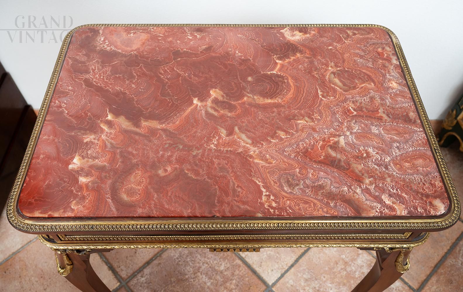 Antique French Napoleon III side table in solid mahogany with Sicilian red jasper marble top. The marble top is surrounded by a finely chiseled gilded bronze fitting. The four cabriolet feet are enriched with a garland on the upper part and bronze socks on the lower part. The band under the top is enriched by a dense, finely chiseled gilded bronze fitting.