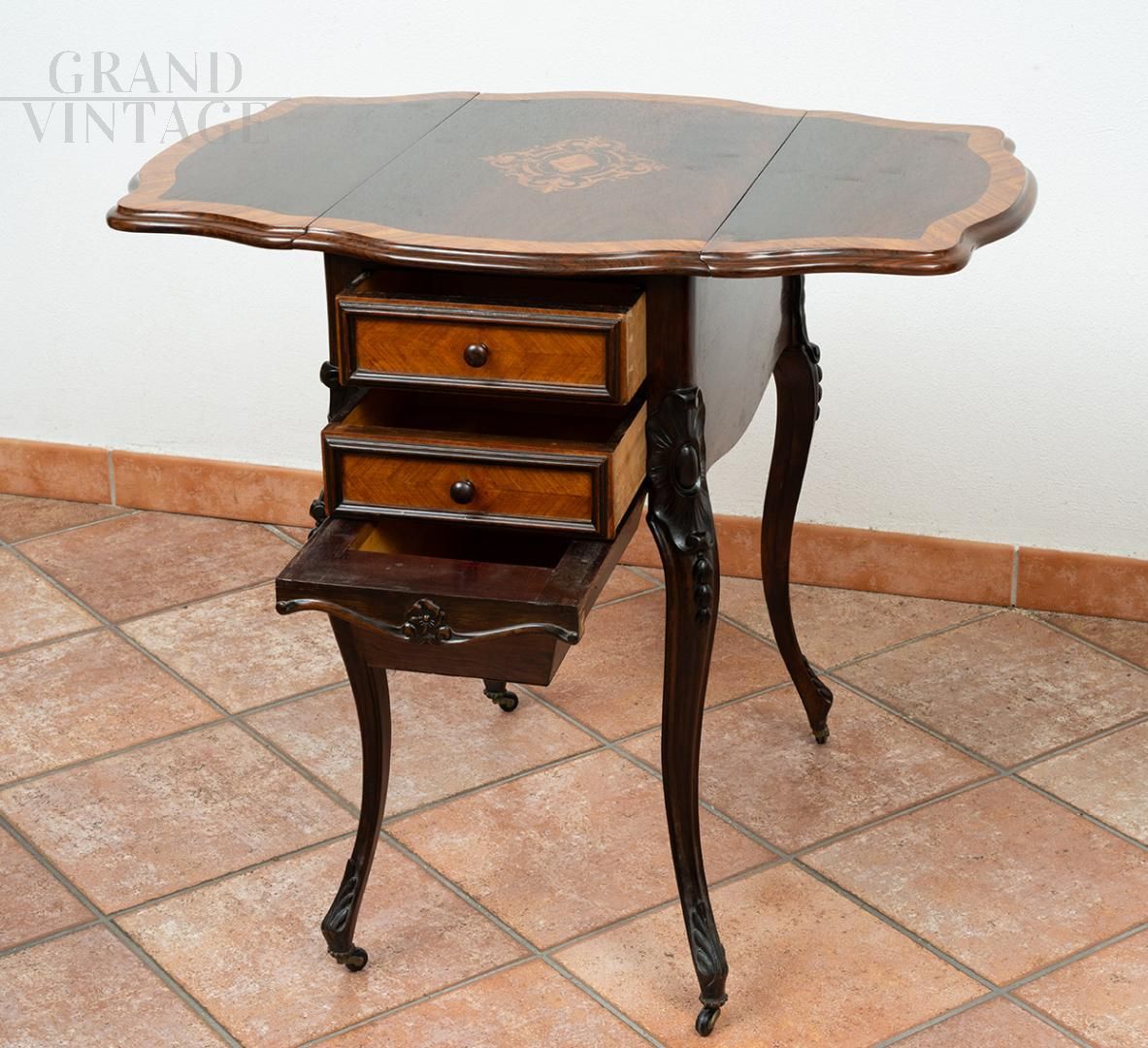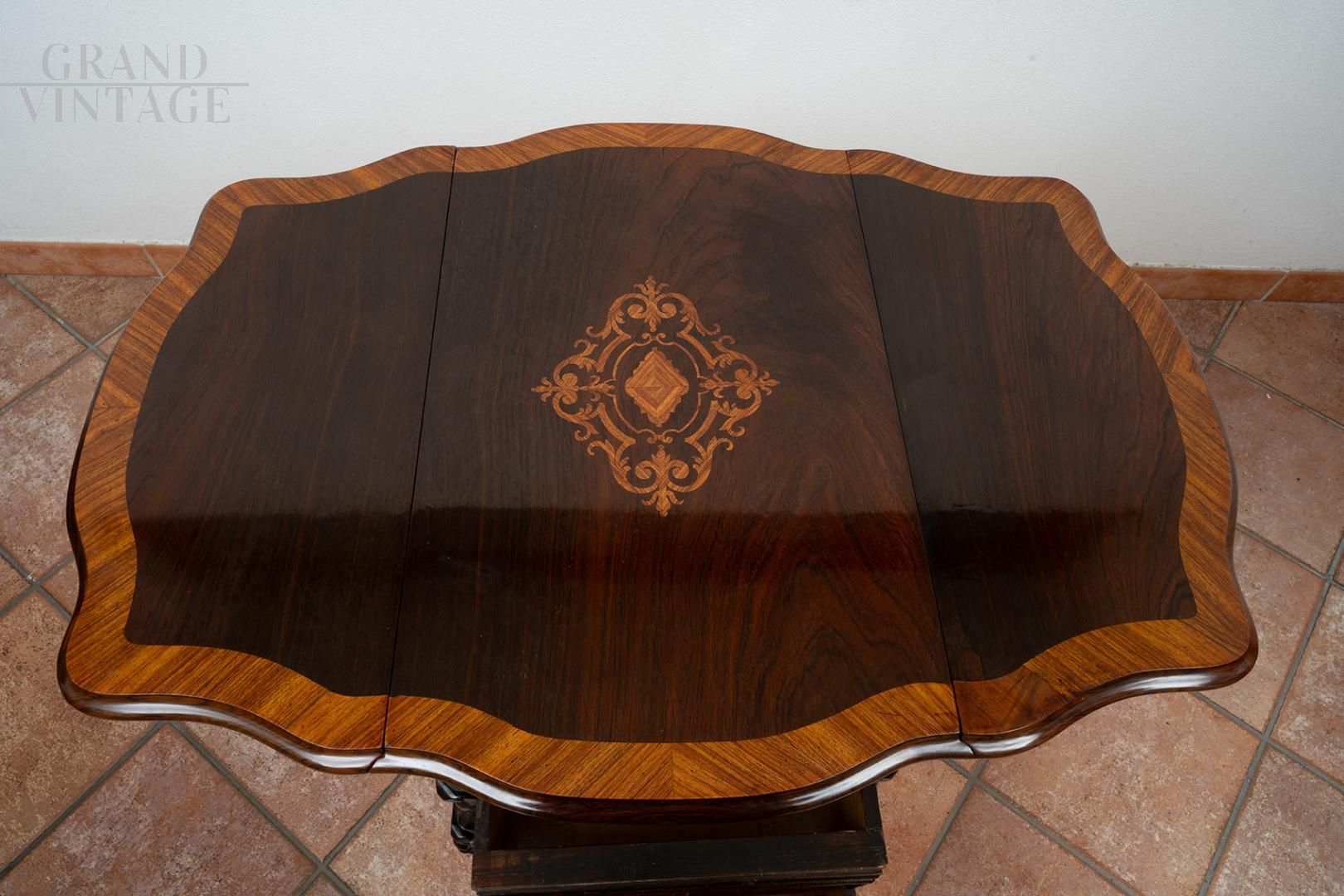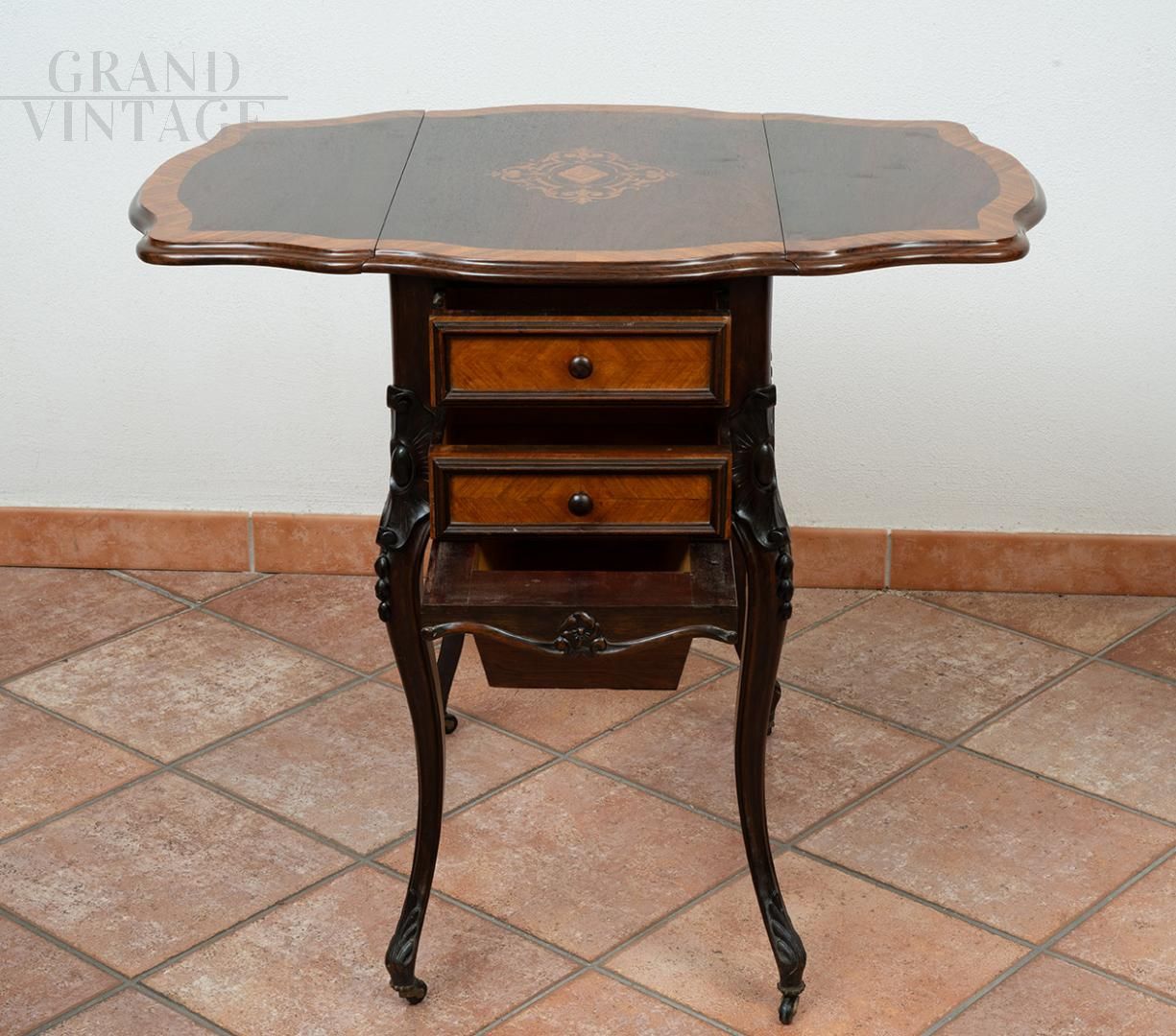 French Napoleon III sewing table in precious exotic woods belonging to the second half of the 19th century. The top has a curvilinear shape with a beautiful geometric pattern inlay in the center. The undertop band encloses two drawers with ball holders on one side and a drop-down door on the other. The four feet have a cabriolet shape and end with contemporary wheels. Conditions: Excellent condition. Provenance: 19th century France.