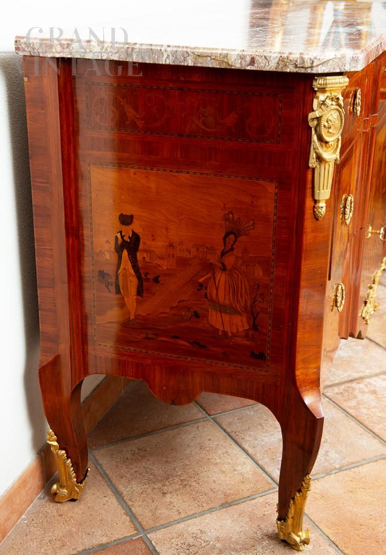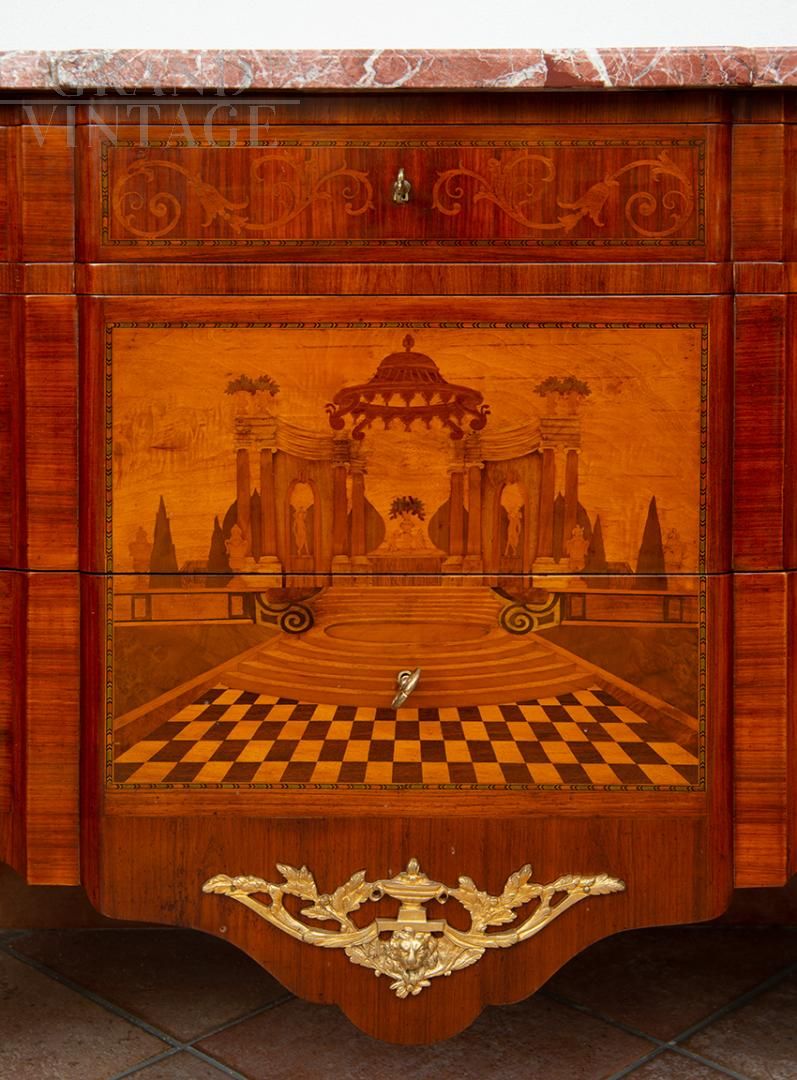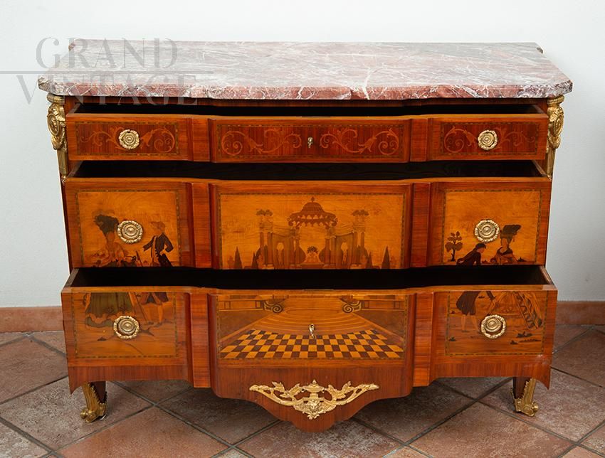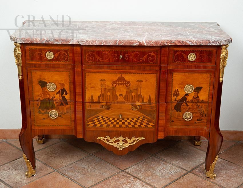 Antique French chest of drawers with two and a half drawers, with veneered structure in exotic woods and inlaid with precious wood essences, surmounted by a coeval marble top. The front is punctuated by two large drawers and a smaller one, arranged on three tracks, all graphically underlined by two thread turns. A beautiful internally inlaid reserve frames the two large drawers with a beautiful medallion in the center depicting an architecture in perspective, surrounded by two gallant scenes with ladies. The band under the top is enriched by a dense inlay with a motif of racemes and flowers. Laterally it shows the same layout as the front with scenes with knights and ladies in the center. Typical cabriolet feet are embellished with skilfully chiseled gilded bronze socks.